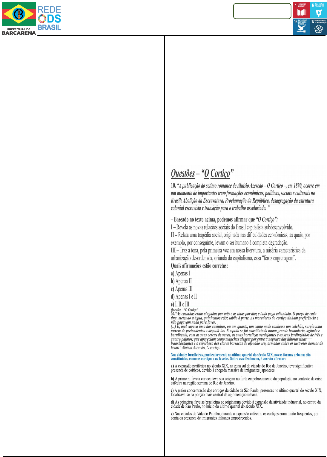 <p>AULÃO INTERDISCIPLINAR</p><p>GEOGRAFIA</p><p>2024</p><p>Cursinho Pré-ENEM</p><p>Aula 01 – Escrever aqui o nome do assunto – Disciplina - Cursinho Pré-ENEM Municipal – Prof.: fulano</p><p>1. Leia com atenção o texto abaixo:</p><p>“ Um cortiço ! Exclamava ele possesso,um cortiço ! Maldito seja aquele vendeiro de todos os diabos !Fazer-me um cortiço debaixo das janelas !....Estragou-me a casa, o malvado. (...) Noventa e cinco casinhas comportou a imagem da estalagem (...)E naquela terra encharcada e fumegante (...) começou a minhocar, a esfervilhar, a crescer, um mundo, uma coisa viva (...) que parecia brotar espontânea (...)naquele lameiro..(...)Durante dois anos o cortiço prosperou (...) ganhando forças, socando-se de gente.....”</p><p>AZEVEDO,Aluísio. O Cortiço. 3ª ed.São Paulo:Ática.1975.p 20/21</p><p>A partir da leitura e dos conhecimentos sobre a realidade urbana brasileira é verdadeiro afirmar que:</p><p>A) na maioria da médias e grandes cidades brasileiras o problema “moradia” faz-se presente de maneira intensa, principalmente entre as classes menos favorecidas, fato que está relacionado em grande parte a pouca eficiência e baixos investimentos das políticas públicas no setor habitacional.</p><p>B) o fato ao qual refere-se o texto é mais intenso nos centros urbanos de pequena magnitude, haja vista que os problemas habitacionais nas grandes metrópoles foram praticamente resolvidos com a construção de conjuntos populares destinados às classes pobres.</p><p>C) nos dias atuais, as moradias como as relatadas no texto foram substituídas por ocupações irregulares( invasões), em sua maioria na periferia das cidades, apresentando uma infra estrutura urbana adequada, sendo áreas saneadas e com boas condições de moradia.</p><p>D) os cortiços são formas de habitação coletiva, cujos moradores são de baixa renda, que optaram por este tipo de moradia para fugir de problemas como a violência e poluição, sendo portanto uma auto-segregação espacial.</p><p>“Eram cinco horas da manhã e o cortiço acordava, abrindo, não os olhos, mas a sua infinidade de portas e janelas alinhadas”.</p><p>2-Trecho da obra “O Cortiço”. AZEVEDO, Aluísio. São Paulo: Ática, 2011. (Série Bom Livro). p. 38</p><p>Sobre O processo de urbanização no Brasil, é correto afirmar:</p><p>I - A indústria foi um instrumento de povoamento, a partir da década de 1930, o país começou a industrializar-se, como o trabalho no campo era duro e a mecanização já provocava perda de postos de trabalho, grande parte dos trabalhadores rurais foram atraídos para as cidades com intuito de trabalhar no mercado industrial que crescia</p><p>II - Cortiço são casas cujos cômodos são alugados, servindo cada um deles como habitação para uma família. As instalações sanitárias são comuns. Geralmente ocupados por famílias de baixa renda, os cortiços são chamados tecnicamente de "habitações coletivas precárias de aluguel"</p><p>III - A partir dos anos 1990, as políticas de isenção de impostos e doação de terrenos feitas por estados e municípios acabaram atraindo as empresas para diferentes regiões, principalmente na Zona rural, provocando um êxodo urbano.</p><p>IV - No Brasil, a urbanização ocorrida a partir do século XX foi muito acelerada. Entre 1960 e 2010, a proporção de brasileiros vivendo em cidades passou de 44% para 84%. Esse processo de urbanização promoveu uma política de planejamento urbano nas cidades brasileiras que se tornou exemplo pelo mundo, como é o caso do transporte público em Curitiba.</p><p>A) I e II</p><p>B) I e III</p><p>C) I e IV</p><p>D) II e IV</p><p>E) III e IV</p><p>5- Grandes projetos urbanos de “revitalização” acontecem em todo o mundo, mas um caso que facilita o entendimento é a cidade norte-americana de Boston, em Massachusetts, onde houve duas camadas de valorização. A primeira foi na década de 1950, quando uma rodovia atravessou a cidade e toda a parte central foi ocupada por trabalhadores. No final dos anos 1990, outra intervenção: a rodovia passou a ser subterrânea. A antiga estrutura se transformou em parques, novas habitações, comércios e serviços, mudando a dinâmica e a composição populacional.</p><p>As transformações do espaço urbano, citadas no excerto caracterizam o processo de</p><p>A) gentrificação.</p><p>B) conurbação.</p><p>C) favelização.</p><p>D) verticalização.</p><p>E) metropolização.</p><p>6- No século XIX, o preço mais alto dos terrenos situados no centro das cidades é causa da especialização dos bairros e de sua diferenciação social. Muitas pessoas, que não têm meios de pagar os altos aluguéis dos bairros elegantes, são progressivamente rejeitadas para a periferia, como os subúrbios e os bairros mais afastados.</p><p>Uma consequência geográfica do processo espacial descrito no texto é a:</p><p>a) criação de condomínios fechados de moradia.</p><p>b) decadência das áreas centrais de comércio popular.</p><p>c) aceleração do processo conhecido como cercamento.</p><p>d) ampliação do tempo de deslocamento diário da população.</p><p>e) contenção da ocupação de espaços sem infraestrutura satisfatória.</p><p>7- A configuração do espaço urbano da região do Entorno do Distrito Federal assemelha-se às demais aglomerações urbanas e regiões metropolitanas do país, onde é facilmente identificável a constituição de um centro dinâmico e desenvolvido, onde se concentram as oportunidades de trabalho e os principais serviços, e a constituição de uma região periférica concentradora de população de baixa renda, com acesso restrito às principais atividades com capacidade de acumulação e produtividade, e aos serviços sociais e infraestrutura básica.</p><p>A organização interna do aglomerado urbano descrito é resultado da ocorrência do processo de</p><p>a) expansão vertical.</p><p>b) polarização nacional.</p><p>c) e