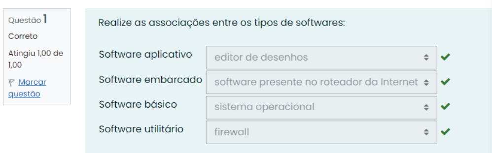 <p>Questão 1 Realize as associações entre os tipos de softwares: Correto Atingiu 1,00 de Software aplicativo editor de desenhos 1,00 P Marcar Software embarcado software presente no roteador da Internet questão Software básico sistema operacional Software utilitário firewall</p>