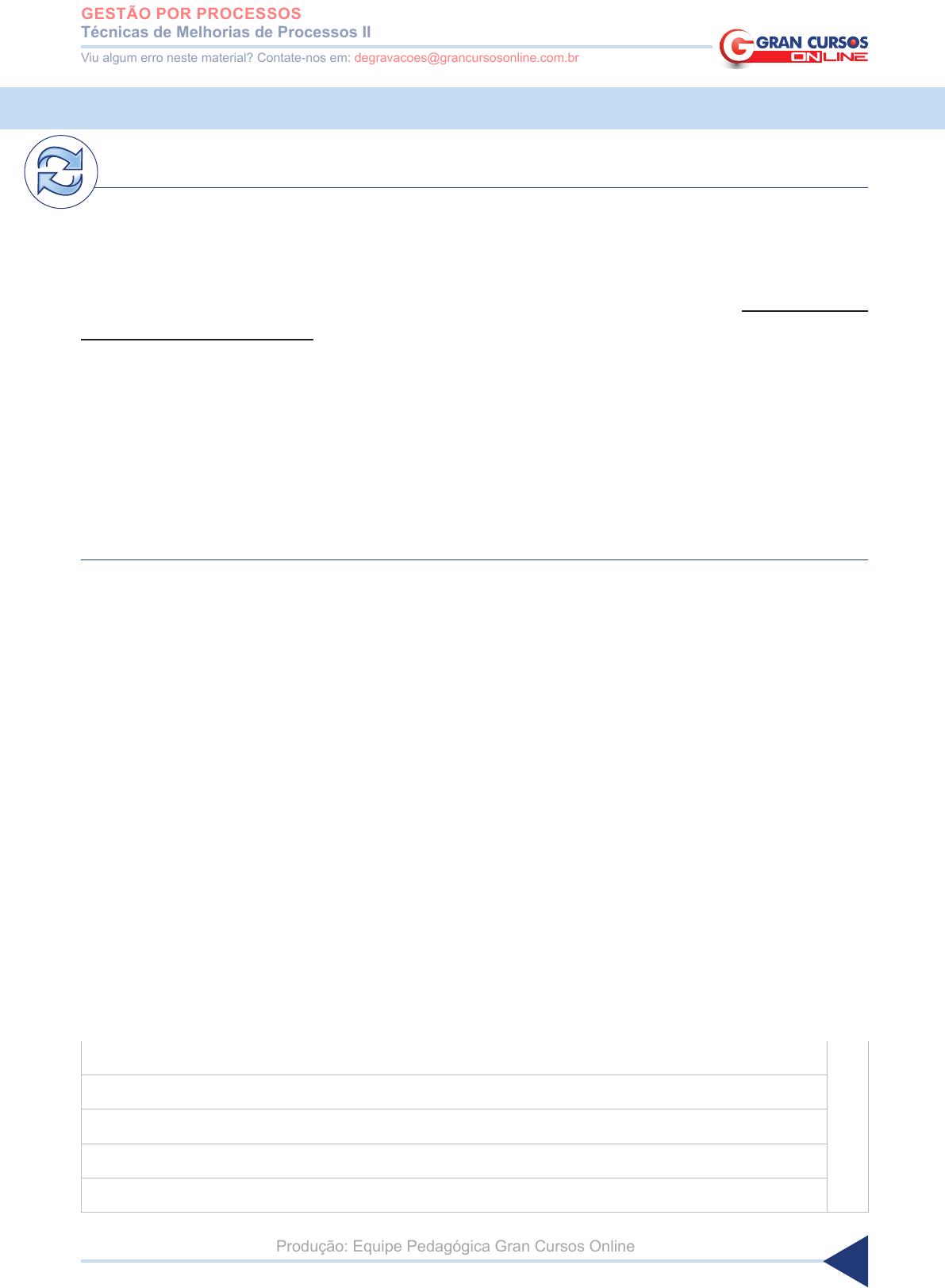 <p>1</p><p>www.grancursosonline.com.br</p><p>AN</p><p>O</p><p>TAÇ</p><p>Õ</p><p>ES</p><p>Técnicas de Melhorias de Processos II</p><p>GESTÃO POR PROCESSOS</p><p>Viu algum erro neste material? Contate-nos em: degravacoes@grancursosonline.com.br</p><p>Produção: Equipe Pedagógica Gran Cursos Online</p><p>TÉCNICAS DE MELHORIAS DE PROCESSOS II</p><p>Relembrando!</p><p>TÉCNICAS DE MELHORIAS DE PROCESSOS</p><p>As técnicas de melhoria partem do processo existente para melhorá-lo</p><p>mediante intervenções. Elas não são excludentes uma da outra, podendo ser</p><p>abordadas em conjunto. São elas:</p><p>• Lean management;</p><p>• Melhoria Contínua;</p><p>• TQM – Total Quality Management;</p><p>• Benchmarking;</p><p>• Seis sigma;</p><p>• ABC e ABM;</p><p>• Modelo de melhoria de desempenho.</p><p>TQM – TOTAL QUALITY MANAGEMENT</p><p>• “Gerenciamento da Qualidade Total”.</p><p>• A qualidade total surge como consequência da aplicação da melhoria con-</p><p>tínua nas organizações.</p><p>• Em sua essência, é um programa de melhoria contínua que engloba toda a</p><p>organização em todos os seus aspectos, incluindo desde o nível operacio-</p><p>nal e administrativo até a cúpula estratégica da organização.</p><p>• “Gerenciamento da Qualidade Total” (TQM – Total Quality Management)</p><p>é um conjunto de práticas, ao longo da organização, para garantir que a</p><p>organização consistentemente satisfaça ou exceda os requisitos do cliente.</p><p>• TQM coloca forte ênfase em medição e controles de processo como um</p><p>meio para melhoria contínua. Assim, produz-se melhor, no intuito de se</p><p>satisfazer as necessidades dos clientes.</p><p>2</p><p>www.grancursosonline.com.br</p><p>AN</p><p>O</p><p>TA</p><p>Ç</p><p>Õ</p><p>ES</p><p>Técnicas de Melhorias de Processos II</p><p>GESTÃO POR PROCESSOS</p><p>Viu algum erro neste material? Contate-nos em: degravacoes@grancursosonline.com.br</p><p>Produção: Equipe Pedagógica Gran Cursos Online</p><p>• A análise estatística é utilizada para monitorar o comportamento de pro-</p><p>cesso e identificar defeitos e oportunidades de melhoria. TQM é conside-</p><p>rado um precursor do “Six Sigma”.</p><p>TQM – Total Quality Management – Processo</p><p>Sendo abordagens incrementalistas baseadas uma na outra, tanto a melhoria</p><p>contínua quanto a qualidade total seguem o seguinte processo contínuo:</p><p>1. Escolha de uma área de melhoria</p><p>Nessa etapa, serão definidas as áreas que passarão pelo processo de melhoria.</p><p>2. Definição da equipe de trabalho que tratará da melhoria</p><p>• Etapa importante, dado que a ênfase desses processos está na melhoria</p><p>baseada nas equipes.</p><p>3</p><p>www.grancursosonline.com.br</p><p>AN</p><p>O</p><p>TAÇ</p><p>Õ</p><p>ES</p><p>Técnicas de Melhorias de Processos II</p><p>GESTÃO POR PROCESSOS</p><p>Viu algum erro neste material? Contate-nos em: degravacoes@grancursosonline.com.br</p><p>Produção: Equipe Pedagógica Gran Cursos Online</p><p>• A qualidade total é um conceito que está baseado nos grupos de trabalho e</p><p>considera a necessidade de empoderamento (empowerment) das pessoas</p><p>para que elas possam realmente decidir como melhorar as diversas ques-</p><p>tões organizacionais.</p><p>• Como o TQM é justamente um programa que busca uma determinada área</p><p>para promover uma melhoria contínua, e essa melhoria contínua deve ser</p><p>operacionalizada por uma equipe de trabalho, tal equipe deve estar empo-</p><p>derada suficientemente para implementar as melhorias.</p><p>3. Identificação de Benchmark’s</p><p>Benchmark’s são padrões de comparação e excelência que a organização</p><p>pode utilizar como referência para os seus próprios processos. Ele pode ser</p><p>interno (quando se utiliza um processo da mesma organização como referência)</p><p>ou externo (quando o processo referência está fora da organização). Existem</p><p>ainda outras classificações que, posteriormente serão, estudadas.</p><p>4. Análise do método atual</p><p>Nessa etapa, a equipe de trabalho analisa os métodos utilizados na área a</p><p>ser melhorada e identifica como eles podem ser melhorados para alcançarem ou</p><p>superarem o benchmark estabelecido.</p><p>5. Estudo piloto de melhoria</p><p>A equipe desenvolve um piloto sobre a proposta de melhoria e testa sua rela-</p><p>ção custo versus benefício para verificar se ela deve ser implementada. É uma</p><p>avaliação da viabilidade de implementação de uma melhoria testada pelo piloto.</p><p>4</p><p>www.grancursosonline.com.br</p><p>AN</p><p>O</p><p>TA</p><p>Ç</p><p>Õ</p><p>ES</p><p>Técnicas de Melhorias de Processos II</p><p>GESTÃO POR PROCESSOS</p><p>Viu algum erro neste material? Contate-nos em: degravacoes@grancursosonline.com.br</p><p>Produção: Equipe Pedagógica Gran Cursos Online</p><p>6. Implementação da melhoria</p><p>Nessa etapa, a equipe de trabalho propõe a melhoria a ser implementada, e a</p><p>direção assegura sua implementação, fortalecendo a competitividade da organiza-</p><p>ção e aumentando a motivação das pessoas que trabalham no processo de melhoria.</p><p>TQM – Total Quality Management – Elementos</p><p>Buscando entender os vários conceitos que fazem parte da qualidade total,</p><p>Miguel (2005) fez um apanhado dos vários elementos do TQM, segundo diferen-</p><p>tes autores.</p><p>• Para que haja sucesso na implementação dessas melhorias com a técnica</p><p>de TQM, é necessário o apoio da alta administração e da liderança.</p><p>• O foco deve ser os clientes, a partir de canais de comunicação.</p><p>• É preciso aplicar recursos mínimos dos Recursos Humanos, é necessário</p><p>empoderar as pessoas, a fim de que elas se sintam capazes de realizar as</p><p>implementações necessárias.</p><p>• Também, são relevantes práticas de seleção e qualificação de fornecedo-