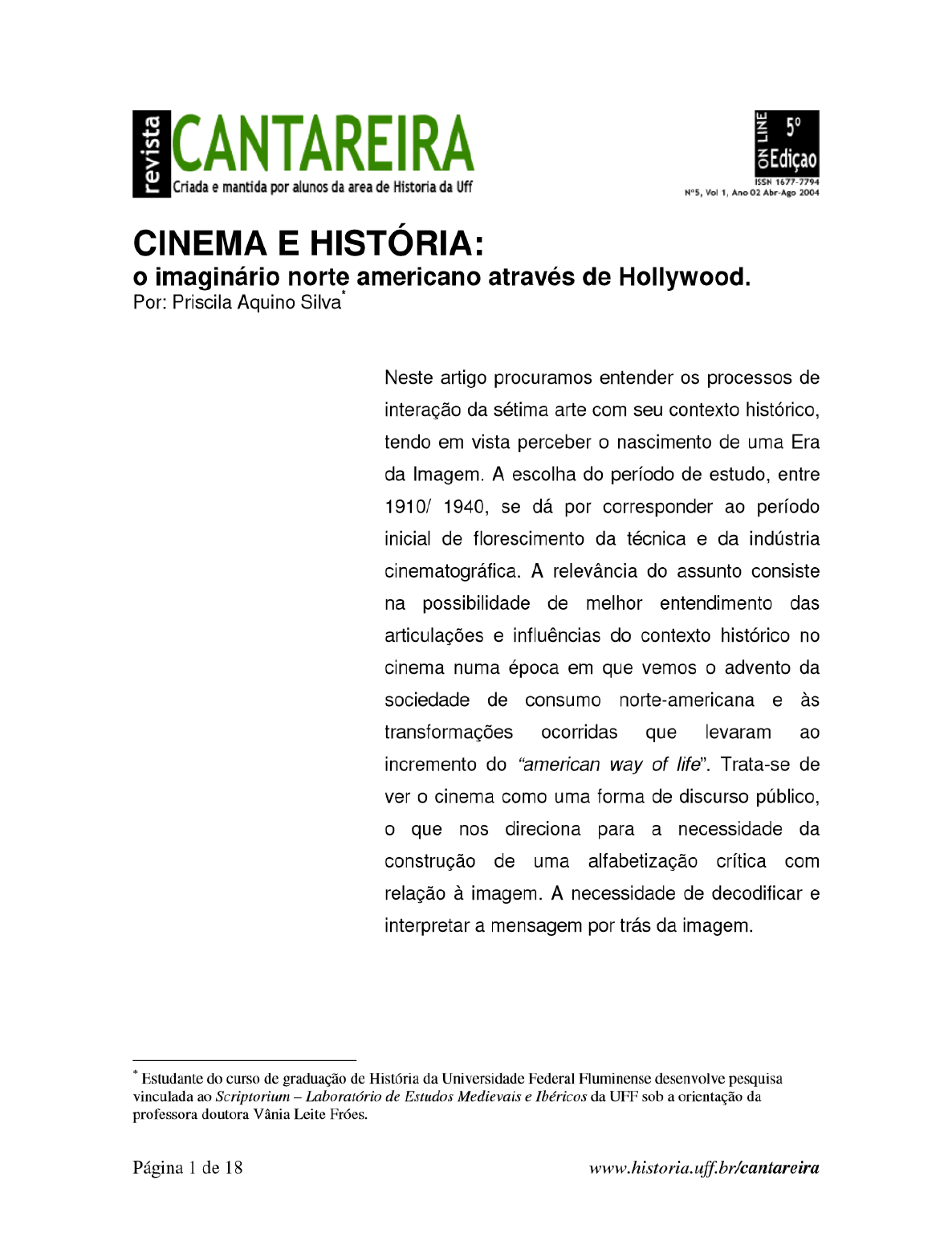 <p>CANTAREIRA Criada e mantida por alunos da area de Historia da Uff ISSN 1677-7794 Vol Ano 02 Abr-Ago 2004 CINEMA E HISTÓRIA: o imaginário norte americano através de Hollywood. Por: Priscila Aquino Neste artigo procuramos entender os processos de interação da sétima arte com seu contexto histórico, tendo em vista perceber o nascimento de uma Era da Imagem. A escolha do período de estudo, entre 1910/ 1940, se dá por corresponder ao período inicial de florescimento da técnica e da indústria cinematográfica. A relevância do assunto consiste na possibilidade de melhor entendimento das articulações e influências do contexto histórico no cinema numa época em que vemos o advento da sociedade de consumo norte-americana e às transformações ocorridas que levaram ao incremento do "american way of Trata-se de ver o cinema como uma forma de discurso público, o que nos direciona para a necessidade da construção de uma alfabetização crítica com relação à imagem. A necessidade de decodificar e interpretar a mensagem por trás da imagem. * Estudante do curso de graduação de História da Universidade Federal Fluminense desenvolve pesquisa vinculada ao Scriptorium Laboratório de Estudos Medievais e Ibéricos da UFF sob a orientação da professora doutora Leite Página 1 de 18</p><p>Cinema: Indústria ou Arte? chama Gramsci, ao lançarmos nosso A historiografia durante muito olhar para o fordismo; a questão da tempo negou a legitimidade do filme construção da nação americana; a como documento histórico. Uma história Primeira Guerra Mundial e, como não de cunho positivista teimava em podia deixar de ser, o cinema como considerar o cinema como um válvula de escape e formador de uma instrumento de distorção do passado, nova mitologia e simbologia para aquela que quando não o falsificava, trivializava- época e para aquelas pessoas. Contudo, O. Somente a partir de 1970, com a antes de começar o estudo da sociedade "revolução francesa da em si, faz-se necessário esclarecer ou seja, com Escola dos Annales e a nossos pressupostos teóricos ao reformulação do conceito e dos métodos analisarmos as produções da História, é que a historiografia passou cinematográficas com as quais a encontrar no filme um importante canal trabalhamos. através do qual conseguiu apreender Em primeiro lugar gostaria de testemunhos da sociedade, de sua definir o tipo de conceito de ideologia mentalidade, de seus costumes e de sua que estamos nos imbuindo, já que o ideologia. Nosso objetivo de estudo campo que está sendo tratado aqui é nesse artigo, é justamente tentar, através justamente esse. Tentaremos, como do cinema, abrir uma janela que nos conceber a ideologia como permita entrar em contato com a representação do real, nunca o real em sociedade norte- americana do início do si e por ser uma representação ela não século XX - e assim empreender consegue abarcar a realidade em sua também análise do nascimento do plenitude, é sempre reducionista e cinema. Nesse sentido tentaremos formadora de estereótipos. Ou seja, desvelar o significado histórico de alguns consideramos o real sempre mais rico de filmes escolhidos por serem possibilidades e por isso ao lançarmos paradigmáticos. Esperamos esclarecer nosso olhar para o cinema e para sua questões concernentes ao advento de influência na sociedade norte- americana uma economia programática, como 2 DUBY, Georges, História social e ideologia das sociedades, in História: Novos Problemas. Rio de BURKE, Peter. A Escola dos Annales 1929- Janeiro: Francisco Alves, 1995. 1989. A Revolução Francesa da Historiografia. Editora Unesp,São Paulo. 1997. Página 2 de 18 www.historia.uff.br/cantareira</p><p>não o enxergaremos como reflexo estruturas sociais, políticas e fechado e cristalino desta. Assim, o econômicas - difundindo hábitos e cinema está para a sociedade americana costumes e influenciando a sociedade. tal qual a religião estava para a Insere-se no mundo da máquina como sociedade européia do século anterior, um instrumento de coerção moral mas ele representa um modelador do isso não o descaracteriza como arte. inconsciente coletivo -através de seus Segundo George Sadoul: "é impossível heróis, de suas sagas, de seu glamour, estudar a história do Cinema como arte, ele criou uma simbologia e uma forma de sem evocar os seus aspectos industriais. se relacionar com o público que conduz E a indústria é inseparável da sociedade, o receptor a internalização desse da sua economia, da sua técnica"4 E se significado. Tem uma missão civilizatória, o cinema é uma indústria o filme é uma narrando e atualizando o mito "América arte. Portanto, esse será o nosso olhar, para os americanos", estabelecendo um imbuídos desses pressupostos teóricos código de ética próprio e cumprido uma que tentaremos chegar à sociedade de função expansionista ao conquista novas consumo norte- americana e às fronteiras transformações ocorridas que levaram Porquanto, a pergunta que se faz ao incremento do "american way of life". mister, pois sua resposta norteará a No bojo dessa análise tentaremos nossa análise, é: afinal, o cinema é uma entender historicamente os primórdios do indústria maquiavélica que a mando da cinema, enquanto técnica e como essa burguesia controla a vida dos pobres nova forma de relação pode modificar trabalhadores, ou ele seria uma inocente radicalmente a percepção humana da obra de arte? Acreditamos que nem uma realidade. Portanto utilizaremos uma nem outra. Consideramos sim, o cinema análise profunda do discurso veiculado como arte, que tal qual a arte através da imagem sem as renascentista, precisa de um mecenas. E técnicas utilizadas para a construção como qualquer arte, é preciso historicizá- dessa imagem. la. Muitas vezes sua produção tem um quê de industrial; arregimentando em A construção de uma nação torno de si todo um complexo de 3 KEHL, Maria Rit