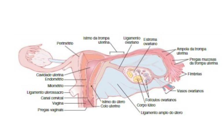 <p>PROBLEMA 1 –</p><p>1- Descrever a anatomia e fisiologia do aparelho reprodutivo feminino</p><p>2- Explicar o ciclo menstrual e a influência dos hormônios endógenos</p><p>3- Explicar a farmacodinâmica dos contraceptivos hormonais</p><p>4- Descrever o que é o mioma e como ele interfere na fertilidade feminina</p><p>5- Conhecer os métodos de reprodução assistida e sua regulamentação pelo CFM</p><p>6- Explicar a regulação do eixo hipotálamo-hipofise-ovarios</p><p>7- Descrever a ovogênese</p><p>1. Descrever Anatomia e Fisiologia do aparelho reprodutivo feminino</p><p>Os órgãos internos são o útero, os ovários, as tubas uterinas e a vagina.</p><p>Já os externos são o monte do púbis, os grandes lábios, os pequenos lábios e o clitóris.</p><p>Órgãos externos</p><p>Monte pubiano: massa de tecido subcutâneo adiposo, localizado anteriormente à sínfise púbica; coberta com uma camada triangular de pelos pubianos.</p><p>Lábios maiores do pudendo: dobras de pele, ricas em tecido adiposo; protegem e circundam o restante da vulva.</p><p>Lábios menores do pudendo: dobras da mucosa vaginal; delimitam a abertura da vagina e da uretra.</p><p>Clitóris: órgão que se projeta entre os pequenos lábios; apresenta corpos eréteis; ponto sensível do corpo da mulher, devido à grande quantidade de terminações nervosas.</p><p>Vestíbulo: entre os pequenos lábios; área perineal contém o orifício vaginal (óstio da vagina), a abertura da uretra feminina (óstio externo da uretra), o óstio dos ductos parauretrais e as aberturas dos ductos excretores das glândulas vestibulares maiores e menores.</p><p>Vulva: genitália externa.</p><p>Órgãos internos</p><p>Tubas uterinas (trompas de falópio): onde ocorre a fertilização; responsáveis por capturar o óvulo após a ovulação e transportá-lo para o útero. são compostas por três partes principais: a infundíbulo, o amplo e o ístmo. O infundíbulo é a parte alargada próximo ao ovário, e sua extremidade tem projeções em forma de dedos chamadas fímbrias, que ajudam a capturar o óvulo liberado durante a ovulação. A fertilização geralmente ocorre na ampola, a parte média da tuba, onde o óvulo pode encontrar um espermatozoide.</p><p>Além disso, as células ciliadas ao longo das tubas ajudam a transportar o óvulo fertilizado em direção ao útero. É importante notar que, em casos de obstrução ou danos às tubas uterinas, a fertilidade pode ser afetada, dificultando a ocorrência natural da gravidez. Portanto, a saúde e a funcionalidade das tubas uterinas são cruciais para o sucesso do processo reprodutivo feminino.</p><p>Útero: abriga o embrião durante a gravidez; composto por três camadas de tecido, endométrio (epitelial glandular), miométrio (camada muscular lisa, sem controle) e perimétrio (revestimento)</p><p>Vagina: órgão tubular e muscular canal de 8 a 10 cm, paredes elásticas, liga o colo do útero aos genitais externos; de cada lado de sua abertura, glândulas de Bartholin, que secretam um muco lubrificante. Anatomicamente, a vagina é constituída por tecidos musculares e membranas mucosas. Esse órgão também desempenha um papel importante na autolimpeza. As glândulas na parede vaginal produzem um muco que ajuda a manter a umidade e o equilíbrio bacteriano adequado, contribuindo para a saúde geral da região.</p><p>Ovários: Funções: produção de óvulos e regulação hormonal.gônadas femininas bilaterais; produzem os gametas e os hormônios femininos (estrogênio e progesterona); localizado em uma fossa ovariana da pelve verdadeira, adjacente ao útero e inferior a cada uma das tubas uterinas; na região cortical, localizam-se os folículos, conjunto formado pelo ovócito e pelas células que o envolvem. A parte mais interna do ovário é a região medular, que contém tecido conjuntivo frouxo com um rico leito vascular.</p><p>Folículos Primordiais: um ovócito envolvido por uma ou mais camadas de células foliculares, também chamadas de células da granulosa. A maioria desses folículos está “em repouso” – são folículos primordiais formados durante a vida fetal e que nunca sofreram nenhuma transformação.</p><p>Crescimento folicular: a partir da puberdade, a cada dia um pequeno grupo de folículos primordiais inicia um processo chamado de crescimento folicular, que compreende modificações do ovócito, das células foliculares e dos fibroblastos do estroma conjuntivo que envolve cada um desses folículos.</p><p>Atresia folicular: a maioria dos folículos ovarianos sofre um processo de involução denominado atrésia, por meio do qual as células foliculares e os ovócitos morrem e são eliminados por células fagocíticas. Folículos em qualquer fase de desenvolvimento (primordial, primário, pré-antral e antral) podem sofrer atresia.</p><p>Tubas Uterinas: tubos musculares que conduzem o óvulo até o útero, através dos cílios e de contrações peristálticas; onde ocorre a fecundação; subdividida em quatro partes:</p><p>- infundíbulo: parte distal da tuba uterina, se abre para a cavidade peritoneal através do óstio abdominal; contém projeções em formatos de dedos chamadas de fímbrias, que se estendem sobre a superfície medial dos ovários.</p><p>- ampola: parte mais longa e mais larga da tuba uterina; local mais comum de fertilização.</p><p>- istmo: parte mais estreita da tuba uterina</p><p>- porção uterina (na parede do útero): comunica diretamente com a cavidade uterina através do óstio uterino.</p><p>A parede da tuba uterina é composta de três camadas:</p><p>- mucosa: epitélio simples colunar com células ciliadas, possui pregas (vilosidades); aumento de superfície de contato e permite maior interação com os espermatozoides;</p><p>- muscular: músculo liso, movimento de propulsão do fluído tubário, movimento peristáltico, traslado de gametas e embriões;</p><p>- serosa: auxilia na nutrição do embrião e oferece ambiente prop