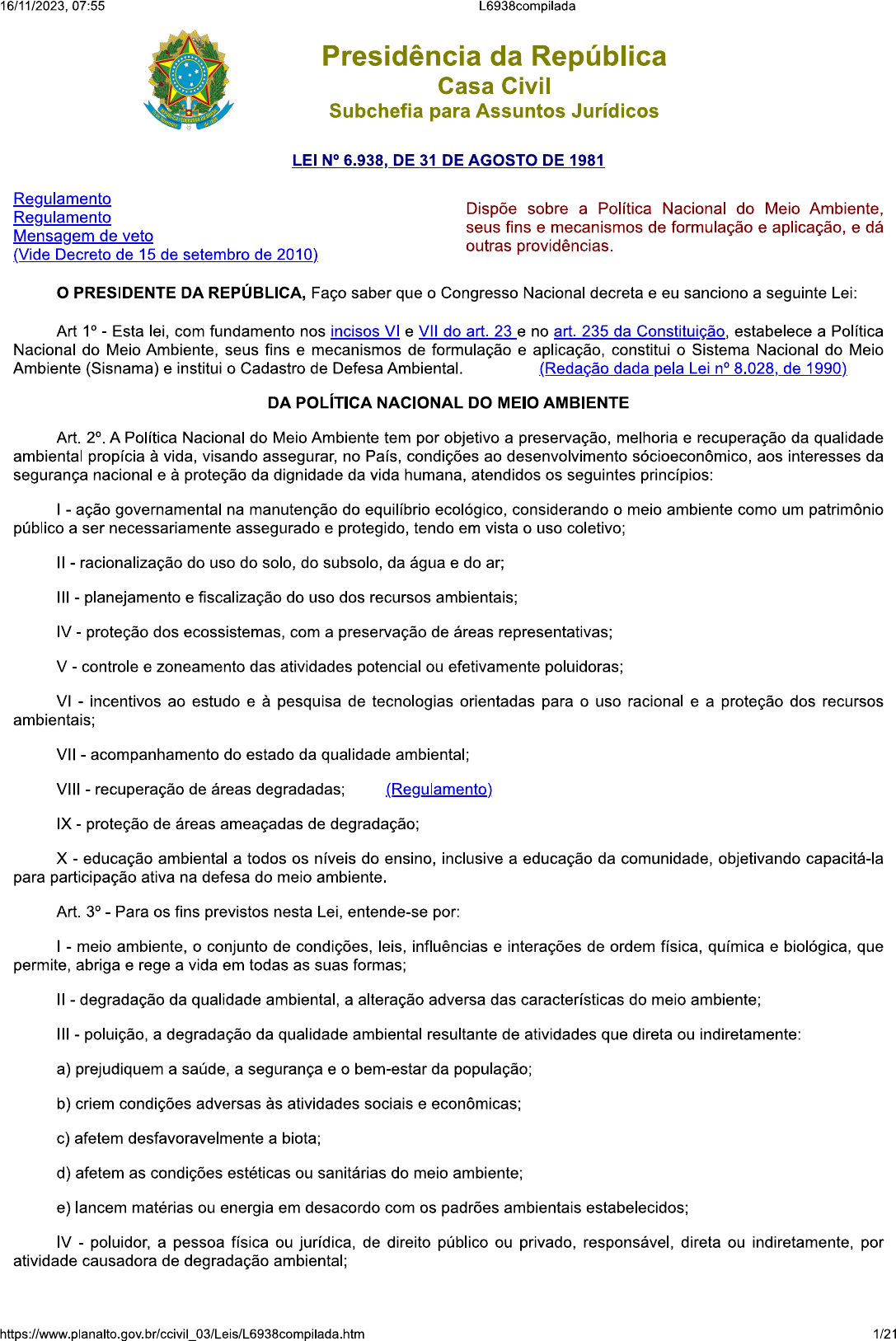 <p>16/11/2023, 07:55 L6938compilada Presidência da República Casa Civil Subchefia para Assuntos Jurídicos LEI N° 6.938, DE 31 DE AGOSTO DE 1981 Regulamento Dispõe sobre a Política Nacional do Meio Ambiente, Regulamento seus fins e mecanismos de formulação e aplicação, e dá Mensagem de veto outras providências. (Vide Decreto de 15 de setembro de 2010) o PRESIDENTE DA Faço saber que o Congresso Nacional decreta e eu sanciono a seguinte Lei: Art 1° Esta lei, com fundamento nos incisos VI e VII do art. 23 e no art. 235 da Constituição, estabelece a Política Nacional do Meio Ambiente, seus fins e mecanismos de formulação e aplicação, constitui o Sistema Nacional do Meio Ambiente (Sisnama) e institui o Cadastro de Defesa Ambiental. (Redação dada pela Lei 8.028, de DA POLÍTICA NACIONAL DO MEIO AMBIENTE Art. A Política Nacional do Meio Ambiente tem por objetivo a preservação, melhoria e recuperação da qualidade ambiental propícia à vida, visando assegurar, no País, condições ao desenvolvimento sócioeconômico, aos interesses da segurança nacional e à proteção da dignidade da vida humana, atendidos os seguintes princípios: ação governamental na manutenção do equilíbrio ecológico, considerando o meio ambiente como um patrimônio público a ser necessariamente assegurado e protegido, tendo em vista o uso coletivo; racionalização do uso do solo, do subsolo, da água e do ar; III planejamento e fiscalização do uso dos recursos ambientais; IV proteção dos ecossistemas, com a preservação de áreas representativas; V controle e zoneamento das atividades potencial ou efetivamente poluidoras; VI incentivos ao estudo e à pesquisa de tecnologias orientadas para o uso racional e a proteção dos recursos ambientais; VII acompanhamento do estado da qualidade ambiental; VIII - recuperação de áreas degradadas; (Regulamento) IX proteção de áreas ameaçadas de degradação; X educação ambiental a todos os níveis do ensino, inclusive a educação da comunidade, objetivando capacitá-la para participação ativa na defesa do meio ambiente. Art. 3° Para os fins previstos nesta Lei, entende-se por: - - meio ambiente, o conjunto de condições, leis, influências e interações de ordem física, química e biológica, que permite, abriga e rege a vida em todas as suas formas; degradação da qualidade ambiental, a alteração adversa das características do meio ambiente; III poluição, a degradação da qualidade ambiental resultante de atividades que direta ou indiretamente: a) prejudiquem a saúde, a segurança e o bem-estar da população; b) criem condições adversas às atividades sociais e econômicas; c) afetem desfavoravelmente a biota; d) afetem as condições estéticas ou sanitárias do meio ambiente; e) lancem matérias ou energia em desacordo com os padrões ambientais estabelecidos; IV poluidor, a pessoa física ou jurídica, de direito público ou privado, responsável, direta ou indiretamente, por atividade causadora de degradação ambiental; 1/21</p><p>16/11/2023. 07:55 L6938compilada V recursos ambientais: a atmosfera, as águas interiores, superficiais e subterrâneas, os estuários, o mar territorial, o solo, o subsolo, os elementos da biosfera, a fauna e a flora. (Redação dada pela Lei n° 7.804, de 1989) DOS OBJETIVOS DA POLÍTICA NACIONAL DO MEIO AMBIENTE Art. 4° A Política Nacional do Meio Ambiente visará: - à compatibilização do desenvolvimento econômico social com a preservação da qualidade do meio ambiente e do equilíbrio ecológico; à definição de áreas prioritárias de ação governamental relativa à qualidade e ao equilíbrio ecológico, atendendo aos interesses da União, dos Estados, do Distrito Federal, do Territórios e dos Municípios; (Vide decreto 5.975, de 2006) III ao estabelecimento de critérios e padrões da qualidade ambiental e de normas relativas ao uso e manejo de recursos ambientais; IV ao desenvolvimento de pesquisas e de tecnologia S nacionais orientadas para o uso racional de recursos ambientais; V - à difusão de tecnologias de manejo do meio ambiente, à divulgação de dados e informações ambientais e à formação de uma consciência pública sobre a necessidade de preservação da qualidade ambiental e do equilíbrio ecológico; VI à preservação e restauração dos recursos ambientais com vistas á sua utilização racional e disponibilidade permanente, concorrendo para a manutenção do equilíbrio ecológico propício à vida; VII à imposição, ao poluidor e ao predador, da obrigação de recuperar e/ou indenizar os danos causados, e ao usuário, de contribuição pela utilização de recursos ambientais com fins econômicos. Art. 5° As diretrizes da Política Nacional do Meio Ambiente serão formuladas em normas e planos, destinados a orientar a ação dos Governos da União, dos Estados, do Distrito Federal, dos Territórios e dos Municípios no que se relaciona com a preservação da qualidade ambiental e manutenção do equilíbrio ecológico, observados os princípios estabelecidos no art. 2° desta Lei. Parágrafo único. As atividades empresariais públicas ou privadas serão exercidas em consonância com as diretrizes da Política Nacional do Meio Ambiente. DO SISTEMA NACIONAL DO MEIO AMBIENTE Art. 6° Os órgãos e entidades da União, dos Estados, do Distrito Federal, dos Territórios e dos Municípios, bem como as fundações instituídas pelo Poder Público, responsáveis pela proteção e melhoria da qualidade ambiental, constituirão o Sistema Nacional do Meio Ambiente SISNAMA, assim estruturado: órgão superior: o Conselho de Governo, com a função de assessorar o Presidente da República na formulação da política nacional e nas diretrizes governamentais para o meio ambiente e os recursos ambientais; (Redação dada pela Lei n° 8.028, de 1990) órgão consultivo e deliberativo: o Conselho Nacional do Meio Ambiente (CONAMA), com a finalidade de asse