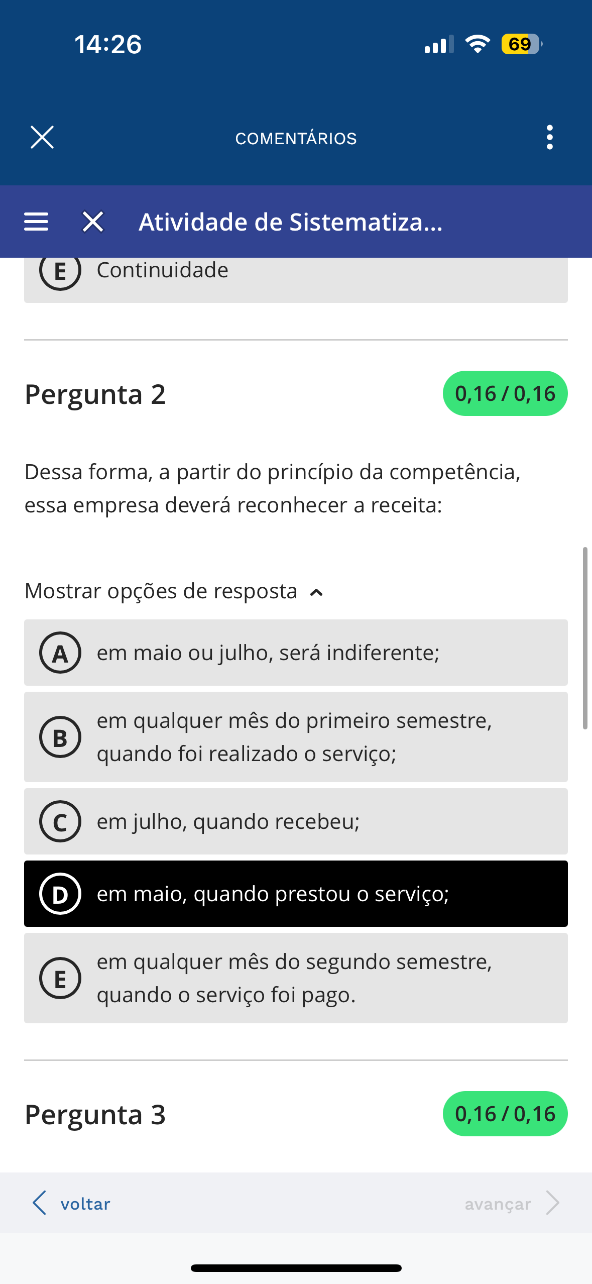<p>14:26 69 X COMENTÁRIOS X Atividade de Sistematiza... E Continuidade Pergunta 2 0,16/0,16 Dessa forma, a partir do princípio da competência, essa empresa deverá reconhecer a receita: Mostrar opções de resposta A em maio ou julho, será indiferente; em qualquer mês do primeiro semestre, B quando foi realizado o serviço; em julho, quando recebeu; D em maio, quando prestou O serviço; em qualquer mês do segundo semestre, E quando o serviço foi pago. Pergunta 3 0,16/0,16 < voltar avançar ></p>