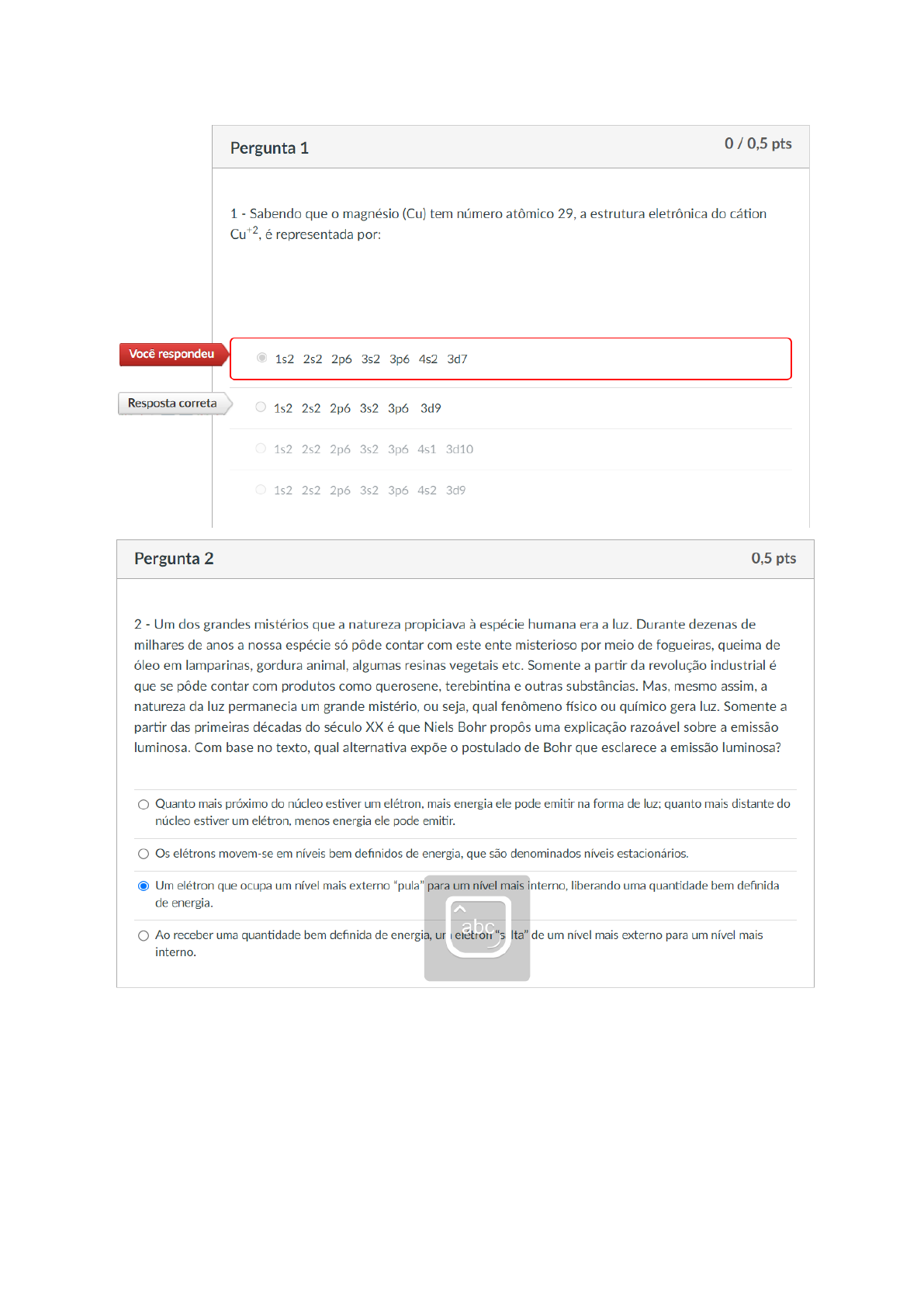 <p>Pergunta 1 0 / 0,5 pts 1 Sabendo que o magnésio (Cu) tem número atômico 29, a estrutura eletrônica do cátion é representada por: Você respondeu 1s2 2s2 2p6 3s2 3p6 4s2 3d7 Resposta correta 1s2 2s2 2p6 3s2 3p6 3d9 1s2 2s2 2p6 3s2 3p6 4s1 3d10 1s2 2s2 2p6 3s2 3p6 4s2 3d9 Pergunta 2 0,5 pts 2 - Um dos grandes mistérios que a natureza propiciava à espécie humana era a luz. Durante dezenas de milhares de anos a nossa espécie só pôde contar com este ente misterioso por meio de fogueiras, queima de óleo em lamparinas, gordura animal, algumas resinas vegetais etc. Somente a partir da revolução industrial é que se pôde contar com produtos como querosene, terebintina e outras substâncias. Mas, mesmo assim, a natureza da luz permanecia um grande mistério, ou seja, qual fenômeno físico ou químico gera luz. Somente a partir das primeiras décadas do século XX é que Niels Bohr propôs uma explicação razoável sobre a emissão luminosa. Com base no texto, qual alternativa expõe o postulado de Bohr que esclarece a emissão luminosa? Quanto mais próximo do núcleo estiver um elétron, mais energia ele pode emitir na forma de luz; quanto mais distante do núcleo estiver um elétron, menos energia ele pode emitir. Os elétrons movem-se em níveis bem definidos de energia, que são denominados níveis estacionários. Um elétron que ocupa um nível mais externo "pula" para um nível mais interno, liberando uma quantidade bem definida de energia. Ao receber uma quantidade bem definida de energia, un Ita" de um nível mais externo para um nível mais interno.</p><p>Pergunta 3 0 / 0,5 pts 3 - A representação 5s1 deve ser interpretada da seguinte maneira: Você respondeu nível S do quinto subnível apresenta 1 elétron. quinto subnível do primeiro nível apresenta S elétrons Resposta correta subnível S do quinto nível apresenta 1 elétron subnível S do primeiro nível apresenta 5 elétrons Pergunta 4 0,5 pts 4 - Coloque em ordem crescente de energia os subníveis: 4d 4f 5p 6s 5p 4d < 5p< 6s < 4f</p><p>Pergunta 5 0,5 pts 5 apresenta a configuração eletrônica para o último nível. número atômico do elemento Y é: 9 10 11 14 Pergunta 6 0,5 pts Pergunta 6 0,5 pts 6 - elemento cujo átomo tem o maior número de elétrons em sua camada mais externa é aquele cujo número atômico é: 4 11 7 12 Pergunta 7 0,5 pts 7 - As propriedades ductibilidade, maleabilidade, brilho e condutibilidade elétrica caracterizam: grafita e diamante cobre e prata cloreto de potássio e alumínio aço e PVC.</p><p>Pergunta 8 0,5 pts 8 - Um dos elementos químicos que tem se mostrado muiito eficiente no combate ao câncer de próstata é o selênio (Se). Com base na tabela de classificação periódica dos elementos, os símbolos de elementos com propriedades químicas semelhantes ao selênio são. As, Br, Kr P, As, Sb Br. Te, S, Po Pergunta 9 0,5 pts 9 - Das alternativas indicadas a seguir, qual é a constituída por elementos da tabela periódica com características químicas distintas? He, Ne, Li, Be, B F, Br Li, Na, K</p><p>Pergunta 10 0,5 pts 10 - De acordo com as propriedades periódicas dos elementos químicos, analise as proposições abaixo: - tamanho do raio atômico dos elementos químicos cresce da direita para esquerda nos períodos e cresce de cima para baixo nos grupos. II - tamanho do raio atômico dos elementos químicos cresce da esquerda para direita nos períodos, assim como a eletropositividade. III - O iodo apresenta raio atômico menor do que o cloro. IV - nitrogênio apresenta raio atômico maior do que o flúor. Analise a alternativa correta. Somente a afirmativa é verdadeira. Somente a afirmativa IV é verdade Somente as afirmativas e IV são verdadeiras Somente as afirmativas e IV são verdadeiras, Pergunta 11 0,5 pts 11 Em relação aos elementos oxigênio, fósforo e selênio, assinale (V) ou falsa (F) em cada uma das alternativas : ( ) o raio atômico do oxigênio é menor que o do selênio, pois o primeiro tem menor número de camadas eletrônicas. ( ) o oxigênio perde elétrons com mais facilidade que o selênio. ( ) oxigênio é mais eletronegativo que o fósforo. A sequência correta é: V-V-F F-F-V F-V-F</p><p>Pergunta 12 0,5 pts 12 As afirmativas a seguir estão relacionadas com os metais. Classifique-as como verdadeiras (V) ou falsas (F): I) cobre metálico é um bom condutor de eletricidade; II) A prata é porque apresenta elevada temperatura de ebulição; III) Todos os metais são sólidos em temperatura ambiente; IV) As partículas responsáveis pela condução de corrente elétrica no ferro são os ânions; V) Os elementos da família 1 da Tabela Periódica são todos metais. As afirmativas acima são respectivamente:</p><p>Pergunta 13 0,5 pts 13 A tabela periódica dos elementos permitiu a previsão de elementos até então Mendeleev chegou a fazer previsões (posteriormente confirmadas) das propriedades físicas e químicas de alguns elementos que vieram a ser descobertos mais tarde. Acerca disso, considere a seguinte tabela: Elemento A Elemento B Número atômico 5 14 (r/pm) 83 117 Energia de ionização 801 787 Eletronegatividade de Pauling 2,04 Dadas as propriedades dos elementos A e B, na tabela apresentada, seguindo o raciocínio de Mendeleev. assinale a alternativa correta sobre o elemento de número atômico 13. seu raio atômico é maior que 83 pm, porém menor que 117 pm. A sua energia de ionização é maior que 787 kJ mol-1. porém menor que 801 kJ mol-1 A sua eletronegatividade é maior que 2.04. seu raio atômico é maior que 117 pm. Pergunta 14 0,5 pts 14 Dadas as configurações eletrônicas dos seguintes átomos no seu estado fundamental: I. 1s2 2s2 2p6 3p6 II. 1s2 2s2 2p6 4s2 III. 2p6 3p6 4s1 IV. 1s2 2s2 2p6 3s2 3p5 É incorreto afirmar que: A perda de dois elétrons pelo átomo leva à formação do Ca2+ ganho de um elétron pelo átomo IV ocorre com a liberação de energia. Dentre os átomos o átomo III tem a maior afinidade ele