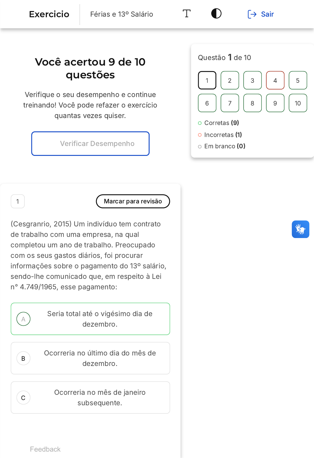 <p>Você acertou 9 de 10</p><p>questões</p><p>Verifique o seu desempenho e continue</p><p>treinando! Você pode refazer o exercício</p><p>quantas vezes quiser.</p><p>Verificar Desempenho</p><p>A</p><p>B</p><p>C</p><p>1 Marcar para revisão</p><p>�Cesgranrio, 2015� Um indivíduo tem contrato</p><p>de trabalho com uma empresa, na qual</p><p>completou um ano de trabalho. Preocupado</p><p>com os seus gastos diários, foi procurar</p><p>informações sobre o pagamento do 13º salário,</p><p>sendo-lhe comunicado que, em respeito à Lei</p><p>n° 4.749/1965, esse pagamento:</p><p>Seria total até o vigésimo dia de</p><p>dezembro.</p><p>Ocorreria no último dia do mês de</p><p>dezembro.</p><p>Ocorreria no mês de janeiro</p><p>subsequente.</p><p>Questão 1 de 10</p><p>Corretas �9�</p><p>Incorretas �1�</p><p>Em branco �0�</p><p>1 2 3 4 5</p><p>6 7 8 9 10</p><p>Feedback</p><p>Exercicio Férias e 13º Salário Sair</p><p>D</p><p>E</p><p>Seria parcial e ocorreria no mês de</p><p>dezembro.</p><p>Ocorreria em novembro na sua</p><p>totalidade.</p><p>Resposta correta</p><p>Parabéns, você selecionou a</p><p>alternativa correta. Confira o</p><p>gabarito comentado!</p><p>Gabarito Comentado</p><p>De acordo com a Lei n° 4.749/1965, o</p><p>pagamento do 13º salário deve ser</p><p>realizado até o vigésimo dia de dezembro.</p><p>Portanto, a alternativa correta é: "Seria</p><p>total até o vigésimo dia de dezembro". Esta</p><p>lei estabelece que o pagamento do 13º</p><p>salário deve ser feito em duas parcelas,</p><p>sendo a primeira entre os meses de</p><p>fevereiro e novembro e a segunda até o dia</p><p>20 de dezembro. Neste caso, como o</p><p>indivíduo já completou um ano de trabalho,</p><p>ele tem direito ao valor total do 13º salário,</p><p>que deve ser pago até a data estipulada</p><p>pela lei.</p><p>2 Marcar para revisão</p><p>�Cespe/Cebraspe, 2008� Assinale a opção</p><p>correta, a respeito de férias, contrato individual</p><p>de trabalho e trabalho noturno.</p><p>A</p><p>B</p><p>C</p><p>D</p><p>E</p><p>A indenização pelo não deferimento</p><p>das férias no tempo oportuno será</p><p>calculada com base na remuneração</p><p>devida ao empregado na época da</p><p>reclamação ou, se for o caso, na da</p><p>extinção do contrato.</p><p>Reconhecida a culpa recíproca na</p><p>rescisão do contrato de trabalho (art.</p><p>484 da CLT�, o empregado tem direito</p><p>a 50% do valor do aviso prévio e do</p><p>13º salário, não lhe sendo devidas</p><p>férias proporcionais.</p><p>As faltas ou ausências decorrentes de</p><p>acidente do trabalho são consideradas</p><p>para os efeitos de duração de férias e</p><p>cálculo da gratificação natalina.</p><p>A transferência para o período diurno</p><p>de trabalho não implica a perda do</p><p>direito ao adicional noturno.</p><p>Após cada período de 12 meses de</p><p>vigência de contrato de trabalho, o</p><p>empregado terá direito a férias de 12</p><p>dias consecutivos, quando houver tido</p><p>de 15 a 23 faltas.</p><p>Resposta correta</p><p>Parabéns, você selecionou a</p><p>alternativa correta. Confira o</p><p>gabarito comentado!</p><p>Gabarito Comentado</p><p>A alternativa correta é a letra A. Segundo a</p><p>legislação trabalhista, se as férias não</p><p>A</p><p>B</p><p>C</p><p>forem concedidas no tempo devido, o</p><p>empregador deve indenizar o empregado.</p><p>Essa indenização é calculada com base na</p><p>remuneração que seria devida ao</p><p>empregado na época da reclamação ou, se</p><p>for o caso, na época da extinção do</p><p>contrato. Portanto, a afirmação de que "A</p><p>indenização pelo não deferimento das</p><p>férias no tempo oportuno será calculada</p><p>com base na remuneração devida ao</p><p>empregado na época da reclamação ou, se</p><p>for o caso, na da extinção do contrato"</p><p>está correta.</p><p>3 Marcar para revisão</p><p>�FCC, 2013� De acordo com a legislação</p><p>aplicável, o 13º salário:</p><p>Deverá ser pago como antecipação na</p><p>proporção de 40% a todos os</p><p>empregados no mesmo mês.</p><p>Será pago entre os meses de fevereiro</p><p>e outubro de cada ano.</p><p>É um direito assegurado aos</p><p>empregados urbanos, rurais,</p><p>domésticos e não aos trabalhadores</p><p>avulsos.</p><p>D</p><p>E</p><p>Será proporcional na extinção dos</p><p>contratos a prazo, exceto os de safra,</p><p>ainda que a relação de emprego haja</p><p>findado antes de dezembro.</p><p>Será proporcional na cessação da</p><p>relação de emprego resultante da</p><p>aposentadoria do trabalhador, ainda</p><p>que verificada antes de dezembro.</p><p>Resposta correta</p><p>Parabéns, você selecionou a</p><p>alternativa correta. Confira o</p><p>gabarito comentado!</p><p>Gabarito Comentado</p><p>A alternativa correta é a letra E� "Será</p><p>proporcional na cessação da relação de</p><p>emprego resultante da aposentadoria do</p><p>trabalhador, ainda que verificada antes de</p><p>dezembro". Isso significa que, mesmo que</p><p>o trabalhador se aposente antes de</p><p>dezembro, ele tem direito a receber o 13º</p><p>salário de forma proporcional ao tempo</p><p>trabalhado no ano. Esse direito está</p><p>assegurado pela legislação trabalhista</p><p>brasileira, que visa proteger os direitos dos</p><p>trabalhadores em diversas situações,</p><p>incluindo a aposentadoria.</p><p>4 Marcar para revisão</p><p>�UFMA, 2019� Foi uma alteração introduzida na</p><p>Lei nº 13.467, de 13 de julho de 2017, que</p><p>modificou a Consolidação das Leis do Trabalho</p><p>�CLT��</p><p>A</p><p>B</p><p>C</p><p>D</p><p>E</p><p>O desconto da contribuição sindical</p><p>não está condicionado à autorização</p><p>prévia e expressa dos que</p><p>participarem de uma determinada</p><p>categoria econômica ou profissional,</p><p>ou de uma profissão liberal, em favor</p><p>do sindicato representativo da mesma</p><p>categoria ou profissão ou,
