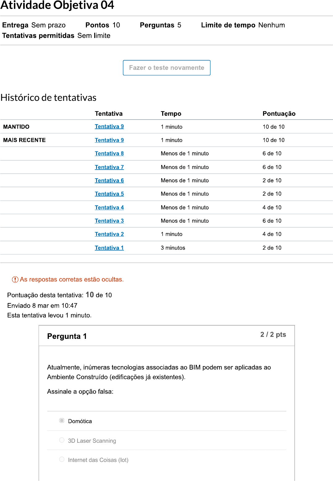 <p>Atividade Objetiva 04 Entrega Sem prazo Pontos 10 Perguntas 5 Limite de tempo Nenhum Tentativas permitidas Sem limite Fazer teste novamente Histórico de tentativas Tentativa Tempo Pontuação MANTIDO Tentativa 9 1 minuto 10 de 10 MAIS RECENTE Tentativa 9 1 minuto 10 de 10 Tentativa 8 Menos de 1 minuto 6 de 10 Tentativa 7 Menos de 1 minuto 6 de 10 Tentativa 6 Menos de 1 minuto 2 de 10 Tentativa 5 Menos de 1 minuto 2 de 10 Tentativa 4 Menos de 1 minuto 4 de 10 Tentativa 3 Menos de 1 minuto 6 de 10 Tentativa 2 1 minuto 4 de 10 Tentativa 1 3 minutos 2 de 10 ! As respostas corretas estão ocultas. Pontuação desta tentativa: 10 de 10 Enviado 8 mar em 10:47 Esta tentativa levou 1 minuto. Pergunta 1 2/2 pts Atualmente, inúmeras tecnologias associadas ao BIM podem ser aplicadas ao Ambiente Construído (edificações já existentes). Assinale a opção falsa Domótica 3D Laser Scanning Internet das Coisas (lot)</p><p>Todas são verdadeiras. Pergunta 2 2/2 pts Ambiente Construído pode ser beneficiado pela Internet das Coisas (lot). Marque a opção que não está relacionada a este contexto: Modelo As-Built BIM Modelo BIM Monitoramento e Controle Modelo As-is BIM Modelo BIM na Fase Construtiva do ciclo de vida de um empreendimento. Pergunta 3 2/2 pts sistema GIS, BIM e lot, está relacionado ao CIM (City Information Modeling). Neste contexto, podemos afirmar que: O CIM é o conjunto de vários sistemas BIM CIM é um subsistema BIM CIM é uma possível Dimensão do BIM (nD) Nenhuma afirmativa é verdadeira. Pergunta 4 2/2 pts Em relação aos Gêmeos Digitais (Digital Twins) podemos afirmar que têm como grande objetivo, simular desempenho em diferentes contextos. Nesta direção, assinale a afirmativa falsa:</p><p>Relacionam-se com o BIM 6D (Modelo de Sustentabilidade e Análise Energética). Relacionam-se com o Modelo As-Built BIM. Relacionam-se com o BIM 4D. Relacionam-se com o BIM 5D. Pergunta 5 2/2 pts A modelagem das cidades visa o alcance de inúmeros benefícios para os seus habitantes. Neste contexto, podemos dizer que o CIM se inspira nos pilares da sustentabilidade. Quais das afirmativas abaixo se enquadram nesta afirmação? Sustentabilidade Social. Sustentabilidade Ambiental. Sustentabilidade Todas afirmativas são verdadeiras. Pontuação do teste: 10 de 10</p>