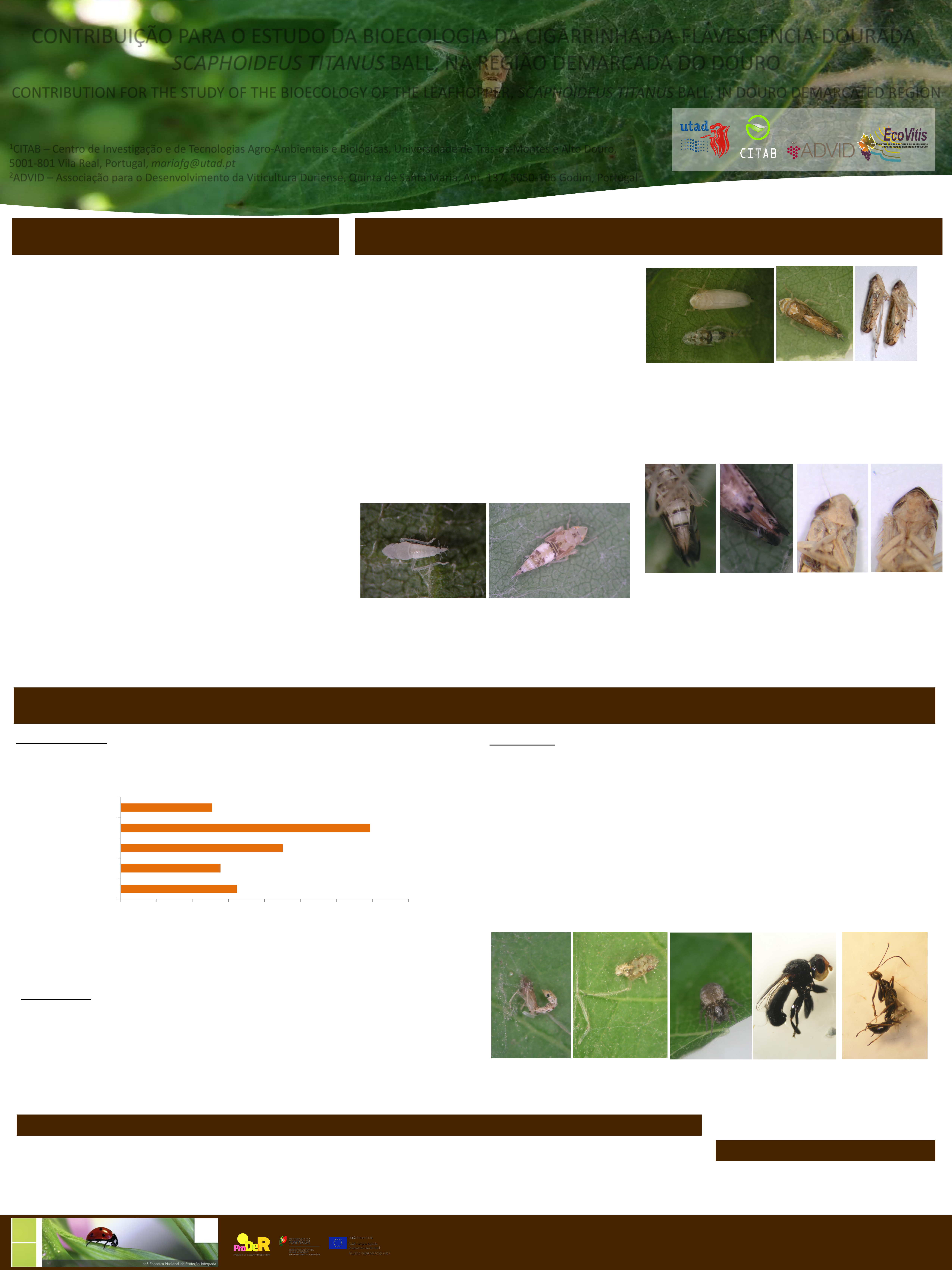 <p>INTRODUÇÃO MATERIAL & MÉTODOS</p><p>RESULTADOS & DISCUSSÃO</p><p>Referências bibliográficas</p><p>CONTRIBUIÇÃO PARA O ESTUDO DA BIOECOLOGIA DA CIGARRINHA-DA-FLAVESCÊNCIA-DOURADA,</p><p>SCAPHOIDEUS TITANUS BALL, NA REGIÃO DEMARCADA DO DOURO</p><p>CONTRIBUTION FOR THE STUDY OF THE BIOECOLOGY OF THE LEAFHOPPER, SCAPHOIDEUS TITANUS BALL, IN DOURO DEMARCATED REGION</p><p>Fátima Gonçalves1, Cristina Carlos1,2, Branca Teixeira2, Susana Sousa1 & Laura Torres1</p><p>1CITAB – Centro de Investigação e de Tecnologias Agro-Ambientais e Biológicas, Universidade de Trás-os-Montes e Alto Douro,</p><p>5001-801 Vila Real, Portugal, mariafg@utad.pt</p><p>2ADVID – Associação para o Desenvolvimento da Viticultura Duriense, Quinta de Santa Maria, Apt. 137, 5050-106 Godim, Portugal</p><p>Co-financiado pelo Programa de Desenvolvimento Rural – Ministério da Agricultura, Mar, Ambiente e Ordenamento do Território – Fundo</p><p>Europeu Agrícola de Desenvolvimento Rural – A Europa investe nas zonas rurais.</p><p>10º Encontro Nacional de Protecção Integrada Beja, Instituto Politécnico de Beja 2 e 3 de Maio de 2014</p><p>Figura 1 – Ninfas de Scaphoideus titanus (A e B); B - ninfa de</p><p>5º instar.</p><p>Figura 2 - Adultos de Scaphoideus titanus: A – adulto recém-</p><p>emergido junto à exúvia; B – adulto onde se pode observar</p><p>a coloração característica da espécie; C – fêmea e macho do</p><p>insecto, onde se pode observar a diferença de tamanho</p><p>existente (o macho é geralmente mais pequeno (4,8 a 5,2</p><p>mm vs 5,5 – 6,0 mm) (Dal Ri e Capra, 2003)).</p><p>A cigarrinha-da-flavescência-dourada, Scaphoideus titanus</p><p>Ball. (Homoptera: Cicadellidae), de origem Norte-Americana</p><p>(Grandes Lagos), foi acidentalmente introduzida na Europa</p><p>durante a primeira metade do séc. XX (Caudwell e Larrue,</p><p>1986), tendo sido observada em Portugal pela primeira vez</p><p>em 1998 e 1999, respectivamente em Arcos de Valdevez e</p><p>Vila Real (Quartau et al., 2001).</p><p>A importância económica deste insecto deve-se</p><p>fundamentalmente ao facto de ser o agente vector do</p><p>fitoplasma da Flavescência Dourada (FD) “Grapevine</p><p>flavescence dorée phytoplasma” (fitoplasma do grupo</p><p>ribossomal 16SrV-C ou 16SrV-D), organismo nocivo de</p><p>quarentena identificado em território nacional em 2006</p><p>(Sousa et al. 2007), responsável por uma forte diminuição do</p><p>rendimento e pelo declínio de videiras.</p><p>Na sequência da sua identificação em Portugal, foram</p><p>definidas desde 2008 medidas de protecção fitossanitária</p><p>adicionais e de emergência destinadas a erradicar em</p><p>território nacional o fitoplasma e a conter a dispersão do</p><p>insecto vector (Portarias 976/2008 e 165/2013). No caso de S.</p><p>titanus, o nível económico de ataque é a presença do insecto</p><p>sendo as datas de tratamento definidas pelo Serviço Nacional</p><p>de Avisos Agrícolas.</p><p>O presente trabalho teve como objectivo contribuir para o</p><p>conhecimento do ciclo de vida e dos factores de mortalidade</p><p>natural de Scaphoideus titanus, na região Demarcada do</p><p>Douro.</p><p>O trabalho, que decorreu em inícios de Julho de</p><p>2013, realizou-se em duas vinhas localizadas na</p><p>região do Baixo Corgo (freguesias de Godim e S.</p><p>Miguel de Lobrigos). Para o efeito, recolheram-se</p><p>insectos, que foram observados à lupa binocular,</p><p>para avaliação do seu estado de desenvolvimento</p><p>(Figura 1) e mortalidade. Posteriormente,</p><p>mantiveram-se em condições de laboratório</p><p>controladas (26ºC, 60±10% HR, 16:8 (L:E)), até à</p><p>emergência de adultos e/ou eventuais parasitóides.</p><p>Os indivíduos foram alimentados com folhas de</p><p>videira que foram substituídas a cada dois dias. No</p><p>final do desenvolvimento, os adultos foram</p><p>caracterizados quanto ao seu género.</p><p>Figura 5 - Ninfas de Scaphoideus titanus predadas (A e B), aranha Dyctina sp, observada a predar</p><p>uma ninfa (C), díptero da família Pipunculidae (D) e himenóptero da família Dryinidae (E).</p><p>♀</p><p>♂</p><p>♂ ♀</p><p>Figura 4 - Constituição da população de Scaphoideus titanus, no inicio de Julho.</p><p>A</p><p>C</p><p>B</p><p>A</p><p>A</p><p>B</p><p>B D C</p><p>A C B</p><p>Figura 3 - Adultos de Scaphoideus titanus: caracteres que</p><p>permitem distinguir os sexos: genitálias (presença de oviscapto</p><p>nas fêmeas: A- macho, B – fêmea) e vértex, na cabeça (macho</p><p>apresenta na cabeça 2-3 linhas transversais escuras enquanto que</p><p>a fêmea possui 3-4: C – macho, D – fêmea) (Dal Ri e Capra,</p><p>2003).</p><p>♂ ♀</p><p>Desenvolvimento</p><p>Foram capturados 173 indivíduos de S. titanus. Destes, 12,7% eram adultos e 87,3%</p><p>eram ninfas (N5 – 34,7%, N4 – 22,5%, N3 – 13,9% e N1+N2 – 16,2%) (Figura 4).</p><p>Razão sexual</p><p>Na população inicial de adultos trazidos da campo, verificou-se uma</p><p>predominância de machos (94,1%), sugerindo que estes emergem antes das</p><p>fêmeas. Porém, a razão sexual do total da amostra acompanhada no laboratório</p><p>evidenciou ligeira predominância de fêmeas (0,87:1). Estes resultados também</p><p>foram observados por Lessio et al. (2009), em populações criadas em laboratório</p><p>e em indivíduos capturados em armadilhas.</p><p>0 5 10 15 20 25 30 35 40</p><p>N1+N2</p><p>N3</p><p>N4</p><p>N5</p><p>A</p><p>% relativa</p><p>e</p><p>st</p><p>ad</p><p>o</p><p>d</p><p>e</p><p>d</p><p>e</p><p>so</p><p>n</p><p>vo</p><p>lv</p><p>im</p><p>e</p><p>n</p><p>to</p><p>Mortalidade</p><p>Cerca de 6,9% dos indivíduos observados no campo estavam mortos, sendo que</p><p>destes, 41,7% indicavam sinais de terem sido predados (Figura 5A e B), tendo sido</p><p>ainda possível observar um indivíduo de Dictyna sp. (Araneae: Dictynidae) (Figura</p><p>5C) a predar uma ninfa. Não se obteve nenhum parasitóide na