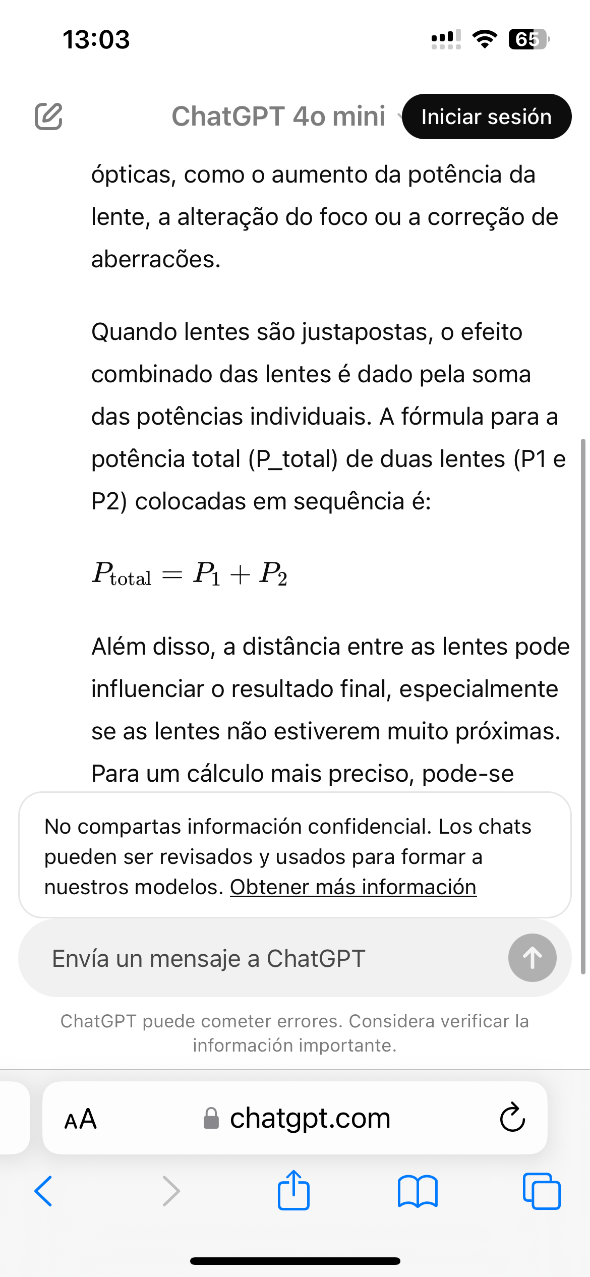<p>13:03 65 ChatGPT mini Iniciar sesión ópticas, como o aumento da potência da lente, a alteração do foco ou a correção de aberrações. Quando lentes são justapostas, o efeito combinado das lentes é dado pela soma das potências individuais. A fórmula para a potência total (P_total) de duas lentes (P1 e P2) colocadas em sequência é: Ptotal : Além disso, a distância entre as lentes pode influenciar resultado final, especialmente se as lentes não estiverem muito próximas. Para um cálculo mais preciso, pode-se No compartas información confidencial. Los chats pueden ser revisados y usados para formar a nuestros modelos. Obtener más información Envía un mensaje a ChatGPT T ChatGPT puede cometer errores. Considera verificar la información importante. AA chatgpt.com</p>