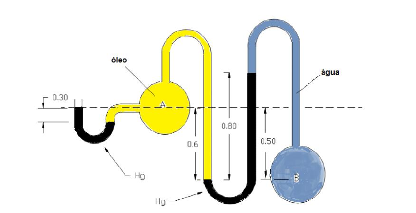 <p>UNIVERSIDADE FEDERAL DE PELOTAS</p><p>CENTRO DE ENGENHARIA</p><p>MECÂNICA DE FLUIDOS</p><p>PROVA 1</p><p>Instruções para realização da prova: A prova estará disponível para realização das 15:30 do</p><p>dia 24/05/2022 até as 12:00 horas do dia 28/05/2022. A prova deve ser feita à mão, de</p><p>preferência com caneta preta ou azul (a realização a lápis e a posterior resolução é de</p><p>responsabilidade do aluno) e após o termino deverá ser escaneada e enviada em PDF pelo</p><p>sistema do e-aula. A gravação das questões solicitadas com as explicações necessárias é parte</p><p>da resolução. O arquivo de vídeo deverá ser disponibilizado e enviado pelo sistema do e-aula</p><p>em formato compatível.</p><p>Sugestão, gravação e disponibilização no YouTube e envio do link junto à prova.</p><p>Grave as resoluções das questões 1,2,3;4,5,6,7 e 8, fazendo as explicações que achar</p><p>pertinente. Serão consideradas nulas as questões que não forem enviadas com suas respectivas</p><p>explicações gravadas.</p><p>Os dados não fornecidos na prova, podem ser admitidos a partir da bibliografia e explicados no</p><p>vídeo.</p><p>Questão 1) Na figura abaixo, o tubo A contém óleo com massa especifica igual</p><p>a 800 kg/m3 e o tubo B, água. Calcular as pressões em A e em B. Dado: massa</p><p>especifica da água = 1000 kg/m3; massa especifica do mercúrio = 13600 kg/m3</p><p>e as cotas do desenho estão em metros. (1,0 pts)</p><p>O desenho não está em escala</p><p>Questão 2) Um fluído escoa sobre uma placa com o diagrama dado. Pede-se</p><p>(1,0 pts):</p><p>a) V= f(y).</p><p>b) A tensão de cisalhamento junto à placa.</p><p>Questão 3) No esquema dado, qual é a pressão em (1) se o sistema está em</p><p>equilíbrio estático? (Leitura do manômetro pm = 10 kPa). (1,5 pts)</p><p>Questão 4) Na figura, a superfície da água está em (A), pois neste nível a</p><p>pressão absoluta do ar é de 108000 Pa. Nesta condição a leitura L é de 270 cm,</p><p>a leitura no manômetro metálico é de 1,2 mca e a cota z de 27 cm. Ao retirar a</p><p>rolha, a superfície da água passa para o nível (B). Sendo o peso específico da</p><p>água de 9800 N/m³, o peso específico do mercúrio de 136000 N/m³ e o diâmetro</p><p>do reservatório D = 25 cm. (1,5 pts). Pede-se:</p><p>a. Qual a leitura barométrica local em mmHg? b. Qual o peso específico do fluido</p><p>manométrico (m)? c. Se na condição da figura (com a rolha), a cota H = 356 cm;</p><p>qual será a nova cota H quando se retirar a rolha? d. Qual o diâmetro do tubo</p><p>manométrico d?</p><p>Questão 5) Determinar a força R que deverá ser aplicada no ponto A da</p><p>comporta, para que permaneça em equilíbrio, sabendo –se que ela não pode</p><p>girar em torno do ponto O (1,0 pts).</p><p>Questão 6) Na figura mostrada abaixo a constante do gás é de 300 m²/(s²*K);</p><p>os diversos fluidos estão em equilíbrio a 27 0C e nesta condição a massa</p><p>específica do gás é de 2 kg/m³. Pede-se determinar (1,5 pts): a leitura do</p><p>manômetro metálico (kPa); a cota z em mm; a cota h em mm. Considere a</p><p>pressão atmosférica de 690 mm Hg</p><p>Questão 7) O reservatório da Figura possui uma parede móvel AB, articulada</p><p>em A. Sua largura é 1,5 m e está em equilíbrio nas condições indicadas. Pede-</p><p>se: (1,0 pts): a) a força que age na face direita da comporta devido à água; b) a</p><p>força que deve ser aplicada em M para que seja mantido o equilíbrio.</p><p>Questão 8) No manômetro da figura, são indicados os níveis dos fluídos</p><p>manométricos antes e depois de ele ser ligado ao reservatório A. Pede-se: (1,5</p><p>pts) a) a leitura do manômetro em m.c.a: b) a densidade do ar do reservatório A</p><p>em Kg/m3 se a temperatura dele é 20 OC e o R = 287m2 /s2K</p>