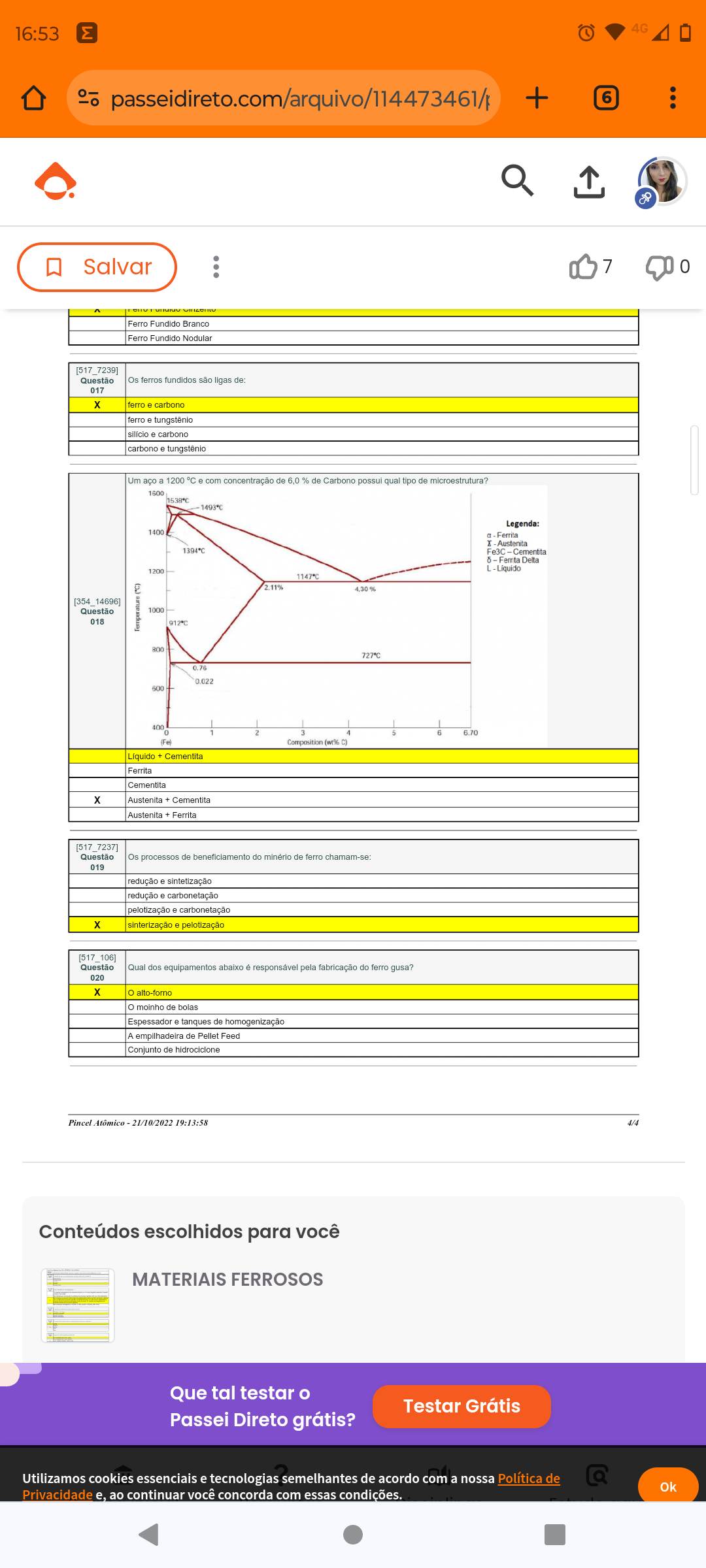 <p>16:53 E 4G passeidireto.com/arquivo/114473461/ + 6 Salvar 7 0 Ferro Fundido Branco Ferro Fundido Nodular [517 7239] Questão Os ferros fundidos são ligas 017 X ferro carbono ferro tungstênio carbono carbono tungstênio Um aço 1200 e com concentração de 6.0 % de Carbono possui qual tipo de microestrutura? 1600 1538°C 1493°C Legenda: 1400 Ferrita Austenita 1394°C Cementita 5 Ferrita Delta 1200 1147°C [354_14696] Questão 1000 018 912°C 800 727°C 0.76 0.022 600 400 1 2 3 4 5 6 6.70 Composition (wt% C Líquido Cementita Ferrita Cementita X Austenita Cementita Austenita Ferrita [517 7237] Questão Os processos de beneficiamento do minério de ferro chamam-se 019 redução sintetização redução carbonetação pelotização carbonetação X sinterização pelotização [517 106] Questão Qual dos equipamentos abaixo é responsável pela fabricação do ferro gusa? 020 X alto-forno moinho de bolas Espessador tanques de homogenização A empilhadeira de Pellet Feed Conjunto de hidrocicione 21/10/2022 19:13:58 4/4 Conteúdos escolhidos para você MATERIAIS FERROSOS Que tal testar Testar Grátis Passei Direto grátis? Utilizamos cookies essenciais e tecnologias semelhantes de acordo com a nossa Política de Q Ok Privacidade e, ao continuar você concorda com essas condições.</p>