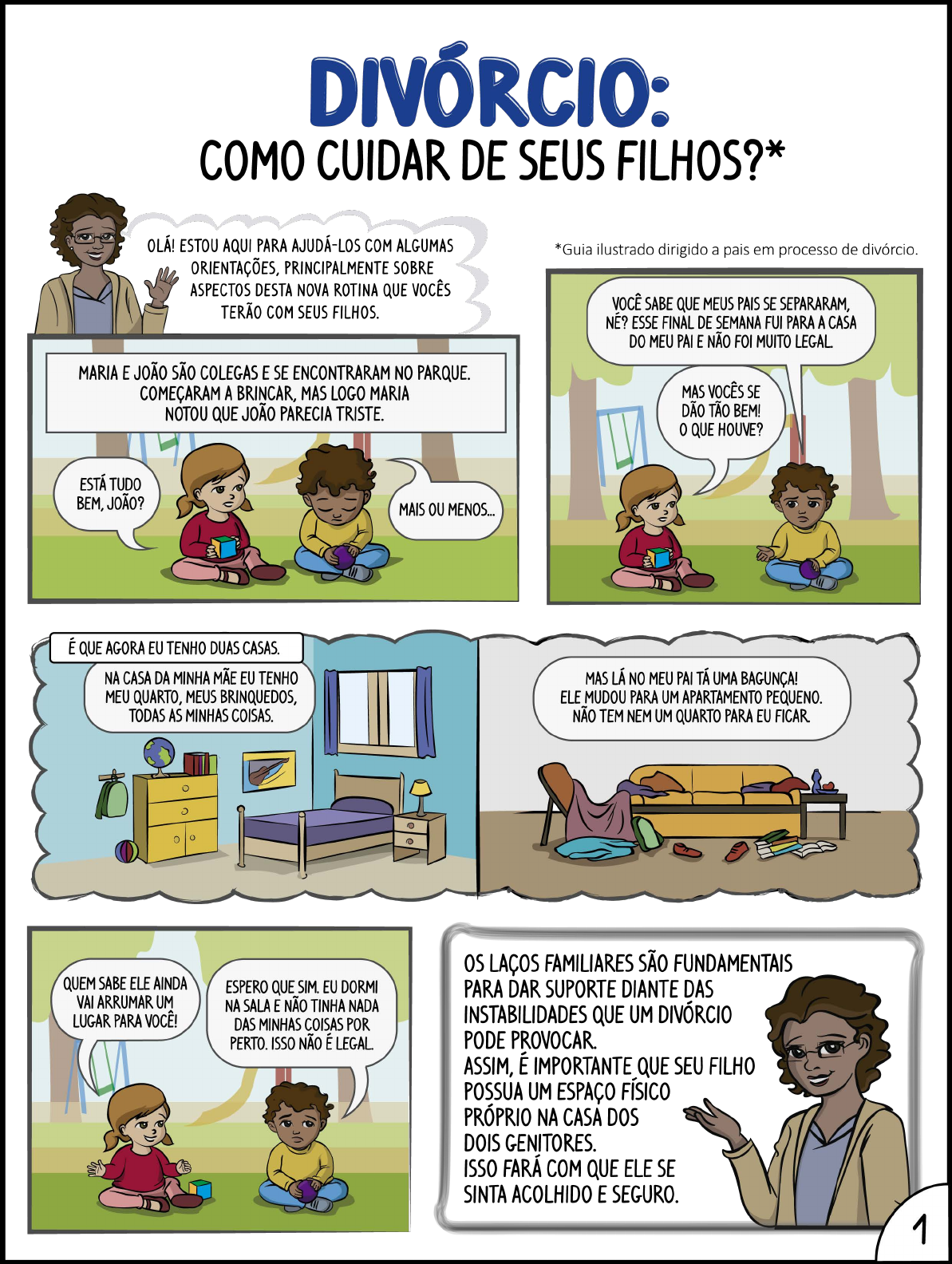 <p>DIVÓRCIO: COMO CUIDAR DE SEUS FILHOS?* ESTOU AQUI PARA AJUDÁ-LOS COM ALGUMAS *Guia ilustrado dirigido a pais em processo de divórcio. ORIENTAÇÕES, PRINCIPALMENTE SOBRE ASPECTOS DESTA NOVA ROTINA QUE VOCÊS TERÃO COM SEUS FILHOS. VOCÊ SABE QUE MEUS PAIS SE SEPARARAM NE? ESSE FINAL DE SEMANA FUI PARA A CASA DO MEU PA E NÃO FOI MUITO LEGAL MARIA E JOÃO SÃO COLEGAS E SE ENCONTRARAM NO PARQUE. COMECARAM A MAS LOGO MARIA MAS SE NOTOU QUE JOÃO PARECIA TRISTE. DÃO TÃO BEM! 0 QUE HOUVE? ESTÁ TUDO BEM, JOÃO? MAIS OU MENOS É QUE AGORA EU TENHO DUAS NA CASA DA MINHA MÃE EU TENHO MAS LÁ NO MEU PA UMA BAGUNÇA! MEU QUARTO, MEUS BRINQUEDOS, ELE MUDOU PARA UM APARTAMENTO PEQUENO. TODAS AS MINHAS COISAS. NÃO TEM NEM UM QUARTO PARA EU FICAR LAÇOS FAMILIARES SÃO FUNDAMENTAIS QUEM SABE ELE AINDA ESPERO QUE SIM. EU DORMI PARA DAR SUPORTE DIANTE DAS VAI ARRUMAR UM NA SALA E NÃO TINHA NADA LUGAR PARA VOCÊ! INSTABILIDADES QUE UM DIVÓRCIO DAS MINHAS COISAS POR PERTO. ISSO NÃO É LEGAL PODE PROVOCAR ASSIM, É IMPORTANTE QUE SEU FILHO POSSUA UM ESPAÇO PRÓPRIO NA CASA DOS DOIS GENITORES. ISSO FARÁ COM QUE ELE SE SINTA ACOLHIDO E SEGURO. 1</p><p>LOGO NO A MINHA MÃE NÃO TINHA E MINHAS COISAS FICAVAM QUANDO MEUS PAIS UM QUARTO NA CASA DELA PARA QUE EU TODAS NA CASA DO MEU PAI. SE DIVORCIARAM FICASSE NOS FINAIS DE SEMANA. TAMBÉM FOI COMPLICADO PARA ELES ORGANIZAREM MEUS DOIS QUARTOS. MAIS TARDE, MINHA MÃE ORGANIZOU UM ESPAÇO PARA QUE EU PUDESSE FICAR. PUDE LEVAR MEUS BRINQUEDOS E ROUPAS, ALEM DAS COISAS PARA A ESCOLA. DIVIDI TUDO NAS MINHAS DUAS CASAS E AGORA TENHO DOIS 00 QUE BOM MARIA! AH, 0 COLÉGIO! MANDOU! JÁ PARA MEU E A PROFESSORA MANDOU DOIS PARA A MINHA os DOIS IRÃO À TOMARA QUE MEU PAI CONSIGA SE BILHETES FALANDO SOBRE 0 ORGANIZAR TAMBÉM PORQUE NÃO PASSEIO. ELA MANDOU PARA os É NADA BOM IR PRA CASA DELE E SEUS PAIS? NÃO TER UM ESPAÇO MEU. NFM PARA AS COISAS DO COLÉGIO. EU PARA 0 MEU PAI E FALEI PARA MINHA MÃE QUE TINHA UM BILHETE A EDUCAÇÃO DE UMA CRIANÇA É UM ASPECTO PARA ELA, MAS ACHO QUE ELA NÃO IMPORTANTE DE SUA PA E MÃE POSSUEM RESPONSABILIDADES IGUAIS EM QUE LEGAL QUE NA SUA INCENTIVAR E É ASSIM! NA MINHA, MEUS PAIS NUNCA VÃO PARTICIPAR DA VIDA ESCOLAR JUNTOS EM UM REUNIÃO DE SEUS FILHOS. DA VALORIZE ESSES MOMENTOS DA EDUCAÇÃO DELES! 2</p><p>os MEUS PAIS SEMPRE VÃO NAS REUNIÕES DA EU TAMBÉM. ESSES DIAS FIQUEI SEM VÍDEO GAME PORQUE ESCOLA, MESMO NÃO MORANDO MAIS JUNTOS. NÃO MEU QUARTO. MEUS QUARTOS, NE? ELES ACHAM IMPORTANTE ME ACOMPANHAR DE PERTO NO COLÉGIO PARA VER AH, VOCÊ TEM DOIS QUARTOS, SE ESTÁ INDO TUDO BEM. TEM TRABALHO DOBRADO! SE NÃO, JÁ SABE, FICO SEM VÍDEO GAME. SE SEU PAI PROVIDENCIAR SEU ESPAÇO VOCÊ VAI VER TEM QUE DEIXAR TUDO ORGANIZADO SEMPRE. EU TENHO REGRAS PARA CUMPRIR NAS MINHAS DUAS CASAS. ÀS VEZES EU NÃO GUARDO QUANDO EU VOU PRO MEU E É QUE EU FICO SEM VÍDEO GAME. SEMPRE TENHO QUE FAZER 0 DEVER ANTES DE BRINCAR E, DEPOIS DE BRINCAR, GUARDAR TODOS os BRINQUEDOS NO NA CASA DO MEU PAI TEM MUITAS REGRAS: ARRUMAR 0 MAS QUANDO EU VOU PRA CASA DA MINHA GUARDAR os BRINQUEDOS, FAZER DEVERES, SECAR A MÃE MUITO MELHOR PORQUE LÁ NÃO PRECISO CUMPRIR TODAS AS PARA os FILHOS, 0 PROCESSO DE DIVÓRCIO PODE E SUA GERAR DÚVIDAS E INCERTEZAS. ELA DEIXA EU FAZER 0 QUE EU É IMPORTANTE QUE SE ESTABELEÇAM QUE ÀS VEZES, QUANDO EU VOLTO PRA CASA REGRAS, ROTINAS E DEVERES DO MEU PAI A GENTE ACABA BRIGANDO PORQUE EU NÃO SEMELHANTES. MANTER AS MESMAS QUERO SEGUIR COMBINAÇÕES NA CASA DA AS REGRAS. MÃE E DO PAI CONTRIBUI PARA A SEGURANÇA EMOCIONAL DA CRIANÇA. 3</p><p>E SEU PAI FALA COM A SUA MÃE É ELES CONVERSAM 0 TEMPO TODO SOBRE MIM. PRA SABER SE VOCÊ CUMPRIU MEU PAI SEMPRE FICA SABENDO COMO EU ME AS TAREFAS? NA CASA DA MINHA MÃE. ISSO É OUTRA COISA QUE ME QUE PENA ISSO ACONTECER COM VOCÊ, MEUS PAIS DEIXA MUITO TRISTE: MEUS PAIS SÃO BEM ELES NÃO MORAM MAIS JUNTOS, MAS SEMPRE NÃO CONVERSAM NEM SOBRE SE FALAM QUANDO 0 ASSUNTO SOU MIM NEM SOBRE NADA! APESAR DE A MINHA MESMO QUANDO os DOIS VÃO MÃE NÃO PARTICIPAR MUITO DAS COISAS DO PARA A REUNIÃO DA ESCOLA, COLÉGIO, POR NÃO TROCAM UMA PALAVRA. EXEMPLO, MEU PA ELES SEMPRE BRIGAM QUANDO SEMPRE CONTA PARA VÃO SE ELA 0 QUE ME SINTO MUITO MAL COM ISSO. DIALOGAR SOBRE ASSUNTOS DE 0 PAPEL DE E MÃE, INTERESSE DOS FILHOS, FAZENDO 0 MESMO APÓS A RUPTURA POSSÍVEL PARA DEIXAR DE LADO AS DO DEVE MÁGOAS DO CASAL, REVELA A SER EXERCIDO COM PRIORIDADE DO BEM-ESTAR IGUALDADE POR VOCÊ DOS FILHOS, 0 QUE REPERCUTE E POR SEU/SUA EM UM DESENVOLVIMENTO SADIO. 0 DIVÓRCIO É UMA MUDANÇA DIFÍCIL PARA ADULTOS E CRIANÇAS. CONTUDO, SEGUINDO os CUIDADOS QUE FORAM APRESENTADOS A VOCÊ, ESSA TRANSFORMAÇÃO NA VIDA DA FAMÍLIA PODE TORNAR-SE MENOS DOLOROSA PARA TODOS. LEMBRE-SE QUE 0 MAIS IMPORTANTE É PRIORIZAR 0 AMOR E A ATENÇÃO DISPENSADOS AOS SEUS FILHOS! Grupo de Estudo, Aplicação e Vivian de Medeiros Lago GEAPAP Pesquisa em Avaliação Psicológica Tauany Brizolla Flores do Nascimento 4 Flávia Lemes Matte</p>