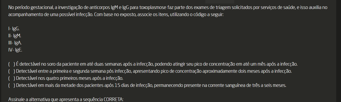 <p>No período gestacional, a investigação de anticorpos IgM e para toxoplasmose faz parte dos exames de triagem solicitados por serviços de saúde, e isso auxilia no acompanhamento de uma possível infecção. Com base no exposto, associe os itens, utilizando código a seguir: I- II- III- IgA. ( ) É detectável no soro da paciente em até duas semanas após a infecção, podendo atingir seu pico de concentração em até um mês após a infecção. ( ) Detectável entre a primeira e segunda semana pós infecção, apresentando pico de concentração aproximadamente dois meses após a infecção. ( ) Detectável nos quatro primeiros meses após a infecção. ( ) Detectável em mais da metade dos pacientes após 15 dias de infecção, permanecendo presente na corrente sanguínea de três a seis meses. Assinale a alternativa que apresenta a seguência CORRETA:</p>