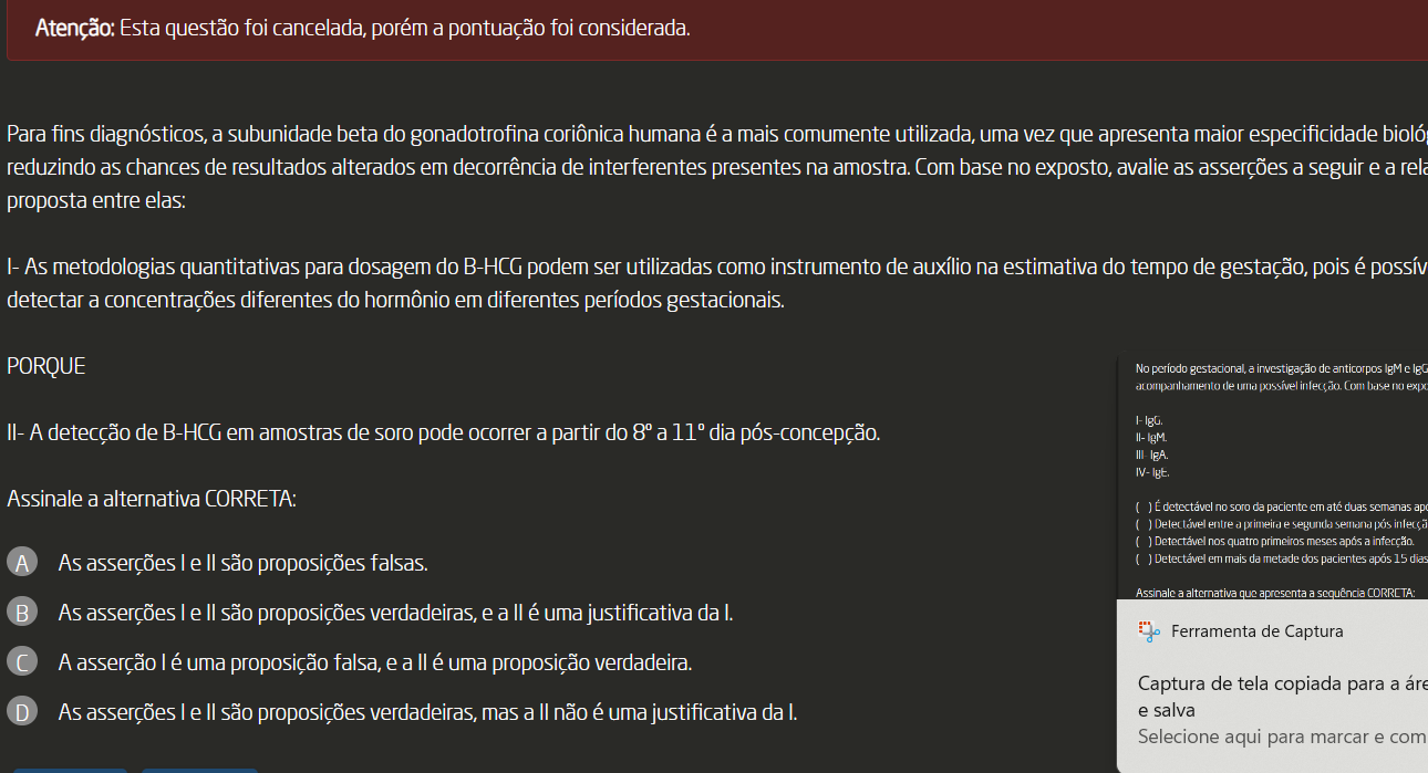 <p>Atenção: Esta questão foi cancelada, porém a pontuação foi considerada. Para fins diagnósticos, a subunidade beta do gonadotrofina coriônica humana é a mais comumente utilizada, uma vez que apresenta maior especificidade bioló reduzindo as chances de resultados alterados em decorrência de interferentes presentes na amostra. Com base no exposto, avalie as asserções a seguir e a rela proposta entre elas: I- As metodologias quantitativas para dosagem do B-HCG podem ser utilizadas como instrumento de auxílio na estimativa do tempo de gestação, pois é detectar a concentrações diferentes do hormônio em diferentes períodos gestacionais. PORQUE No período gestacional a investigação de anticorpos de possível Com base no exix I IRG II- A detecção de B-HCG em amostras de soro pode ocorrer a partir do a 11° dia pós-concepção. III Assinale a alternativa CORRETA: detectável no soro da paciente em até duas semanas ap ( ) entre primeira segunda pós : Detectável nos quatro primeiros meses após a infecção A As asserções I e são proposições falsas. : Detectável em mais da metade dos pacientes após 15 dias Assinale a alternativa que apresenta a CORRETA B As asserções e II são proposições verdadeiras, e a é uma justificativa da I. Ferramenta de Captura A asserção é uma proposição falsa, e a é uma proposição verdadeira. Captura de tela copiada para a D As asserções I e são proposições verdadeiras, mas a II não é uma justificativa da I. e salva Selecione aqui para marcar e com</p>