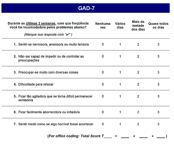 <p>GAD-7 Durante as últimas 2 semanas, com que Mais da Nenhuma Quase todos você foi incomodado/a pelos problemas abaixo? metade vez dias os dias dos dias (Marque sua resposta com 1. Sentir-se ansioso/a ou muito tenso/a 0 1 2 3 2. Não ser capaz de impedir ou de controlar as 0 1 2 3 preocupações 3. Preocupar-se muito com diversas coisas 0 1 2 3 4. Dificuldade para relaxar 0 1 2 3 5. Ficar tão agitado/a que se torna permanecer 0 1 2 3 sentado/a 6. Ficar facilmente aborrecido/a ou irritado/a 1 2 3 7. Sentir medo como se algo horrivel fosse acontecer 0 1 2 3 (For office coding: Total Score T = + + )</p>