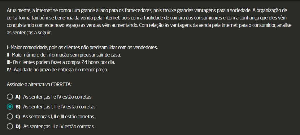 <p>Atualmente, a internet se tornou um grande aliado para fornecedores, pois trouxe grandes vantagens para a sociedade. A organização de certa forma também se beneficia da venda pela internet, pois com a facilidade de compra dos consumidores e com a confiança que eles vêm conquistando com este novo espaço as vendas vêm aumentando. Com relação às vantagens da venda pela internet para consumidor, analise as sentenças a I- Maior comodidade, pois clientes não precisam lidar com vendedores. II- Maior número de informação sem precisar sair de casa. III- Os clientes podem fazer a compra 24 horas por dia. Agilidade no prazo de entrega e menor preço. Assinale a alternativa CORRETA: A) As sentenças I e IV estão corretas. B) As sentenças I, II e IV estão corretas. C) As sentenças I, II e III estão corretas. D) As sentenças III e IV estão corretas.</p>