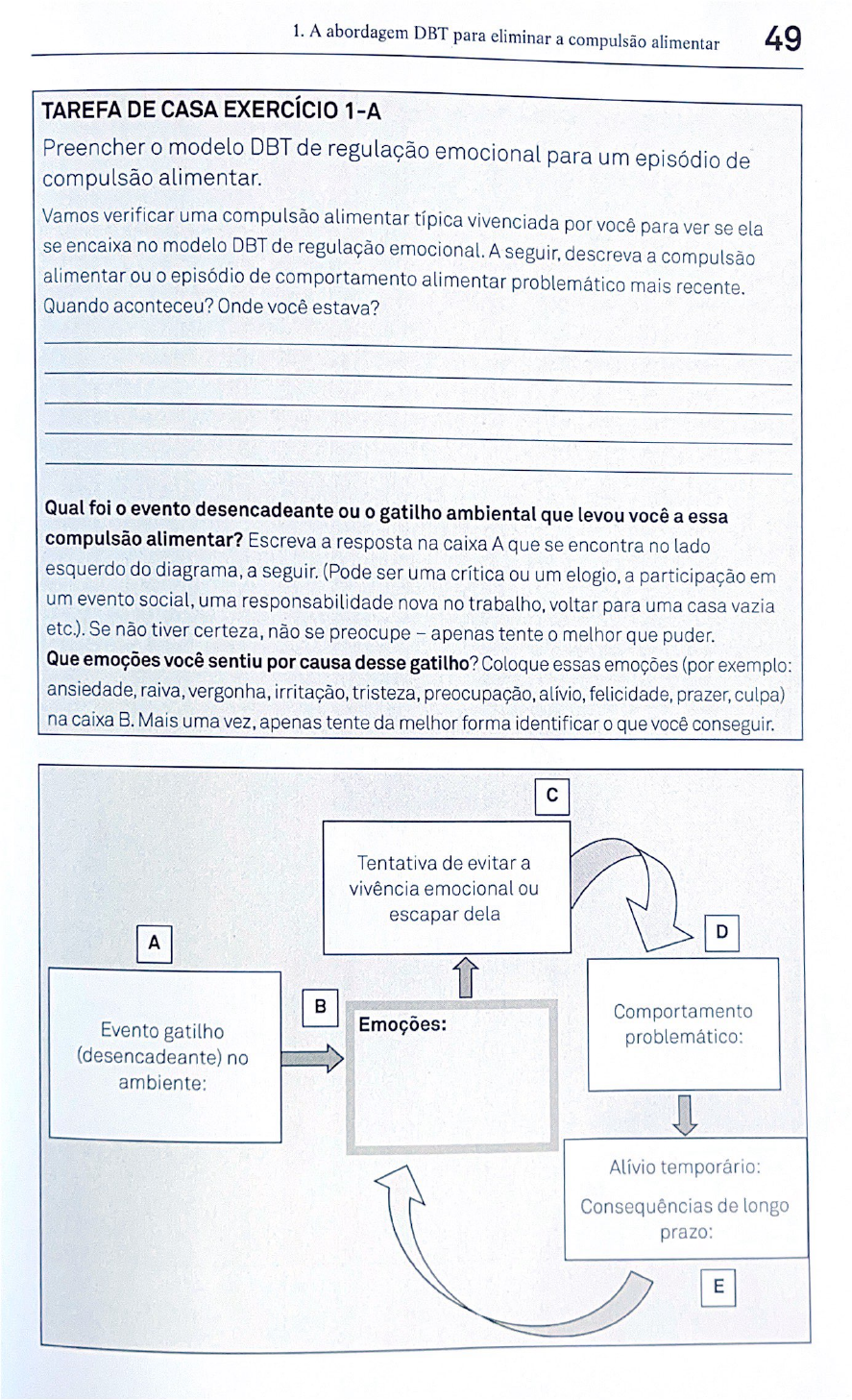 <p>1. A abordagem DBT para eliminar a compulsão alimentar 49</p><p>TAREFA DE CASA EXERCICIO 1-A</p><p>Preencher o modelo DBT de regulação emocional para um episódio de</p><p>compulsão alimentar.</p><p>Vamos verificar uma compulsão alimentar típica vivenciada por você para ver se ela</p><p>se encaixa no modelo DBT de regulação emocional. A seguir, descreva a compulsão</p><p>alimentar ou o episódio de comportamento alimentar problemático mais recente.</p><p>Quando aconteceu? Onde você estava?</p><p>Qual foi o evento desencadeante ou o gatilho ambiental que levou você a essa</p><p>compulsão alimentar? Escreva a resposta na caixa A que se encontra no lado</p><p>esquerdo do diagrama, a seguir. (Pode ser uma crítica ou um elogio, a participação em</p><p>um evento social, uma responsabilidade nova no trabalho, voltar para uma casa vazia</p><p>etc.). Se não tiver certeza, não se preocupe - apenas tente o melhor que puder.</p><p>Que emoções você sentiu por causa desse gatilho? Coloque essas emoções (por exemplo:</p><p>ansiedade, raiva, vergonha, irritação, tristeza, preocupação, alívio, felicidade, prazer, culpa)</p><p>na caixa B. Mais uma vez, apenas tente da melhor forma identificar o que você conseguir.</p><p>Tentativa de evitar a</p><p>vivência emocional ou</p><p>escapar dela</p><p>A</p><p>B</p><p>Evento gatilho</p><p>(desencadeante) no</p><p>ambiente:</p><p>Emoções: Comportamento</p><p>problemático:</p><p>Alívio temporário:</p><p>Consequências de longo</p><p>prazo:</p><p>Licenciado para - W</p><p>ilm</p><p>a C</p><p>osta M</p><p>esquita - 09040485437 - P</p><p>rotegido por E</p><p>duzz.com</p><p>Licenciado para - W</p><p>ilm</p><p>a C</p><p>osta M</p><p>esquita - 09040485437 - P</p><p>rotegido por E</p><p>duzz.com</p><p>Licenciado para - W</p><p>ilm</p><p>a C</p><p>osta M</p><p>esquita - 09040485437 - P</p><p>rotegido por E</p><p>duzz.com</p><p>Licenciado para - W</p><p>ilm</p><p>a C</p><p>osta M</p><p>esquita - 09040485437 - P</p><p>rotegido por E</p><p>duzz.com</p><p>Licenciado para - W</p><p>ilm</p><p>a C</p><p>osta M</p><p>esquita - 09040485437 - P</p><p>rotegido por E</p><p>duzz.com</p><p>Licenciado para - W</p><p>ilm</p><p>a C</p><p>osta M</p><p>esquita - 09040485437 - P</p><p>rotegido por E</p><p>duzz.com</p><p>Licenciado para - W</p><p>ilm</p><p>a C</p><p>osta M</p><p>esquita - 09040485437 - P</p><p>rotegido por E</p><p>duzz.com</p><p>Licenciado para - W</p><p>ilm</p><p>a C</p><p>osta M</p><p>esquita - 09040485437 - P</p><p>rotegido por E</p><p>duzz.com</p><p>Licenciado para - W</p><p>ilm</p><p>a C</p><p>osta M</p><p>esquita - 09040485437 - P</p><p>rotegido por E</p><p>duzz.com</p><p>Licenciado para - W</p><p>ilm</p><p>a C</p><p>osta M</p><p>esquita - 09040485437 - P</p><p>rotegido por E</p><p>duzz.com</p><p>Licenciado para - W</p><p>ilm</p><p>a C</p><p>osta M</p><p>esquita - 09040485437 - P</p><p>rotegido por E</p><p>duzz.com</p>