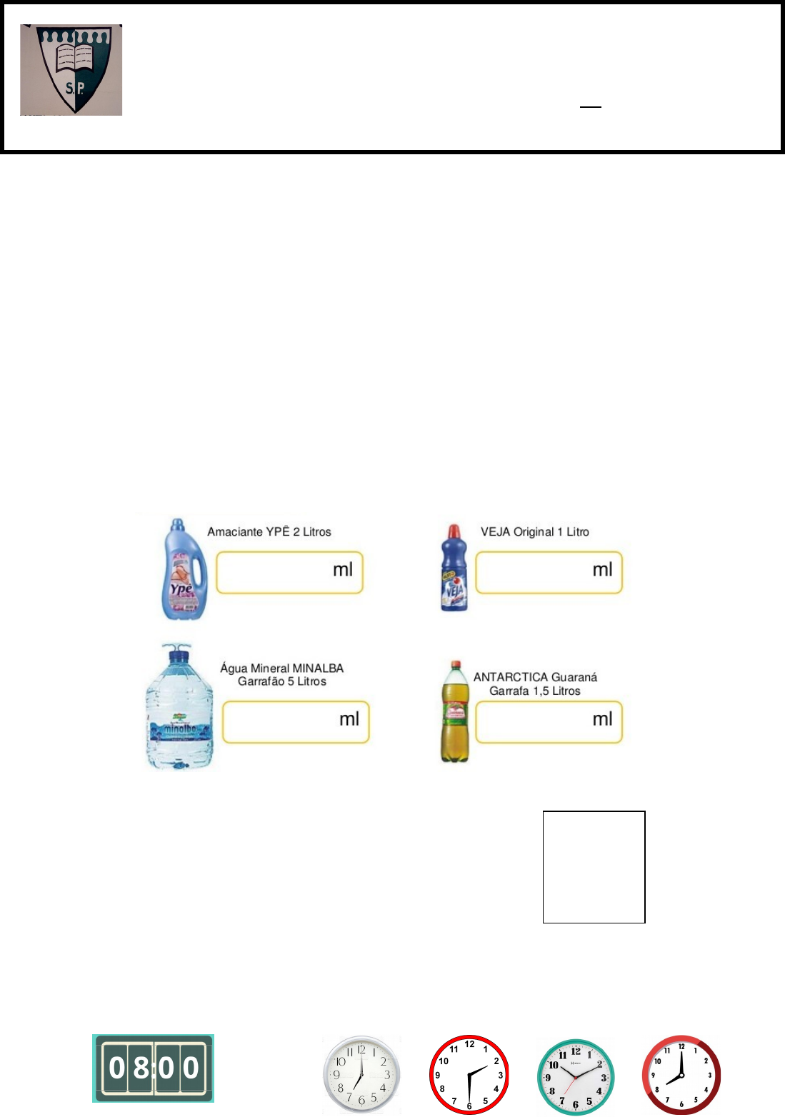 <p>Nome:___________________________________________ Turma: ______________ Disciplina: Matemática Data:_____/ _____/______</p><p>Professora: Liciane Deuner Avaliação/peso: 10 Nota:___________</p><p>Assinatura dos pais ou responsável: __________________________________________</p><p>AVALIAÇÃO TRIMESTRAL - 3º TRIMESTRE 2021</p><p>Esta é nossa última avaliação de Matemática. Responda cada questão com muita calma e atenção. Se necessário leia as orientações mais de uma vez, para depois responder.</p><p>1) Relacione corretamente a coluna da direita com a coluna da esquerda.</p><p>( A ) 2.705 ( ) nove mil, quinhentos e quarenta e seis.</p><p>( B ) 7.429 ( ) dezessete mil, oitocentos e dez.</p><p>( C ) 9.546 ( ) vinte e um mil, quatrocentos e cinquenta e oito.</p><p>( D ) 17.810 ( ) dois mil, setecentos e cinco.</p><p>( E ) 21.458 ( ) sete mil, quatrocentos e vinte e nove.</p><p>2) Em nossas aulas neste trimestre estudamos e realizamos atividades envolvendo unidades de medida de capacidade (litro e mililitro). Agora chegou a hora de relembrar.</p><p>a) Escreva quantos mililitros equivale às capacidades dos produtos abaixo.</p><p>b) Isadora comprou 8 garrafões de Água Mineral Minalba. Sabendo que cada um dos garrafões tem 5 litros , quantos litros de água Isadora comprou?Cálculo</p><p>Resposta: ______________________________________________</p><p>______________________________________________________</p><p>c) Quantos litros temos em 18.000 mililitros?</p><p>( A ) 180 litros. ( B ) 18 litros. ( C ) 81 litros. ( B ) 1,8 litros.</p><p>3) Hora de relembrarmos algumas unidades de medida de tempo. Observe com atenção as horas do relógio digital. Faça um X no relógio analógico que marca a mesma hora do relógio digital.</p><p>RELÓGIO DIGITAL RELÓGIO ANALÓGICO</p><p>4) Leia as unidades de medida do retângulo abaixo e na sequência complete as frases corretamente.bimestre, quinzena, semana, 24 horas, trimestre, milênio, ano, década, semestre, século.</p><p>· Meu irmão vai ficar 7 dias de férias. Ele ficará uma _____________________ de férias.</p><p>· Quinze dias é o mesmo que uma________________________.</p><p>· Dois meses é o mesmo que um__________________, 3 meses é um___________________ e seis meses corresponde a um _____________________.</p><p>· Um dia tem_________________.</p><p>· Dez anos equivale a uma________________________, 100 anos a um____________________ e 1.000 anos a um ______________________.</p><p>· Um____________ tem 365 dias ou 12 meses.</p><p>5) Leia as situações problema, faça os cálculos nos locais indicados. Não esqueça da resposta.</p><p>a) Na Escola Municipal de Ensino Fundamental São Paulo as aulas diariamente têm a duração de 4 horas. Sabendo que 1 hora corresponde a 60 minutos, quantos minutos os alunos ficam na escola?</p><p>Cálculo</p><p>( A ) 40 minutos ( B ) 30 minutos</p><p>(C ) 400 minutos ( D ) 240 minutos</p><p>b) Dona Benta faz docinhos de festa para vender. Em uma semana ela fez 2.350 brigadeiros e 1.645 docinhos de nozes. Quantos docinhos ela fez no total?Cálculo</p><p>Resposta: ________________________________________________</p><p>________________________________________________________</p><p>c) Em uma subtração o minuendo é 8.792 e o subtraendo é 5.864. Qual será o resto?Cálculo</p><p>( A ) O resto será 1.529. ( B ) O resto será 2.928.</p><p>(C ) O resto será 14.656. ( D ) O resto será 2.307</p><p>d) Seu José comprou uma televisão no valor de 2.230 reais. Ele dividiu esse valor em 5 prestações iguais.Cálculo</p><p>Qual o valor de cada prestação?</p><p>6) Em nossas últimas aulas de Matemática, estudamos figuras geométricas e sólidos geométricos. De acordo com o que estudamos e as atividades que realizamos, responda as questões abaixo.</p><p>a) Escreva o nome de 4 elementos (objetos/coisas) presentes em nossa sala de aula, que lembram figuras geométricas. __________________________________________________________________</p><p>__________________________________________________________________________________</p><p>b) Agora escreva quais figuras geométricas esses elementos (objetos/coisas) se parecem. ____________</p><p>__________________________________________________________________________________</p><p>c) Complete corretamente a cruzadinha escrevendo o nome dos sólidos geométricos.</p><p>7) Os sólidos geométricos são objetos tridimensionais, podem ser classificados entre poliedros e não poliedros (corpos redondos). Os elementos principais de um poliedro são: faces, arestas e vértices. Agora, com base no que estudamos e nas atividades realizadas, responda as questões abaixo.</p><p>8) Resolva os cálculos envolvendo as 4 operações com muita atenção.</p><p>a) 34.732</p><p>+ 16.096</p><p>b) 7.546</p><p>- 3.918</p><p>c) 2.634</p><p>x 6</p><p>7</p><p>d) 4984</p><p>e) 3 4 7</p><p>X 1 2__</p><p>f) 7 3 0</p><p>X 2 3</p><p>g) 2 8 3 1 3</p><p>h) 9 3 0 30</p><p>9) Pinte a resposta correta da loto tabuada.</p><p>O ANO ESTÁ CHEGANDO AO FINAL.</p><p>VOU SENTIR SAUDADES!</p><p>Beijos da professora Liciane Deuner...</p><p>image1.emf</p><p>image9.jpg</p><p>image26.png</p><p>image6.png</p><p>image24.jpg</p><p>image10.jpg</p><p>image7.jpg</p><p>image3.png</p><p>image33.png</p><p>image28.png</p><p>image5.png</p><p>image25.png</p><p>image35.png</p><p>image29.png</p><p>image11.png</p><p>image4.jpg</p><p>image20.png</p><p>image27.png</p><p>image13.png</p><p>image14.png</p><p>image15.png</p><p>image16.png</p><p>image12.png</p><p>image21.png</p><p>image22.png</p><p>image17.png</p><p>image18.png</p><p>image19.png</p><p>image32.png</p><p>image31.png</p><p>image30.png</p><p>image34.png</p><p>image23.jpg</p><p>image2.jpg</p><p>image36.png</p><p>image8.jpg</p>