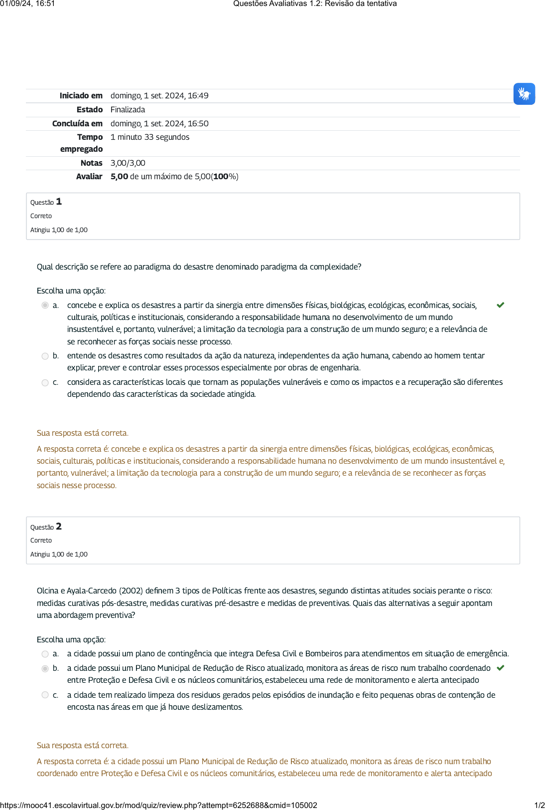 <p>Iniciado em domingo, 1 set. 2024, 16:49</p><p>Estado Finalizada</p><p>Concluída em domingo, 1 set. 2024, 16:50</p><p>Tempo</p><p>empregado</p><p>1 minuto 33 segundos</p><p>Notas 3,00/3,00</p><p>Avaliar 5,00 de um máximo de 5,00(100%)</p><p>Questão 1</p><p>Correto</p><p>Atingiu 1,00 de 1,00</p><p>Questão 2</p><p>Correto</p><p>Atingiu 1,00 de 1,00</p><p>Qual descrição se refere ao paradigma do desastre denominado paradigma da complexidade?</p><p>Escolha uma opção:</p><p>a. concebe e explica os desastres a partir da sinergia entre dimensões físicas, biológicas, ecológicas, econômicas, sociais,</p><p>culturais, políticas e institucionais, considerando a responsabilidade humana no desenvolvimento de um mundo</p><p>insustentável e, portanto, vulnerável; a limitação da tecnologia para a construção de um mundo seguro; e a relevância de</p><p>se reconhecer as forças sociais nesse processo.</p><p></p><p>b. entende os desastres como resultados da ação da natureza, independentes da ação humana, cabendo ao homem tentar</p><p>explicar, prever e controlar esses processos especialmente por obras de engenharia.</p><p>c. considera as características locais que tornam as populações vulneráveis e como os impactos e a recuperação são diferentes</p><p>dependendo das características da sociedade atingida.</p><p>Sua resposta está correta.</p><p>A resposta correta é: concebe e explica os desastres a partir da sinergia entre dimensões físicas, biológicas, ecológicas, econômicas,</p><p>sociais, culturais, políticas e institucionais, considerando a responsabilidade humana no desenvolvimento de um mundo insustentável e,</p><p>portanto, vulnerável; a limitação da tecnologia para a construção de um mundo seguro; e a relevância de se reconhecer as forças</p><p>sociais nesse processo.</p><p>Olcina e Ayala-Carcedo (2002) de�nem 3 tipos de Políticas frente aos desastres, segundo distintas atitudes sociais perante o risco:</p><p>medidas curativas pós-desastre, medidas curativas pré-desastre e medidas de preventivas. Quais das alternativas a seguir apontam</p><p>uma abordagem preventiva?</p><p>Escolha uma opção:</p><p>a. a cidade possui um plano de contingência que integra Defesa Civil e Bombeiros para atendimentos em situação de emergência.</p><p>b. a cidade possui um Plano Municipal de Redução de Risco atualizado, monitora as áreas de risco num trabalho coordenado</p><p>entre Proteção e Defesa Civil e os núcleos comunitários, estabeleceu uma rede de monitoramento e alerta antecipado</p><p></p><p>c. a cidade tem realizado limpeza dos residuos gerados pelos episódios de inundação e feito pequenas obras de contenção de</p><p>encosta nas áreas em que já houve deslizamentos.</p><p>Sua resposta está correta.</p><p>A resposta correta é: a cidade possui um Plano Municipal de Redução de Risco atualizado, monitora as áreas de risco num trabalho</p><p>coordenado entre Proteção e Defesa Civil e os núcleos comunitários, estabeleceu uma rede de monitoramento e alerta antecipado</p><p>01/09/24, 16:51 Questões Avaliativas 1.2: Revisão da tentativa</p><p>https://mooc41.escolavirtual.gov.br/mod/quiz/review.php?attempt=6252688&cmid=105002 1/2</p><p>Questão 3</p><p>Correto</p><p>Atingiu 1,00 de 1,00</p><p>O Marco de Ação de Hyogo (2005) e o Marco de Ação de Sendai (2015) são referência internacional e nacional para a gestão integrada</p><p>de riscos e desastres trazendo prioridades de ação, tais como:</p><p>Escolha uma opção:</p><p>a. priorizar a redução dos riscos em nível nacional e local com foco no conhecer o risco e tomar medidas de prevenção e</p><p>preparação;</p><p></p><p>b. desenvolver maior compreensão e conscientização sobre o que fazer apenas no momento do desastre</p><p>c. reduzir o risco sem tomar medidas relacionadas ao enfrentamento da sua materialização em situações de desastre</p><p>Sua resposta está correta.</p><p>A resposta correta é: priorizar a redução dos riscos em nível nacional e local com foco no conhecer o risco e tomar medidas de</p><p>prevenção e preparação;</p><p>01/09/24, 16:51 Questões Avaliativas 1.2: Revisão da tentativa</p><p>https://mooc41.escolavirtual.gov.br/mod/quiz/review.php?attempt=6252688&cmid=105002 2/2</p>