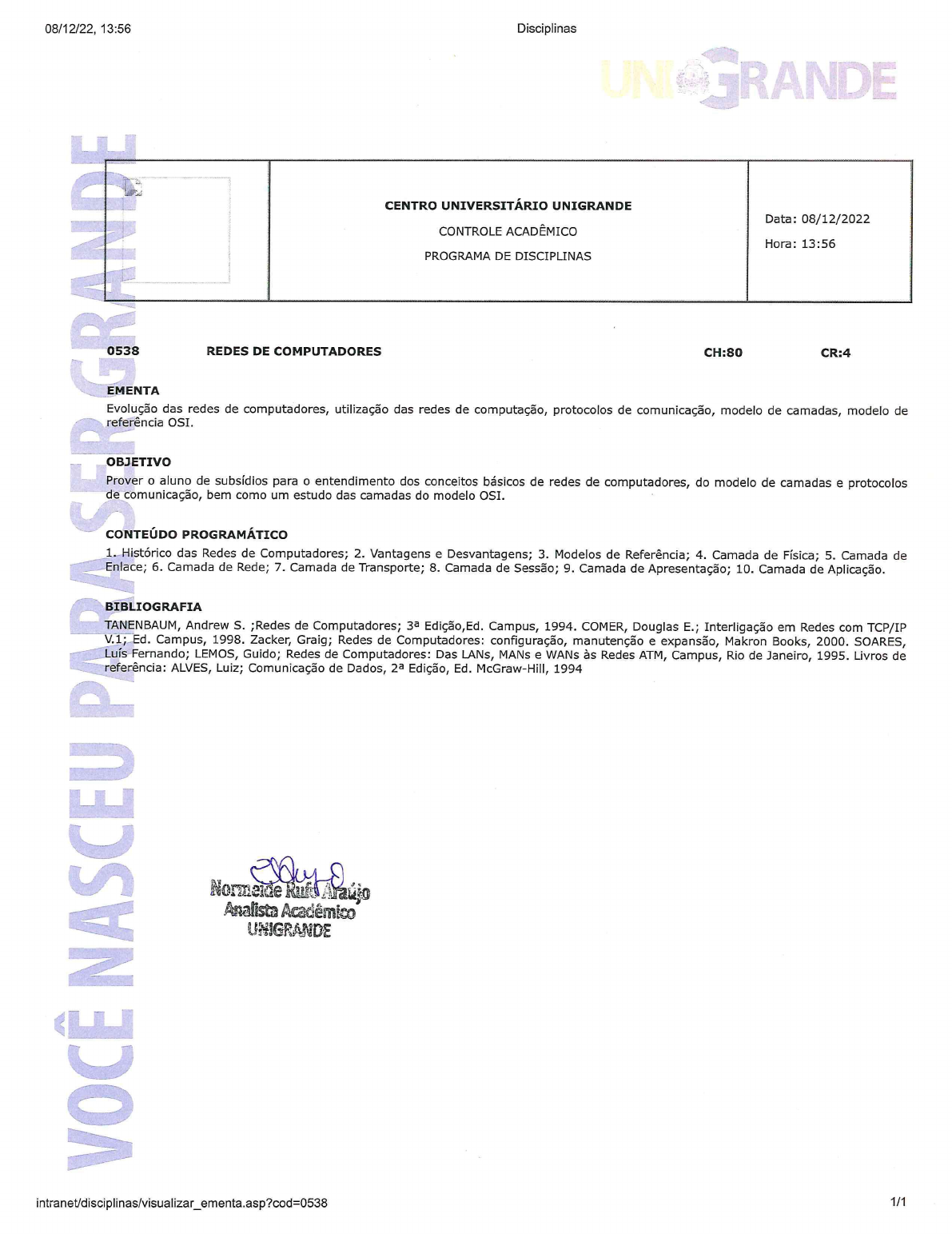 <p>08/12/22, 13:56 Disciplinas CENTRO UNIVERSITÁRIO UNIGRANDE Data: 08/12/2022 CONTROLE ACADÊMICO Hora: 13:56 PROGRAMA DE DISCIPLINAS 0538 REDES DE COMPUTADORES CH:80 CR:4 EMENTA Evolução das redes de computadores, utilização das redes de computação, protocolos de comunicação, modelo de camadas, modelo de referência OSI. OBJETIVO Prover o aluno de subsídios para o entendimento dos conceitos básicos de redes de computadores, do modelo de camadas e protocolos de comunicação, bem como um estudo das camadas do modelo OSI. CONTEÚDO PROGRAMÁTICO 1. Histórico das Redes de Computadores; 2. Vantagens e Desvantagens; 3. Modelos de Referência; 4. Camada de Física; 5. Camada de Enlace; 6. Camada de Rede; 7. Camada de Transporte; 8. Camada de Sessão; 9. Camada de Apresentação; 10. Camada de Aplicação. BIBLIOGRAFIA TANENBAUM, Andrew S. de Computadores; Edição,Ed. Campus, 1994. COMER, Douglas E.; Interligação em Redes com TCP/IP V.1; Ed. Campus, 1998. Zacker, Graig; Redes de Computadores: configuração, manutenção e expansão, Makron Books, 2000. SOARES, Fernando; LEMOS, Guido; Redes de Computadores: Das LANs, MANs e WANs às Redes ATM, Campus, Rio de Janeiro, 1995. Livros de referência: ALVES, Luiz; Comunicação de Dados, Edição, Ed. McGraw-Hill, 1994 Normeide Araújo Analista Acadêmico UNIGRANDE 1/1</p>
