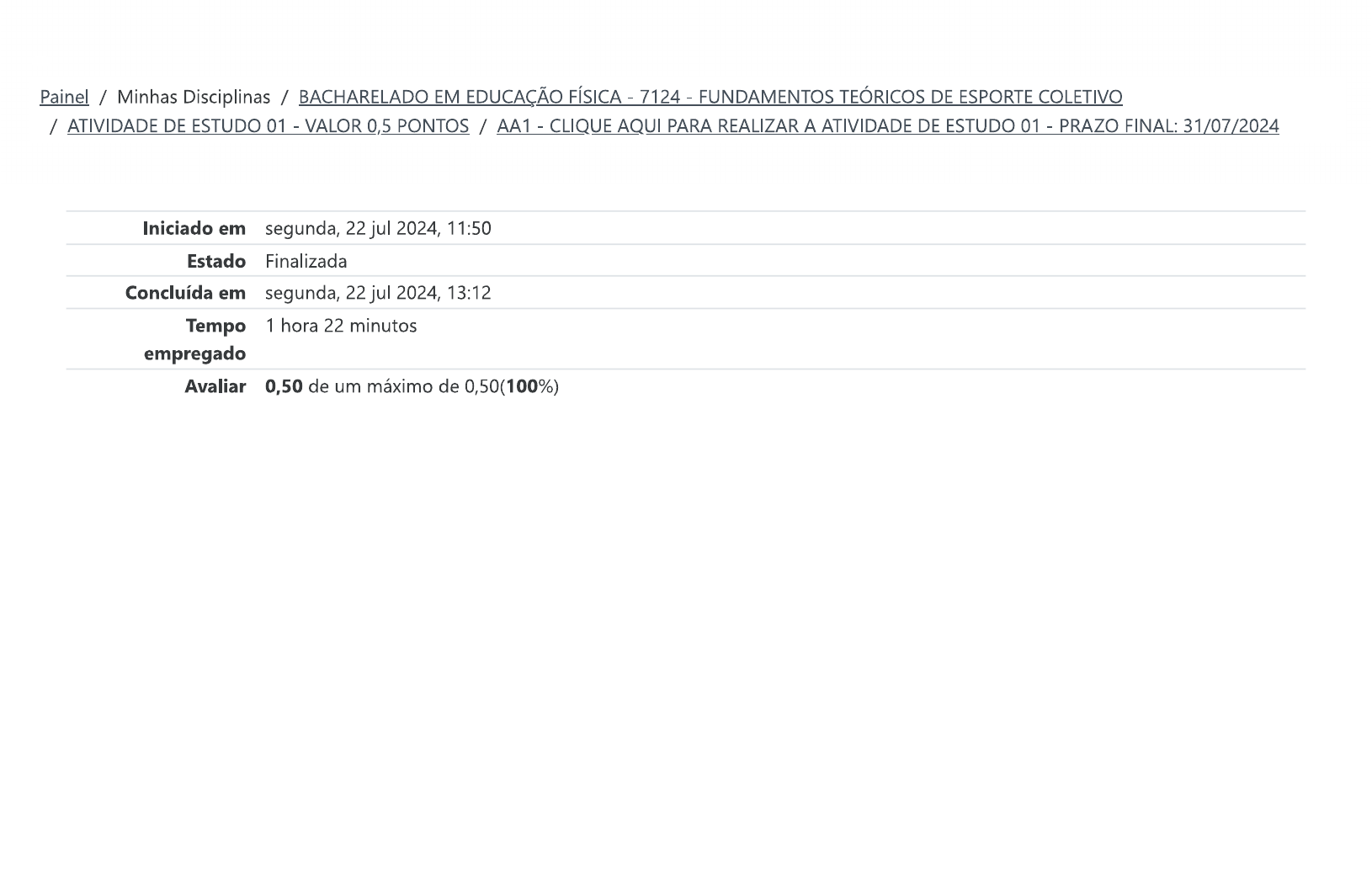<p>Painel / Minhas Disciplinas / BACHARELADO EM EDUCAÇÃO FÍSICA - 7124 - FUNDAMENTOS TEÓRICOS DE ESPORTE COLETIVO / ATIVIDADE DE ESTUDO 01 - VALOR 0,5 PONTOS / AA1 - CLIQUE AQUI PARA REALIZAR A ATIVIDADE DE ESTUDO 01 - PRAZO FINAL: 31/07/2024 Iniciado em segunda, 22 jul 2024, 11:50 Estado Finalizada Concluída em segunda, 22 jul 2024, 13:12 Tempo 1 hora 22 minutos empregado Avaliar 0,50 de um máximo de 0,50(100%)</p><p>Questão 1 Completo Atingiu 0,05 de basquetebol, ou basquete, como é mais conhecido, é um jogo em que duas equipes, compostas cada uma por cinco 0,05 jogadores, devem arremessar a bola em uma cesta suspensa. Cada cesta realizada é convertida em pontos, que definem, ao final de uma partida, a equipe que mais marcou como a vencedora 2019). Ainda de acordo com Gonçalves (2019), sua origem data do final do século XIX, quando um professor de Educação Física propôs um novo jogo frente às dificuldades encontradas à época, o nome desse professor é? a. Nenhuma das alternativas está correta b. James Naismith. C. Michael Jordan d. Willian Morgan e. Charlles Muiller Sua resposta está correta.</p><p>Questão 2 Completo Atingiu 0,05 de REGRAS - objetivo do basquete é fazer com que a bola atravesse o interior de um aro localizado em uma tabela a uma 0,05 altura de m do solo, convertendo, assim, pontos para a equipe que alcançou tal feito.? a. 2,90 m do solo b. 3,05 m do solo C. 3,15 m do solo d. 3,10 m do solo e. 3,00 m do solo Sua resposta está correta.</p><p>Questão 3 Completo Atingiu 0,05 de Em uma posição especifica no futebol, o atleta interage com o jogo, criando um novo sistema dinâmico de relações, atua 0,05 em função do desenvolvimento de suas habilidades, tentando solucionar de uma ou de outra forma, fazendo uso dos fundamentos técnicos, como a pegada da bola, a defesa, a saída de gol, a situação de um a um e a uma reposição de jogo (ARRUDA, 2010). De qual posição estamos falando? a. Atacantes b. Goleiros C. Zagueiros d. Meio campistas e. Laterais Sua resposta está correta.</p><p>Questão 4 Completo Atingiu 0,05 de A ação motora que o jogador realiza em direção ao gol, dispondo de uma situação clara que permita o lançamento à meta 0,05 com suficiente potência, precisão e rapidez. Pode ser classificado quanto a superfície de contato (peito e ponta do pé), altura da bola (baixa, média e alta) e direção da bola (linha reta, cruzada ou diagonal e com efeito). De qual fundamento técnico individual estamos nos referindo? (ARRUDA, 2010). a. Condução de bola b. Controle de bola C. Drible d. Chute e. Cabeceio Sua resposta está correta.</p><p>Questão 5 Completo Atingiu 0,05 de Em meio a crises econômicas e à bagunça administrativa, o futebol brasileiro se transformou em exportador de craques, a 0,05 chamada "década perdida". fenômeno coincidiu com a "desnacionalização" do futebol por meio da formação de times europeus a partir da colheita de atletas de todas as partes do mundo. Jogadores como Falcão, Sócrates e Zico se transferiram para Roma, Fiorentina e Udinese respectivamente, em que década esse fenômeno aconteceu? (GUTERMAN, 2009). a. Década de 1980 b. Década de 1990 C. Década de 1950 d. Década de 1960 e. Década de 1970 Sua resposta está correta.</p><p>Questão 6 Completo Atingiu 0,05 de Fundamentos individuais no futebol são utilizados pelos jogadores de uma equipe em benefício próprio, a fim de executar 0,05 uma ação motora sem ajuda de um companheiro, ou seja, em forma individual, e até onde as regras lhes permitem (ARRUDA, 2010). Nesse sentido, qual conjunto de fundamentos técnicos não são inerentes aos jogadores de linha no futebol? a. Condução de bola com o interior do pé e Drible b. Chute com a ponta do pé e Controle de Bola C. Dribles Complexos (finta) e Chute com o peito do pé d. Cabeceio e Condução de bola com a planta do pé e. Saque e Cortada Sua resposta está correta.</p><p>Questão 7 Completo Atingiu 0,05 de Qual alternativa representa os sistemas de marcação mais utilizados no Handebol? 0,05 a. (2x2x1), e combinados b. Nenhuma das alternativas estão corretas C. (4 X 4 X 2), (3 X 5 X 2) e combinados d. (2 X 2), e combinados e. combinados Sua resposta está correta.</p><p>Questão 8 Completo Atingiu 0,05 de No Handebol, não é permitido a qualquer equipe manter a posse de bola sem uma tentativa reconhecida de atacar ou 0,05 anotar gol (INTERNATIONAL HANDBALL FEDERATION, 2010), essa ação é chamada de? a. Jogo Passivo b. Nenhuma das alternativas estão corretas C. Marcação do Adversário d. Manejo de Bola e. Impedimento Sua resposta está correta.</p><p>Questão 9 Completo Atingiu 0,05 de A posição do goleiro no terreno de jogo em relação à bola e ao gol, mantendo sempre uma bissetriz, sem se descuidar da 0,05 posição básica e da trajetória da bola, refere-se a qual "técnica do goleiro sem bola"? (ARRUDA, 2010). a. Saída de gol b. Deslocamento C. Posição básica d. Enfrentamento e. Colocação do goleiro Sua resposta está correta.</p><p>Questão 10 Completo Atingiu 0,05 de As técnicas podem ser entendidas como os movimentos cujos resultados são obtidos a partir de ações mais econômicas e 0,05 efetivas (FILIN, 1996). Como técnicas coletivas do basquetebol, podemos entender aqueles movimentos que visam o resultado e que necessitam da participação de dois ou mais jogadores, são elas? a. Recepção, passe, rebote, situações de jogo (1x1, 2x2, 3x2) b. Recepção, cortada; rebote, situações de jogo (1x1, 2x2, 3x2) C. Saque, passe; rebote, situações de jogo (1x1, 2x2, 3x2) d. Nenhuma das alternativas estão corretas e. Recepção, passe; chute, situações de jogo (1x1, 2x2, 3x2) Sua resposta está correta. ÁUDIO AULA 04 Seguir para... SLIDE AULA</p>