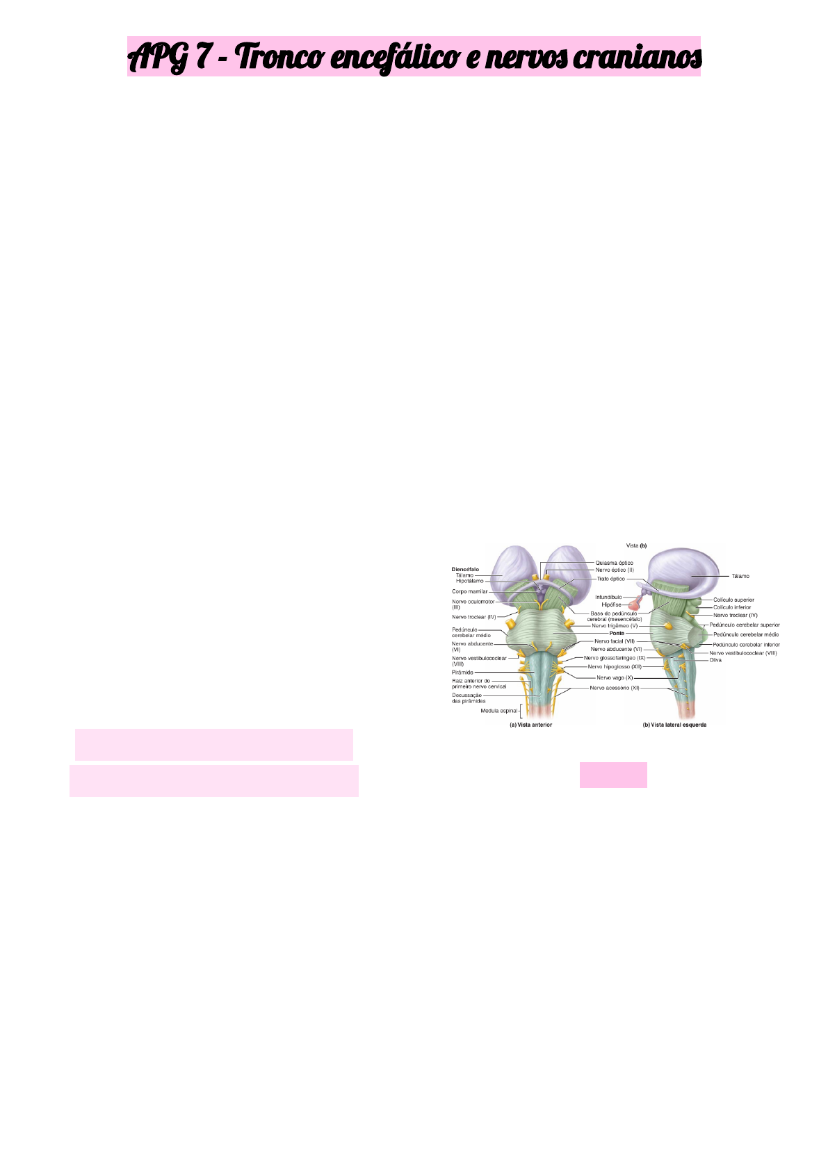 <p>APG 7 - Tronc� encefálic� � nerv� cranian�</p><p>Objetivos:</p><p>1. Conhecer a macroscopia e as funções do</p><p>tronco encefálico</p><p>2. Compreender o funcionamento dos 12</p><p>pares de nervos cranianos</p><p>a. Nervos cranianos que estão</p><p>envolvidos nos sentidos especiais</p><p>Tronco encefálico e nervos relacionados.......... 1</p><p>Bulbo.................................................................1</p><p>Ponte................................................................ 4</p><p>Mesencéfalo..................................................... 5</p><p>Nervos cranianos..................................................6</p><p>Nervo olfatório (I).............................................. 7</p><p>Nervo óptico (II)................................................ 8</p><p>Nervo oculomotor (III), troclear (IV) e</p><p>abducente (VI).................................................. 9</p><p>Nervo trigêmeo (V)......................................... 10</p><p>Nervo facial (VII)............................................. 12</p><p>Nervo vestibulococlear (VIII)...........................12</p><p>Nervo glossofaríngeo (IX)...............................13</p><p>Nervo vago (X)................................................14</p><p>Nervo acessório (XI)....................................... 15</p><p>Nervo hipoglosso (XII).................................... 15</p><p>APG 7 - Tronco encefálico e nervos</p><p>cranianos.............................................. 1</p><p>________________________________</p><p>Tronco encefálico e</p><p>nervos relacionados</p><p>A parte mais caudal do encéfalo é o tronco</p><p>encefálico, que possui três regiões, da posição</p><p>caudal para a rostral: bulbo, ponte e</p><p>mesencéfalo. Cada região tem</p><p>aproximadamente 2,5 cm de comprimento, e</p><p>juntas correspondem a apenas 25% da massa</p><p>encefálica total. Situado na fossa do crânio</p><p>posterior, na parte basilar do osso occipital, o</p><p>tronco encefálico desempenha quatro funções</p><p>gerais:- Marieb</p><p>1. Age como uma via de passagem para</p><p>todos os tratos fibrosos que vão do</p><p>cerebelo até a medula espinal.</p><p>2. Participa da inervação da face e da</p><p>cabeça, com 10 a 12 pares de nervos</p><p>cranianos conectando-se a ele.</p><p>3. Produz comportamentos rigidamente</p><p>programados e automáticos, necessários</p><p>para a sobrevivência.</p><p>4. Integra os reflexos auditivos e visuais.</p><p>O tronco encefálico apresenta o mesmo plano</p><p>estrutural da medula espinal, com substância</p><p>branca externa circundando uma região</p><p>interna de substância cinzenta. Os núcleos de</p><p>substância cinzenta também estão situados na</p><p>substância branca do tronco encefálico. -</p><p>Marieb</p><p>Bulbo</p><p>O bulbo raquidiano, ou bulbo, é a parte mais</p><p>caudal do tronco encefálico, contínuo com a</p><p>medula espinal ao nível do forame magno do</p><p>crânio. Uma parte do quarto ventrículo</p><p>localiza-se dorsalmente à metade superior do</p><p>bulbo. Os tratos fibrosos de substância branca</p><p>que conectam as regiões mais rostrais do</p><p>encéfalo com a medula espinal passam pelo</p><p>bulbo.- Marieb</p><p>Externamente, duas cristas longitudinais</p><p>chamadas pirâmides ladeiam a linha média</p><p>anterior do bulbo. Essas cristas são formadas</p><p>pelos tratos piramidais, que descem através do</p><p>tronco encefálico e da medula espinal,</p><p>transmitindo impulsos motores voluntários.</p><p>Na parte caudal do bulbo, 70%-90% dessas</p><p>fibras piramidais atravessam para o lado</p><p>oposto do encéfalo em um ponto chamado</p><p>decussação das pirâmides, resultando no</p><p>controle dos movimentos voluntários do lado</p><p>oposto do corpo por cada hemisfério cerebral.-</p><p>Marieb</p><p>Ao lado de cada pirâmide encontra-se a oliva,</p><p>que contém o núcleo olivar inferior, uma</p><p>prega de substância cinzenta. Esse núcleo é</p><p>uma estação retransmissora das informações</p><p>sensoriais que seguem para o cerebelo,</p><p>especialmente as informações proprioceptivas.</p><p>Outros núcleos, conhecidos como</p><p>retransmissores, também processam e editam</p><p>as informações antes de passá-las adiante. Os</p><p>pedúnculos cerebelares inferiores</p><p>conectam o bulbo ao cerebelo.- Marieb</p><p>Internamente, dois núcleos retransmissores</p><p>importantes na parte caudal, que são o núcleo</p><p>grácil e o núcleo cuneiforme. As fibras</p><p>ascendentes transmitem a sensibilidade geral</p><p>discriminativa da pele e os proprioceptores se</p><p>comunicam por sinapse nesses núcleos</p><p>bulbares até o cérebro. - Marieb</p><p>Substância Cinzenta Homóloga à da</p><p>Medula (Núcleos de Nervos Cranianos)</p><p>A seguir, estão as principais características dos</p><p>núcleos situados no bulbo:</p><p>a) Núcleo ambíguo - núcleo motor para a</p><p>musculatura estriada de origem branquial.</p><p>Dele saem as fibras eferentes viscerais</p><p>especiais dos IX, X e XI pares cranianos,</p><p>destinadas à musculatura da laringe e da</p><p>faringe. Situa-se profundamente no interior do</p><p>bulbo.</p><p>b) Núcleo do hipoglosso - núcleo motor</p><p>onde se originam as fibras eferentes somáticas</p><p>para a musculatura da língua. Localiza-se no</p><p>trígono do hipoglosso, no assoalho do IV</p><p>ventrículo, e suas fibras dirigem-se</p><p>ventralmente para emergir no sulco lateral</p><p>anterior do bulbo, entre a pirâmide e a oliva.</p><p>c) Núcleo dorsal do vago - núcleo motor</p><p>pertencente ao parassimpático, onde estão os</p><p>neurônios pré-ganglionares, cujos axônios</p><p>saem pelo nervo vago. Corresponde à coluna</p><p>lateral da medula e localiza-se no trigono do</p><p>vago, no assoalho do IV ventrículo.</p><p>d) Núcleos vestibulares - núcleos sensitivos</p><p>que recebem as fibras que penetram pela</p><p>porção vestibular do 