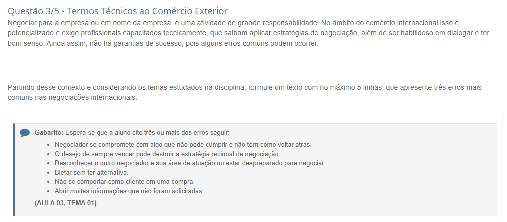 <p>Questão 3/5 - Termos Técnicos ao Comércio Exterior Negociar para a empresa ou em nome da empresa, é uma atividade de grande No âmbito do comércio internacional isso é potencializado e exige profissionais capacitados tecnicamente, que saibam aplicar estratégias de negociação, além de ser habilidoso em dialogar e ter bom senso. Ainda assim, não há garantias de sucesso, pois alguns erros comuns podem Partindo desse contexto e considerando os temas estudados na disciplina, formule um texto com no máximo 5 linhas, que apresente três erros mais comuns nas negociações Gabarito: Espera-se que a aluno cite três ou mais dos erros seguir: Negociador se compromete com algo que não pode cumprir e não tem como voltar desejo de sempre vencer pode destruir a estratégia racional de negociação. Desconhecer outro negociador e sua área de atuação ou estar despreparado para negociar. Blefar sem ter Não se comportar como cliente em uma compra. Abrir muitas informações que não foram solicitadas. (AULA 03, TEMA 01)</p>