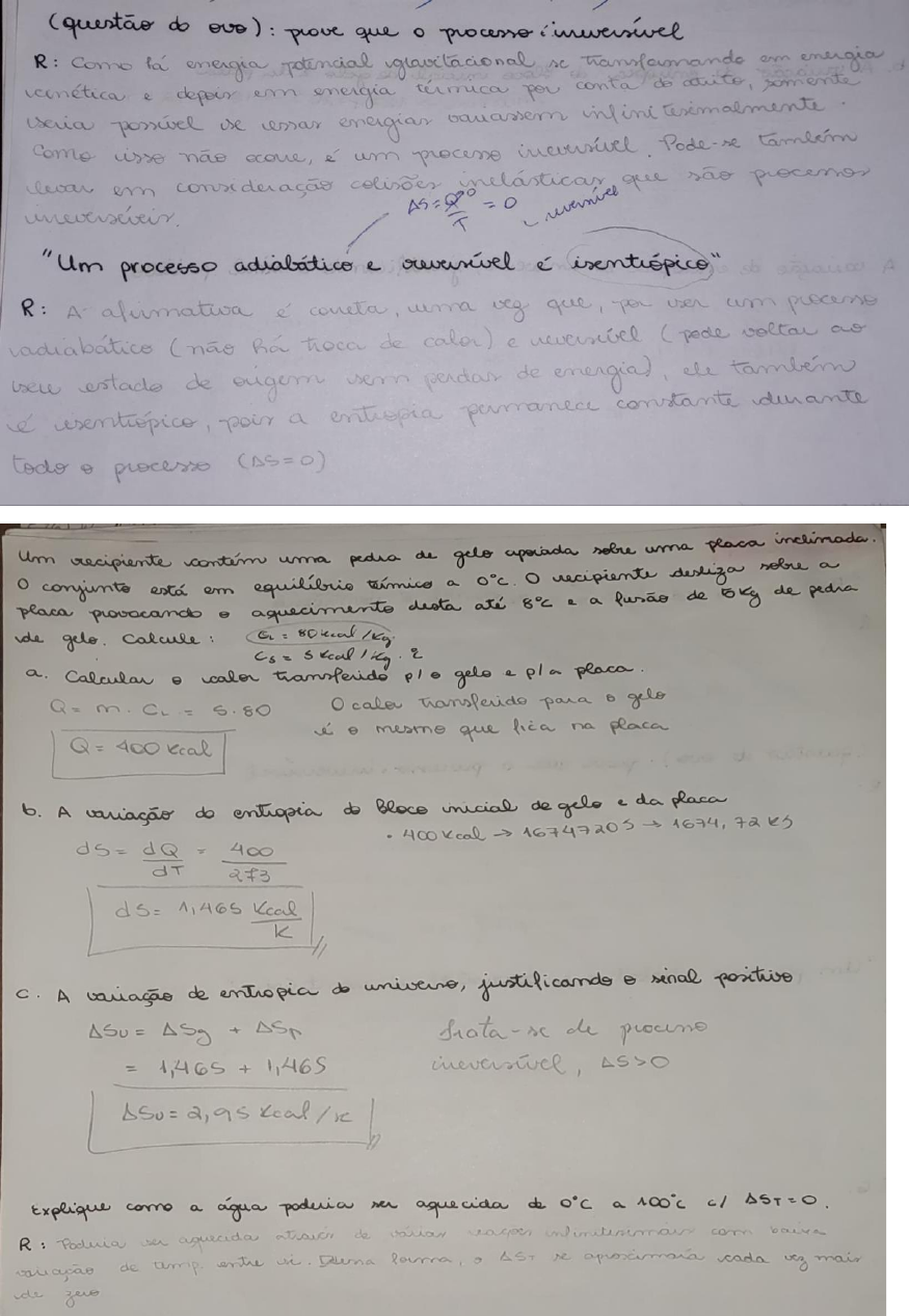 <p>do prove que processo energia potencial sc energia e energia termica conta somente se energias inlini isso não um Pode-se em consideração que sao "um processo e A A e uma veg user am (nao Ra de calor) e voltan estado de de e a constante todo processo (AS=0) um recipiente uma de gelo sobre uma placa placa desta até 8°C a de de pedra em termico a recipiente sobre a de 80kcal = kcal a. Calcular calor pl gelo e pl. a m. = 5.80 para 8 gelo i que na placa Q = 400 kcal b. A variação do entropia do inicial de gelo e da placa 16747205 1674, 72 es ds = dQ = 400 dT 273 d = 465 K C. A de entropia do sinal positive ASu + ASp de process = 1,465 + 1,465 = 2, as Explique a agua poderia aquecida de 0°C a AST=O. R : de de AST cada very de</p><p>is a) THE BOOK 95000 95000 300 w Q 1,583 ( ) Qc 1,583 10 TH 750 300 Qc 6,33 10" n = = 95000 QH QH QH= 2,71 95000 Qc 1,764 5 19) adiabatica w - Ts AH = Ta R R 1973 - 8,314 T4 1973 873, 1273 = 20,785 700 14549 todo processo (AS=0) 5.6. do R : uma na fonte a maquina mar na na seria com lisso a pratica de aumentar a eliciencia e dH= du = Tds. + vdp + Dd V dH = Tds + ( dH = T 1) VF dH = Tds + dT P dT dT dT dT a) as or c) - de T a baixa temperatura pl a uma refrigerador as uma excelente maquina = P como T at P = T d) No que em P no ! e) P.E. para em Temperatura Oconi baseia no ciclo de do</p><p>6.17. Estime a variação da entropia na vaporização de benzeno a 50°C. A pressão de vapor do benzeno é dada pela equação: 2.788,51 In (a) Use a Eq. (6.72) com um valor estimado de (b) Use a equação de Clausius/Clapeyron mostrada no Exemplo 6.5. 6.17 0,172 8,314.323 0,3616 9940,74 b. 8,314 323 10211,44 0,3616 6.7. Estime as variações na entalpia e na entropia quando líquida a comprimida de sua pres- são de saturação de 381 kPa até 1.200 kPa. Para a líquida saturada a 270 K, = 6.9. Em um dispositivo 1 quilograma de água inicialmente a 1 bar e 25°C, é comprimido em um processo mecanicamente reversível, até 1.500 bar. Dados B= 250 determine AU, e AS. Uma consideração satisfatória é que V seja constante e igual ao seu valor médio aritmético.</p><p>drive 6.f. 1,551 6.9. 287 2 AH = VARe 970,287 970,287 - I Kg.K = AH - = 1346 - 134600 - 1405000 kg 49,17 Kg 6.23. Um recipiente contém kg de água, com a presença de líquido e vapor em equilíbrio a 1.000 kPa. Sa- bendo-se que vapor ocupa 70% do volume do recipiente, determine He S para a massa total de H2O (1 kg de H2O).</p><p>194,29 763,605 70 30 7,889 7,889 0,013 + 752,69 + 36,09 788,78 gm - + 0,013 6,5828 = 2,196 6.39. Em um dispositivo quatro quilogramas de vapor inicialmente a 400 kPae 175°C. passam por uma compressão isotérmica. mecanicamente reversível, até uma pressão final na qual o vapor se torna saturado. Determine 0 e W para esse processo. U2 U-2605,8 h/gm 447,15 2577,8 448,15 S=7,0548 449,15 957913 52 6,6302 448,15 y 449,15 X= 2578,55 05= 0,0162 6.6383 = - - W=</p><p>6.40. Vapor muda de um estado inicial a 450°C e 3.000 kPa para um estado final a 140°C e 235 kPa. Determine e AS: (a) Com dados da tabela de vapor. (b) Com equações para um gás ideal. (c) Com correlações generalizadas apropriadas. 6.41. Um dispositivo opera de forma com vapor d'água como fluido de trabalho, exe- cutando as seguintes etapas: vapor, a 550 kPa e 200°C, é aquecido a volume constante até uma pressão de 800 kPa. Então, o vapor se expande, reversivelmente e adiabaticamente, até a temperatura inicial de 200°C. Finalmente. o vapor é comprimido em um processo mecanicamente reversível, até a pressão inicial de 550 kPa. Qual é a eficiência térmica do ciclo? T P H2 T P S2 125 225 2713,8 225 9,0928 140 235 x 125 150 250 276415 140 235 Y 150 250 7,1689 225-235 = 225-235 225-250 -0,0761 7,1232 = 0,0378 6.41. 264,0 7,0108 8,314 T2 T1 2/7 350 P2 800</p><p>6.50. Gás propano, a bar e 35°C, é comprimido até um estado final de 135 bar e 195°C. Estime o volume molar do propano no estado final e as variações de entalpia e de entropia para processo. No seu estado inicial, o propano pode ser considerado um gás ideal. 6.50 Pr=3,0 Pr 0,5425 Tr 3,0 0,7069 1126 3,178 1,26 0,6344 1,3 06 Pr=3 Tr 3 0,168 Tr Z -0,0141 3,178 0,1095 1,26 112 1,26 1,3 5 0,047 113 0,2079 0,047 X= 0,168 0,1sf = = V= RTZ 182,79 P 135 A Cp dT + w R R = GI R / R = R R R AS= ASGI + SR =</p><p>6.35. Um vaso rígido com 0,4 de volume encontra-se cheio de vapor a 800 kPa e 350°C. Que quan- tidade de calor deve ser retirada do vapor para levar a sua temperatura para 200°C? 800 KPa U1= P U2 P V 575 2639,6 575 367,9 U2 354,34 600 352,04 600 2638,5 66 AU= - 240,24 = - V1</p>