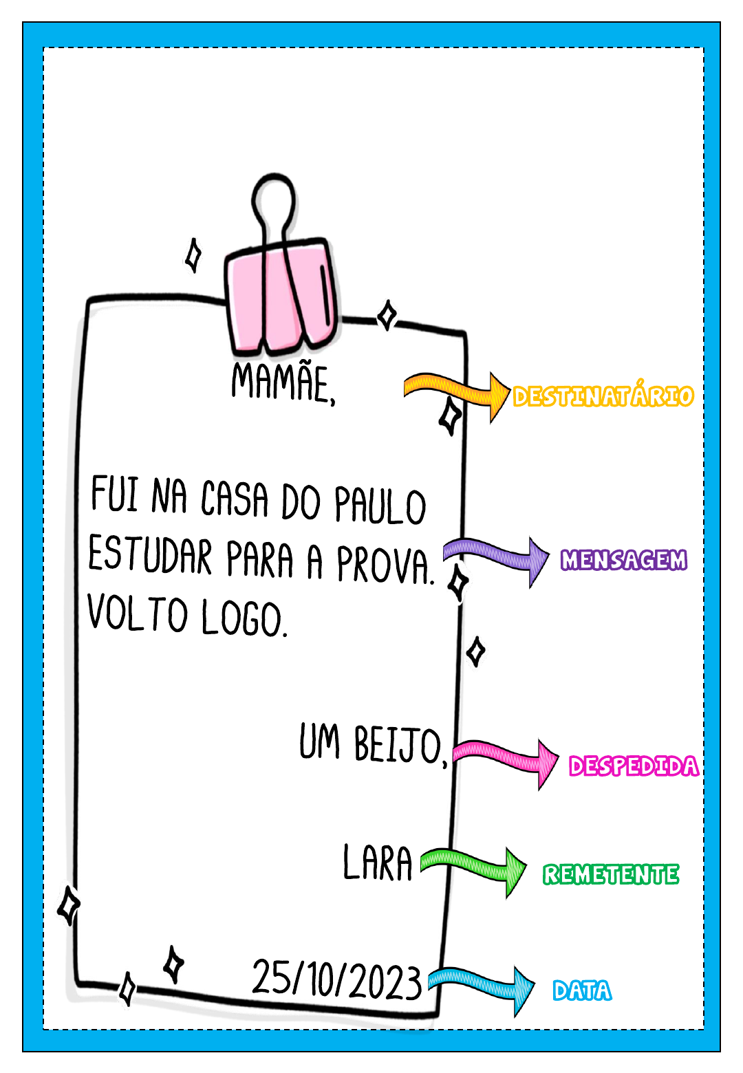 <p>BILHETE</p><p>@</p><p>PR</p><p>OF</p><p>.A</p><p>M</p><p>AN</p><p>DA</p><p>.R</p><p>AM</p><p>AL</p><p>HO</p><p>ESCOLA:_____________________________________</p><p>NOME:______________________________________</p><p>ANO:________ DATA:___/___/____</p><p>ATIVIDADE</p><p>1- OBSERVE O BILHETE E RESPONDA:</p><p>PROFESSORA,</p><p>A MARINA IRÁ AO MÉDICO</p><p>HOJE E NÃO PODERÁ IR À AULA.</p><p>UM ABRAÇO,</p><p>VERA</p><p>25/10/2023</p><p>A) MARINA NÃO VAI A ESCOLA PORQUE?</p><p>B) QUANTOS DIAS MARINA FALTARÁ A</p><p>ESCOLA?</p><p>C) COPIE A DATA EM QUE O BILHETE</p><p>FOI ENVIADO:</p><p>D) PINTE DE AMARELO O NOME DO</p><p>REMETENTE;</p><p>E) PINTE DE AZUL O NOME DO</p><p>DESTINATÁRIO;</p><p>F) CIRCULE AS PALAVRAS DE DESPEDIDA;</p><p>2- PARA QUE SERVIU O BILHETE ACIMA?</p><p>CONVIDAR AVISAR LEMBRAR</p><p>3- IMAGINE QUE MARINA SEJA SUA COLEGA DE CLASSE. ESCREVA UM</p><p>BILHETE PARA DEMONSTRAR SEU CARINHO POR ELA E ANIMÁ-LA:</p><p>@</p><p>PR</p><p>O</p><p>F.A</p><p>M</p><p>AN</p><p>DA</p><p>.R</p><p>AM</p><p>AL</p><p>H</p><p>O</p><p>4- LEIA OS BILHETES ABAIXO:</p><p>@</p><p>PR</p><p>O</p><p>F.A</p><p>M</p><p>AN</p><p>DA</p><p>.R</p><p>AM</p><p>AL</p><p>H</p><p>O</p><p>BIA</p><p>QUER BRINCAR LÁ EM CASA</p><p>NO SÁBADO?</p><p>UM ABRAÇO,</p><p>LÚCIA</p><p>A) EM CADA BILHETE, CIRCULE DE VERMELHO O NOME DO REMETENTE;</p><p>B) EM CADA BILHETE, CIRCULE DE AZUL O NOME DO DESTINATÁRIO;</p><p>5- MARQUE OS NÚMEROS DE ACORDO COM A INTENÇÃO DE CADA</p><p>BILHETE:</p><p>AVISAR</p><p>MOSTRAR CARINHO LEMBRAR</p><p>CONVIDAR</p><p>PRODUZA UM BILHETE PARA ALGÚEM ESPECIAL!</p><p>TERMO DE USO</p><p>OBRIGADA PELA COMPRA!</p><p>ESTE ARQUIVO FOI CRIADO PELA:</p><p>@PROF.AMANDA.RAMALHO</p><p>AO COMPRÁ-LOS, VOCÊ ADQUIRE A LICENÇA PARA USO</p><p>PESSOAL SENDO PROIBIDA A VENDA, DOAÇÃO OU</p><p>DISTRIBUIÇÃO DESTE MATERIAL EM SUA FORMA DIGITAL OU</p><p>FÍSICA.</p><p>É PROIBIDO COMPARTILHAR EM REDES SOCIAIS.</p><p>EM CASO DE PUBLICAÇÕES EM REDES SOCIAIS, SOLICITO QUE</p><p>MENCIONE A AUTORIA,DANDO CRÉDITOS AO MEU INSTAGRAM</p><p>@PROF.AMANDA.RAMALHO.</p><p>TUDO FEITO COM MUITO AMOR PARA VOCÊ!</p><p>DIREITOS AUTORAIS PROTEGIDOS PELA LEI 9610/98</p><p>DIREITOS DE IMAGENS:</p>