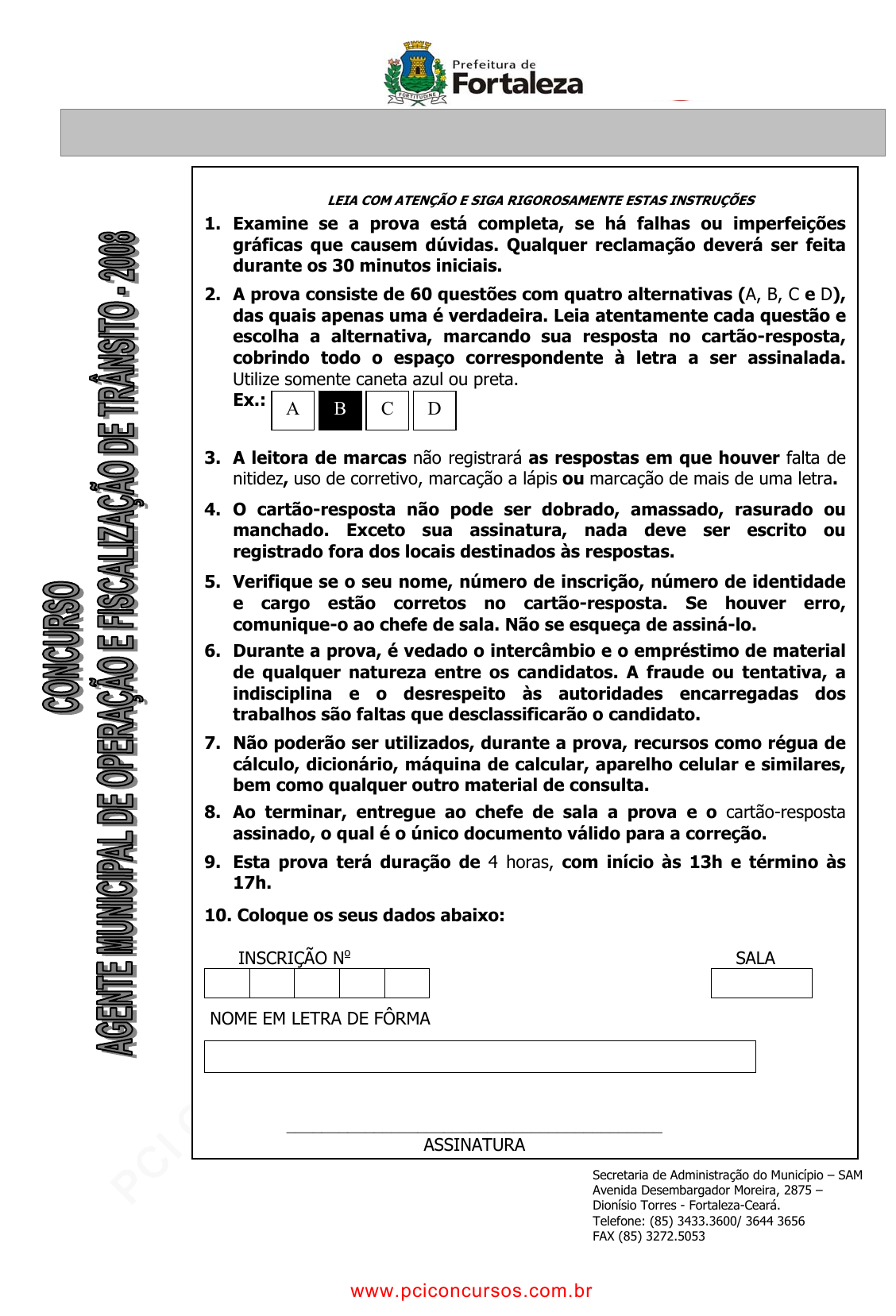 <p>pcimarkpci MjgwNDowNmJjOjYwMDQ6N2VkMDozNTg1OjJmNzM6M2Y1ODo3M2Qz:U3VuLCAwMSBTZXAgMjAyNCAxOToyMTowMyAtMDMwMA==</p><p>www.pciconcursos.com.br</p><p>LEIA COM ATENÇÃO E SIGA RIGOROSAMENTE ESTAS INSTRUÇÕES</p><p>1. Examine se a prova está completa, se há falhas ou imperfeições</p><p>gráficas que causem dúvidas. Qualquer reclamação deverá ser feita</p><p>durante os 30 minutos iniciais.</p><p>2. A prova consiste de 60 questões com quatro alternativas (A, B, C e D),</p><p>das quais apenas uma é verdadeira. Leia atentamente cada questão e</p><p>escolha a alternativa, marcando sua resposta no cartão-resposta,</p><p>cobrindo todo o espaço correspondente à letra a ser assinalada.</p><p>Utilize somente caneta azul ou preta.</p><p>Ex.:</p><p>3. A leitora de marcas não registrará as respostas em que houver falta de</p><p>nitidez, uso de corretivo, marcação a lápis ou marcação de mais de uma letra.</p><p>4. O cartão-resposta não pode ser dobrado, amassado, rasurado ou</p><p>manchado. Exceto sua assinatura, nada deve ser escrito ou</p><p>registrado fora dos locais destinados às respostas.</p><p>5. Verifique se o seu nome, número de inscrição, número de identidade</p><p>e cargo estão corretos no cartão-resposta. Se houver erro,</p><p>comunique-o ao chefe de sala. Não se esqueça de assiná-lo.</p><p>6. Durante a prova, é vedado o intercâmbio e o empréstimo de material</p><p>de qualquer natureza entre os candidatos. A fraude ou tentativa, a</p><p>indisciplina e o desrespeito às autoridades encarregadas dos</p><p>trabalhos são faltas que desclassificarão o candidato.</p><p>7. Não poderão ser utilizados, durante a prova, recursos como régua de</p><p>cálculo, dicionário, máquina de calcular, aparelho celular e similares,</p><p>bem como qualquer outro material de consulta.</p><p>8. Ao terminar, entregue ao chefe de sala a prova e o cartão-resposta</p><p>assinado, o qual é o único documento válido para a correção.</p><p>9. Esta prova terá duração de 4 horas, com início às 13h e término às</p><p>17h.</p><p>10. Coloque os seus dados abaixo:</p><p>INSCRIÇÃO No</p><p>SALA</p><p>NOME EM LETRA DE FÔRMA</p><p>___________________________________________</p><p>ASSINATURA</p><p>A B C D</p><p>Secretaria de Administração do Município – SAM</p><p>Avenida Desembargador Moreira, 2875 –</p><p>Dionísio Torres - Fortaleza-Ceará.</p><p>Telefone: (85) 3433.3600/ 3644 3656</p><p>FAX (85) 3272.5053</p><p>www.pciconcursos.com.br</p><p>pcimarkpci MjgwNDowNmJjOjYwMDQ6N2VkMDozNTg1OjJmNzM6M2Y1ODo3M2Qz:U3VuLCAwMSBTZXAgMjAyNCAxOToyMTowMyAtMDMwMA==</p><p>www.pciconcursos.com.br</p><p>INSTITUTO MUNICIPAL DE PESQUISA, ADMINISTRAÇÃO E RECURSOS HUMANOS – IMPARH - Prova aplicada em 30 de novembro de 2008</p><p>CONCURSO PÚBLICO PARA A AUTARQUIA MUNICIPAL DE TRÂNSITO, SERVIÇOS PÚBLICOS E DE CIDADANIA DE FORTALEZA – AMC</p><p>Este caderno de prova contém 60 (sessenta) questões.</p><p>2</p><p>PROVA OBJETIVA:</p><p>Este Caderno de Prova contém 60 (sessenta)</p><p>questões, numeradas de 01 a 60, todas com 04</p><p>(quatro) opções. Verifique se o caderno está</p><p>completo ou se há imperfeições. Nestes casos,</p><p>informe, imediatamente, ao fiscal.</p><p>LÍNGUA PORTUGUESA</p><p>Texto – O Grupo</p><p>01</p><p>02</p><p>03</p><p>04</p><p>05</p><p>06</p><p>07</p><p>08</p><p>09</p><p>10</p><p>11</p><p>12</p><p>13</p><p>14</p><p>15</p><p>16</p><p>17</p><p>18</p><p>19</p><p>20</p><p>21</p><p>22</p><p>23</p><p>24</p><p>25</p><p>26</p><p>27</p><p>28</p><p>29</p><p>30</p><p>31</p><p>32</p><p>33</p><p>34</p><p>35</p><p>36</p><p>37</p><p>38</p><p>39</p><p>40</p><p>41</p><p>42</p><p>43</p><p>44</p><p>45</p><p>46</p><p>Tive um dia desses um almoço alegre e</p><p>melancólico. Tratava-se do reencontro de</p><p>três ex-colegas da Faculdade Nacional de</p><p>Direito. A atmosfera lembra a do livro e do</p><p>filme O Grupo, menos as confidências que</p><p>não fizemos. Reencontro alegre porque</p><p>gostávamos umas das outras, porque a</p><p>comida estava boa e tínhamos fome.</p><p>Melancólico porque a vida trabalhara muito em</p><p>nós, e ali estávamos sorridentes, firmes. E</p><p>melancólico também porque nenhuma de</p><p>nós terminara sendo advogada. Advogada,</p><p>meu Deus. Era só o que me faltava, eu que</p><p>me atrapalho em lidar burocraticamente com</p><p>o mais simples papel.</p><p>Melancólico porque havíamos perdido</p><p>tantos anos de estudo à toa. Estudo? Só uma</p><p>de nós estudava mesmo, filha de famoso</p><p>jurista que era. Quanto a mim, a escolha do</p><p>curso superior não passou de um erro. Eu não</p><p>tinha orientação, havia lido um livro sobre</p><p>penitenciárias, e pretendia apenas isto:</p><p>reformar um dia as penitenciárias do Brasil.</p><p>San Tiago Dantas uma vez disse que não</p><p>resistia à curiosidade e perguntou-me o que</p><p>afinal eu fora fazer num curso de Direito.</p><p>Respondi-lhe que Direito Penal me</p><p>interessava. Retrucou: “Ah! Bem, logo</p><p>adivinhei. Você se interessa pela parte</p><p>literária do Direito. Quem é jurista mesmo</p><p>gosta é de Direito Civil.” A saudade que tenho</p><p>de San Tiago.</p><p>Voltando ao grupo: nós nos despedimos</p><p>alegres ou tristes? Não sei. Em mim, havia</p><p>um certo estoicismo, em relação a ter tido</p><p>uma parte de meu passado tão inútil. Ora,</p><p>mas quantas outras coisas inúteis eu já havia</p><p>vivido. Uma vida é curta: mas, se cortarmos</p><p>os seus pedaços mortos, curtíssima fica ela.</p><p>Transforma-se numa vida feita de alguns dias</p><p>apenas? Bem, mas é preciso não esquecer</p><p>que a parte inútil fora, na hora, vivida com</p><p>tanto ardor (por Direito Penal). O que de</p><p>algum modo paga a pena.</p><p>Saí da casa de minha amiga para um sol</p><p>de três horas da tarde, e num bairro que</p><p>47</p><p>48</p><p>49</p><p>50</p><p>51</p><p>52</p><p>53</p><p>54</p><p>55</p><p>raramente freqüento, Urca. O que mais<