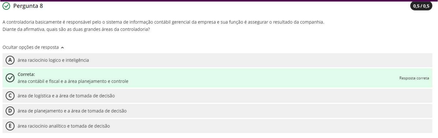 <p>Pergunta 8 A controladoria basicamente é responsável pelo sistema de informação contábil gerencial da empresa e sua função é assegurar resultado da companhia. Diante da afirmativa, quais são as duas grandes áreas da controladoria? Ocultar opções de resposta A área raciocínio logico e inteligência Correta: Resposta correta área contábil e fiscal e a área planejamento e controle área de logística e a área de tomada de decisão D área de planejamento e a área de tomada de decisão E área raciocínio analítico e tomada de decisão</p>