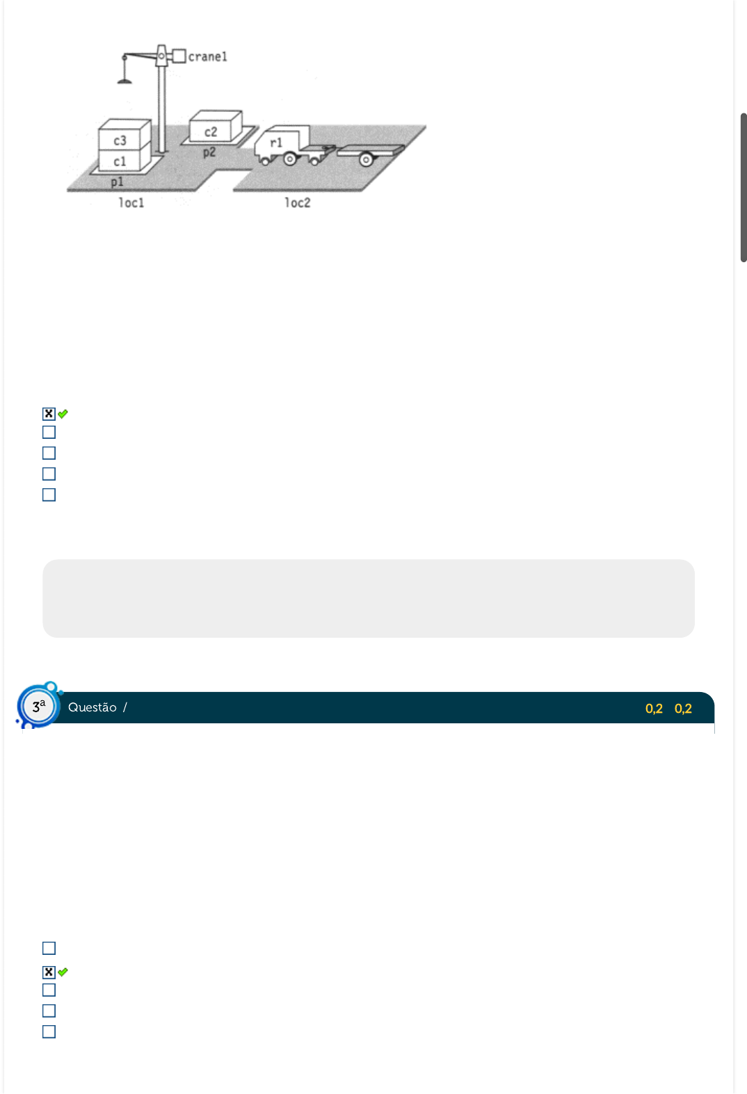 <p>22/02/24, 10:18 Estácio: Alunos</p><p>https://simulado.estacio.br/alunos/ 1/1</p><p>�gura a seguir:</p><p>state = {attached(p1,loc1), attached(p2,loc1), in(c1,p1), in(c3,p1), top(c3,p1), on(c3,c1), on(c1,pallet), in(c2,p2),</p><p>top(c2,p2), on(c2,pallet), belong(crane1,loc1),</p><p>empty(crane1),adjacent(loc1,loc2), adjacent(loc2, loc1), at(r1,loc2), occupied(loc2),</p><p>unloaded(r1)}</p><p>Após o robô r1 entrar na plataforma loc1, quais predicados teriam seus valores alterados:</p><p>at(r1,loc2), occupied(loc2) seriam modi�cados.</p><p>attached(p1,loc1) e attached(p2,loc1) seriam modi�cados.</p><p>somente occupied(loc2) seria modi�cado.</p><p>adjacent(loc1,loc2) seriam modi�cados.</p><p>on(c2,pallet) e belong(crane1,loc1) seriam modi�cados.</p><p>Respondido em 22/02/2024 09:59:44</p><p>Explicação:</p><p>Após o robô r1 entrar na plataforma loc1, at(r1,loc2) e occupied(loc2) seriam modi�cados, porque o robô r1 não</p><p>estaria mais em loc2 (at(r1,loc2)), e assim loc2 não estaria mais ocupado, modi�cando também occupied(loc2).</p><p>Acerto: 0,2 / 0,2</p><p>Sistemas Especialistas (SE) e Sistemas Nebulosos (SN) apresentam algumas características em comum. Uma</p><p>delas é que em ambos o conhecimento é representado por meio de regras do tipo se-então. No entanto, no caso</p><p>dos SE as regras manipulam termos precisos em seus antecedentes e consequentes, enquanto os SN</p><p>manipulam termos imprecisos. Diante disso, analise as regras a seguir:</p><p>I - se (dor lombar = SIM) e (condicionamento físico = 4) então (nadar peito = NÃO)</p><p>II - se (pluviosidade = ALTA) ou (nível = MÉDIO) então (vazão = MUITA)</p><p>III - se (umidade = BAIXA) e (temperatura = MÉDIA) então (ligar = SIM)</p><p>Podem ser consideradas regras nebulosas apenas:</p><p>II</p><p>II e III</p><p>I e II</p><p>I e III</p><p>I, II e III</p><p>Respondido em 22/02/2024 10:00:41</p><p>Questão / 3</p><p>a</p>