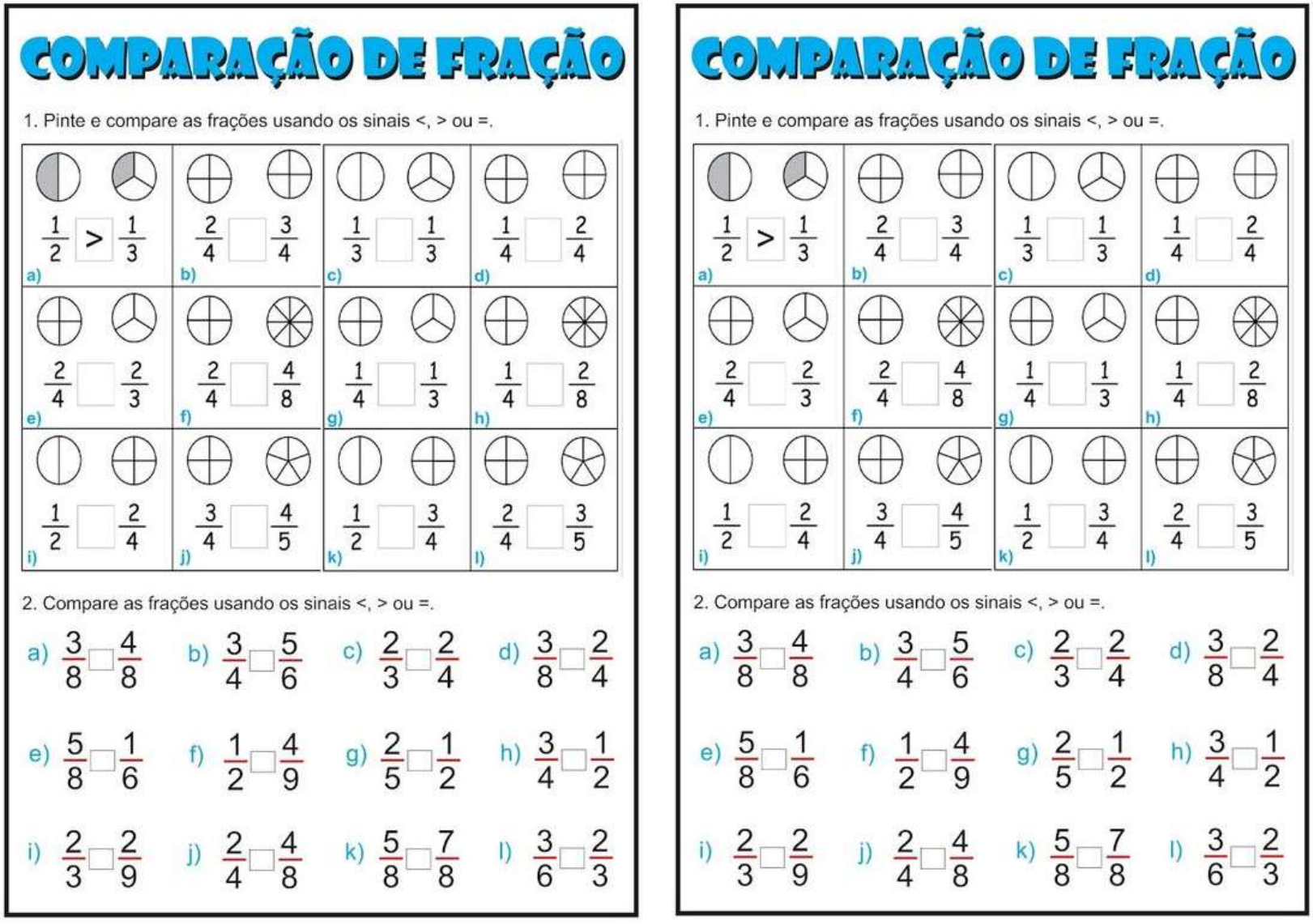 <p>1. Pinte e compare as frações usando os sinais > ou 1. Pinte e compare as frações usando os sinais > ou 2 3 1 1 2 4 3 4 4 1 1 2 3 1 1 1 2 4 3 3 4 4 3 3 4 4 a) b) c) d) a) b) c) d) OQ OQ 2 2 2 4 1 1 1 2 2 2 2 4 1 1 1 2 4 3 4 8 4 3 4 8 4 3 4 8 4 3 4 8 e) f) g) h) e) f) g) h) 00 1 2 3 4 1 3 2 3 1 2 3 4 1 3 2 3 2 4 4 5 2 4 4 5 2 4 4 5 2 4 45 i) j) k) I) i) j) k) I) 2. Compare as frações usando os sinais <, > ou 2. Compare as frações usando os sinais > ou a) 34 b) 3 5 c) d) a) 3 4 b) 3 5 c) d) 4 6 3 4 8 4 8 8 4 6 34 e) f) 1 g) h) e) 5 f) 1 4 g) h) 2 9 4 2 86 2 9 4 2 i) j) 24 k) 5 7 I) 3 2 i) j) 24 k) I) 3 2 4 8 8 8 3 9 4 8</p>