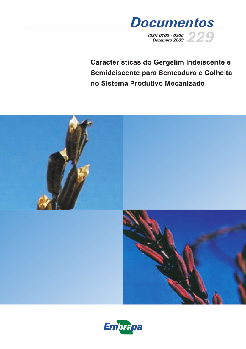 <p>Características do Gergelim Indeiscente e Semideiscente para Semeadura ...</p><p>1</p><p>Características do Gergelim Indeiscente e Semideiscente para Semeadura ...2</p><p>Características do Gergelim Indeiscente e Semideiscente para Semeadura ...</p><p>3</p><p>Documentos 229</p><p>Vicente de Paula Queiroga</p><p>Tarcísio Marcos de Souza Gondim</p><p>Odilon Reny Ribeiro Ferreira da Silva</p><p>Características do gergelim indeiscente e</p><p>semideiscente para semeadura e colheita</p><p>no sistema produtivo mecanizado</p><p>Centro Nacional de Pesquisa de Algodão</p><p>Campina Grande, PB</p><p>2009</p><p>Empresa Brasileira de Pesquisa Agropecuária</p><p>Centro Nacional de Pesquisa de Algodão</p><p>Ministério da Agricultura, Pecuária e Abastecimento</p><p>ISSN 0103-0205</p><p>Dezembro, 2009</p><p>Características do Gergelim Indeiscente e Semideiscente para Semeadura ...4</p><p>Exemplares desta publicação podem ser adquiridos na:</p><p>Embrapa Algodão</p><p>Rua Osvaldo Cruz, 1143, Centenário</p><p>CEP 58428-095</p><p>Caixa Postal 174</p><p>Fone: (83) 3182 4300</p><p>Fax: (83) 3182 4367</p><p>Home page: http://www.cnpa.embrapa.br</p><p>E-mail: sac@cnpa.embrapa.br</p><p>Comitê de Publicações da Unidade</p><p>Presidente: Carlos Alberto Domingues da Silva</p><p>Secretário-Executivo: Geraldo Fernandes de Sousa Filho</p><p>Membros: Fábio Aquino de Albuquerque, Giovani Greigh de Brito, João Luis da Silva</p><p>Filho, Máira Milani, Maria da Conceição Santana Carvalho, Nair Helena Castro Arriel,</p><p>Valdinei Sofiatti, Wirton Macêdo Coutinho.</p><p>Supervisão editorial: Geraldo Fernandes de Sousa Filho</p><p>Revisão de texto: Vicente de Paula Queiroga</p><p>Normalização bibliográfica: Valter Freire de Castro</p><p>Tratamento de ilustrações: Oriel Santana Barbosa</p><p>Editoração eletrônica: Oriel Santana Barbosa</p><p>Fotos da capa: Gerald Langham e Ray Langham</p><p>Capa: Flávio Tôrres de Moura</p><p>1a edição</p><p>1a impressão (2009): 500</p><p>Todos os direitos reservados</p><p>A reprodução não-autorizada desta publicação, no todo ou em parte, constitui violação</p><p>dos direitos autorais (Lei no 9.610).</p><p>Dados Internacionais de Catalogação na Publicação (CIP)</p><p>Embrapa Algodão</p><p>Queiroga, Vicente de Paula.</p><p>Características do gergelim indeiscente e semideiscente para semeadura e colheita</p><p>no sistema produtivo mecanizado. / por Vicente de Paula Queiroga, Tarcísio Marcos</p><p>de Souza Gondim e Odilon Reny Ribeiro Ferreira da Silva.- Campina Grande: Embrapa</p><p>Algodão, 2009.</p><p>34p. (Embrapa Algodão. Documentos, 229)</p><p>1. Gergelim. 2. Semente. 3. Deiscencia. 4. Semeadura. 5. Colheita mecânica</p><p>I. Queiroga, Vicente de Paula. II. Gondim, Tarcísio Marcos de Souza. III. Silva, Odilon</p><p>Reny Ribeiro Ferreira da. IV. Título. V. Série.</p><p>© Embrapa 2009</p><p>CDD:635.1</p><p>Vicente de Paula Queiroga</p><p>Engenheiro agrônomo, Pós D.Sc. outorado em</p><p>Tecnologia de Sementes, Pesquisador da Embrapa</p><p>Algodão, Campina Grande, PB,</p><p>queiroga@cnpa.embrapa.br</p><p>Tarcísio Marcos de Souza Gondim</p><p>Engenheiro agrônomo, M.Sc. em Fitotecnia, Pesqui-</p><p>sador da Embrapa Algodão, Campina Grande, PB,</p><p>tarcisio@cnpa.embrapa.br</p><p>Odilon Reny Ribeiro Ferreira da Silva</p><p>Engenheiro agrônomo, D.Sc. em Engenharia agronô-</p><p>mica, Pesquisador da Embrapa Algodão, Campina</p><p>Grande, PB, odilon@cnpa.embrapa.br.</p><p>Autores</p><p>Características do Gergelim Indeiscente e Semideiscente para Semeadura ...6</p><p>Apresentação</p><p>O gergelim (Sesamum indicum, L.) é uma planta de fácil cultivo, e no caso</p><p>do Brasil, de ciclo rápido, entre 90 a 130 dias. É considerada uma das</p><p>primeiras espécies domesticadas pelo homem, sendo na atualidade uma das</p><p>dez principais oleaginosas do mundo, ocupando área plantada superior a</p><p>oito milhões de hectares e produz um dos melhores óleos para a alimenta-</p><p>ção humana, inclusive é um alimento funcional (alimentício/ medicinal). As</p><p>informações apresentadas neste documento demonstram que já existem</p><p>conhecimentos e tecnologias sobre o agronegócio do gergelim, que possibili-</p><p>tarão a sua promoção como uma cultura de grande perspectiva econômica,</p><p>especialmennte para as condições do cerrado das regiões Nordeste e</p><p>Centro-Oeste (cultura de safrinha). Apenas uma simples introdução de</p><p>cultivares indeiscentes ou semi-deiscentes no seu sistema produtivo, as</p><p>quais, por sua vez, exigirá menos dependência de mão-de-obra, poderá</p><p>incrementar significativamente a área plantada de tal lavoura. Havendo</p><p>expansão significativa da sua área plantada no Brasil, a verticalização da</p><p>produção do gergelim irá depender das modificações nos costumes culturais</p><p>e socias da população, pois o mercado nacional é limitado e por este motivo</p><p>não valoriza tanto a qualidade do gergelim como o mercado internacional.</p><p>Atualmente, mais de 20% do consumo de gergelim no Brasil é importado.</p><p>Um rendimento médio maior no campo contribuiria para que o preço</p><p>baixasse, tornando o produto mais acessível às classes populares, pois, no</p><p>presente momento, o consumo de gergelim se restringe às classes mais</p><p>Características do Gergelim Indeiscente e Semideiscente para Semeadura ...8</p><p>favorecidas do País. Além disso, deverá melhorar o marketing sobre os</p><p>benéficos a saúde humana proporcionados pelas propriedades químicas</p><p>naturais existentes nessa espécie, tendo na sua constituição substancias</p><p>anti-oxidantes como as sesamina e sesamolina e cerca de 40% de seus</p><p>ácidos-graxas é o oléico (moninsaturado). A torta ou farelo do gergelim,</p><p>tem excelente composição de aminoácidos importantes, tais como</p><p>metionina, cistina, arginina e leucina, e pode se constituir em uma excelen-</p>