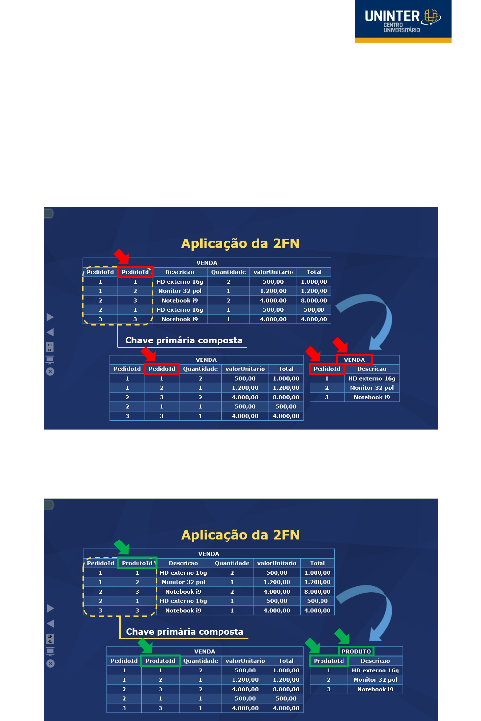 <p>Centro Universitário Internacional UNINTER</p><p>Escola Superior Politécnica – ESP</p><p>Banco de Dados - Errata: Aula 2 - Slides 19 e 21</p><p>1</p><p>BANCO DE DADOS</p><p>ERRATA: Aula 2 – Slides 19 e 21</p><p>Na Aula 2 – Modelagem de Banco de Dados, há um erro no Slide 19 – Aplicação da</p><p>2FN. O slide do material e da videoaula contém as seguintes informações:</p><p>Note que há quatro campos errados (vermelho), sendo os campos corretos (verde):</p><p>Centro Universitário Internacional UNINTER</p><p>Escola Superior Politécnica – ESP</p><p>Banco de Dados - Errata: Aula 2 - Slides 19 e 21</p><p>2</p><p>Na Aula 2 – Modelagem de Banco de Dados, há um erro no Slide 21 – Aplicação da</p><p>3FN. O slide do material e da videoaula contém as seguintes informações:</p><p>Note que há dois campos errados (vermelho), sendo os campos corretos (verde):</p>