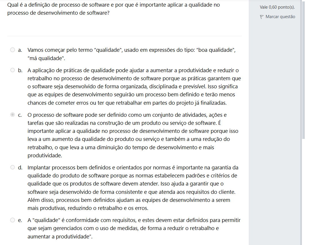 <p>Qual é a definição de processo de software e por que é importante aplicar a qualidade no Vale 0,60 ponto(s). processo de desenvolvimento de software? Marcar questão a. Vamos começar pelo termo "qualidade", usado em expressões do tipo: "boa qualidade", "má qualidade". b. A aplicação de práticas de qualidade pode a aumentar a produtividade e reduzir o retrabalho no processo de desenvolvimento de software porque as práticas garantem que o software seja desenvolvido de forma organizada, disciplinada e previsível. Isso significa que as equipes de desenvolvimento seguirão um processo bem definido e terão menos chances de cometer erros ou ter que retrabalhar em partes do projeto já finalizadas. C. processo de software pode ser definido como um conjunto de atividades, ações e tarefas que são realizadas na construção de um produto ou serviço de software. É importante aplicar a qualidade no processo de desenvolvimento de software porque isso leva a um aumento da qualidade do produto ou serviço e também a uma redução do retrabalho, o que leva a uma diminuição do tempo de desenvolvimento e mais produtividade. d. Implantar processos bem definidos e orientados por normas é importante na garantia da qualidade do produto de software porque as normas estabelecem padrões e critérios de qualidade que os produtos de software devem atender. Isso ajuda a garantir que o software seja desenvolvido de forma consistente e que atenda aos requisitos do cliente. Além disso, processos bem definidos ajudam as equipes de desenvolvimento a serem mais produtivas, reduzindo o retrabalho e os erros. e. A "qualidade" é conformidade com requisitos, e estes devem estar definidos para permitir que sejam gerenciados com o uso de medidas, de forma a reduzir o retrabalho e aumentar a produtividade".</p>