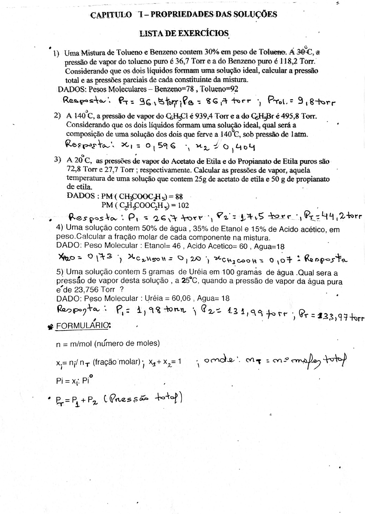 <p>CAPITULO -PROPRIEDADES DAS SOLUÇÕES LISTA DE EXERCÍCIOS 1) Uma Mistura de Tolueno e Benzeno contem 30% em peso de Tolueno. A a pressão de vapor do tolueno puro é 36,7 Torr e a do Benzeno puro é 118,2 Torr. Considerando que os dois líquidos formam uma solução ideal, calcular a pressão total e as pressões parciais de cada constituinte da mistura. DADOS: Pesos Moleculares - Benzeno=78 Tolueno=92 Resposta: 96 = 86,7 2) A 140°C, a pressão de vapor do é 939,4 Torr e a do é 495,8 Torr. Considerando que os dois líquidos formam uma solução ideal, qual será a composição de uma solução dos dois que ferve a 140°C, sob pressão de latm. Resposta: x, 0,596 - 0,404 3) A 20°C, as pressões de vapor do Acetato de Etila e do Propianato de Etila puros são Torr e 27,7 Torr ; respectivamente. Calcular as pressões de vapor, aquela temperatura de uma solução que contem 25g de acetato de etila e 50 g de propianato de etila. DADOS : PM ( PM 102 Resposta : P, = P2 torr torr 4) Uma solução contem 50% de 35% de Etanol e 15% de Acido acético, em peso. Calcular a fração molar de cada componente na mistura. DADO: Peso Molecular : Etanol= 46, Acido Acetico= 60 Agua=18 XH2O= = : Resposta 5) Uma solução contem 5 gramas de Uréia em 100 gramas de água Qual sera a de vapor desta solução , a 25°C, quando a pressão de vapor da água pura 23,756 Torr ? DADO: Peso Molecular : Agua= 18 1, 98 i PT = 133,97 torr FORMULARIO: m/mol de moles) 1 = total</p>