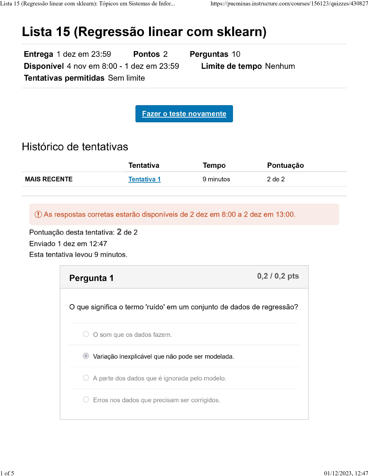 <p>Lista 15 (Regressão linear com sklearn)</p><p>Entrega 1 dez em 23:59 Pontos 2 Perguntas 10</p><p>Disponível 4 nov em 8:00 - 1 dez em 23:59 Limite de tempo Nenhum</p><p>Tentativas permitidas Sem limite</p><p>Histórico de tentativas</p><p>Tentativa Tempo Pontuação</p><p>MAIS RECENTE Tentativa 1 9 minutos 2 de 2</p><p>As respostas corretas estarão disponíveis de 2 dez em 8:00 a 2 dez em 13:00.</p><p>Pontuação desta tentativa: 2 de 2</p><p>Enviado 1 dez em 12:47</p><p>Esta tentativa levou 9 minutos.</p><p>Fazer o teste novamente</p><p>0,2 / 0,2 ptsPergunta 1</p><p>O que significa o termo 'ruído' em um conjunto de dados de regressão?</p><p>0,2 / 0,2 ptsPergunta 2</p><p>O que coef_ e intercept_ representam em um modelo de regressão</p><p>linear treinado?</p><p>coef_ é o coeficiente angular e intercept_ é o coeficiente linear.</p><p>modelo treinado?</p><p>model.coef_</p><p>0,2 / 0,2 ptsPergunta 9</p><p>Qual é o propósito de plotar a linha de regressão sobre os dados?</p><p>Visualizar a relação entre as variáveis x e y.</p>