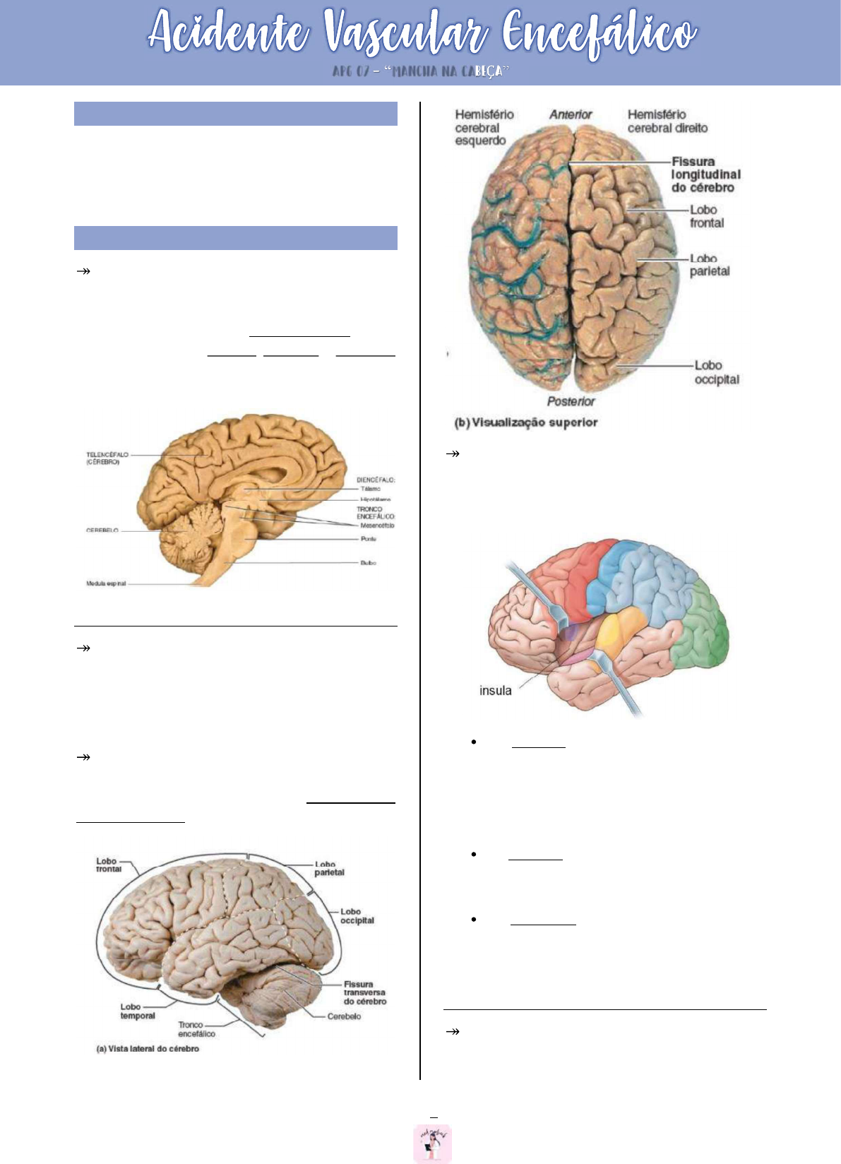 <p>1</p><p>Júlia Morbeck @med.morbeck</p><p>Objetivos</p><p>1- Rever a anatomia e vascularização do encéfalo</p><p>(ênfase na vascularização);</p><p>2- Estudar a classificação, fisiopatologia, quadro</p><p>clinico, diagnóstico e tratamento do AVE.</p><p>Anatomia do encéfalo</p><p>O encéfalo é a parte do sistema nervoso central (SNC)</p><p>que está contida no interior da cavidade craniana (REGAN</p><p>et al., 10ª ed.). Os anatomistas costumam classificar o</p><p>encéfalo em quatro partes: tronco encefálico (bulbo,</p><p>ponte e mesencéfalo), cerebelo, diencéfalo e telencéfalo</p><p>(cérebro), composto de dois hemisférios cerebrais</p><p>(MARIEB, 7ª ed.).</p><p>CORTÉX CEREBRAL</p><p>O córtex cerebral é uma região de substância cinzenta</p><p>que forma a face externa do telencéfalo (cérebro).</p><p>Embora tenha apenas 2 a 4 mm de espessura, ele</p><p>contém bilhões de neurônios dispostos em camadas</p><p>(TORTORA, 14ª ed.).</p><p>Cada hemisfério cerebral pode ser subdividido em</p><p>vários lobos, que recebem seus nomes de acordo com</p><p>os ossos que os recobrem: lobos frontal, parietal,</p><p>temporal e occipital (TORTORA, 14ª ed.).</p><p>Uma quinta porção do telencéfalo (cérebro), a ínsula,</p><p>não pode ser vista superficialmente porque se encontra</p><p>dentro do sulco cerebral lateral, profundamente aos lobos</p><p>(TORTORA, 14ª ed.).</p><p>O lobo frontal contém áreas funcionais que planejam,</p><p>iniciam e executam o movimento motor, incluindo o</p><p>movimento dos olhos e a produção da fala. A região mais</p><p>anterior do córtex frontal desempenha funções cognitivas</p><p>de ordem superior, como o raciocínio, o planejamento, a</p><p>tomada de decisão e a memória de trabalho, e outras</p><p>funções executivas (MARIEB, 7ª ed.).</p><p>O lobo parietal processa estímulos sensitivos, permitindo: a</p><p>percepção consciente da sensibilidade somática geral; a</p><p>percepção espacial dos objetos, sons e partes do corpo; e</p><p>a compreensão da fala (MARIEB, 7ª ed.).</p><p>O lobo temporal contém o córtex auditivo e o córtex</p><p>olfatório. Além disso, funciona no reconhecimento de</p><p>objetos, palavras, feições e na compreensão da linguagem</p><p>(MARIEB, 7ª ed.).</p><p>VASCULARIZAÇÃO DO ENCÉFALO</p><p>Embora represente apenas cerca de 2,5% do peso</p><p>do corpo, o encéfalo recebe aproximadamente um sexto</p><p>do débito cardíaco e um quinto do oxigênio consumido</p><p>AAAAAccccciiicccccciiiciidddiiiiiiddddiddeeeddddddeedeennnneeeeeenntnnnttttttnnnntttteetttttteete VVVVVaaaaVVVVaaaV sssaaaaaaaassssasaaassssscccsssssscccsccuuuuccccccccuuuuullluuuuuuuullaalaallllllaaaalarraaarrrrrraaaaaarrr EEEnnnnccnncccncceecceeeecefffeeffeefffffáááffááfááállláálliiilllllliiiliillicciiiiiiccciccoooccoooooco</p><p>APG 07 MANCHA NA CABEÇA</p><p>2</p><p>Júlia Morbeck @med.morbeck</p><p>pelo corpo em repouso. A vascularização encefálica</p><p>provém das artérias carótida interna e vertebral, cujos</p><p>ramos terminais estão situados no espaço subaracnóideo.</p><p>A drenagem venosa encefálica é feita pelas veias</p><p>cerebrais e cerebelares que drenam para os seios</p><p>venosos durais adjacentes (MOORE et al., 2022).</p><p>As artérias carótidas internas originam-se no pescoço</p><p>a partir das artérias carótidas comuns. A parte cervical de</p><p>cada artéria ascende verticalmente através do pescoço,</p><p>sem ramificações, até a base do crânio. Cada artéria</p><p>carótida interna entra na cavidade do crânio através do</p><p>canal carótico na parte petrosa do temporal (MOORE et</p><p>al., 2022).</p><p>Clinicamente, as artérias carótidas internas e seus ramos são referidos</p><p>como circulação anterior do encéfalo. As artérias cerebrais anteriores</p><p>são unidas pela artéria comunicante anterior. Perto de seu término, as</p><p>artérias carótidas internas são unidas às artérias cerebrais posteriores</p><p>pelas artérias comunicantes posteriores, completando o círculo arterial</p><p>do cérebro ao redor da fossa interpeduncular, a depressão profunda</p><p>na face inferior do mesencéfalo entre os pedúnculos cerebrais</p><p>(MOORE et al., 2022).</p><p>As artérias vertebrais originam-se na raiz do pescoço</p><p>(as partes pré-vertebrais das artérias vertebrais) como os</p><p>primeiros ramos da primeira parte das artérias subclávias.</p><p>As duas artérias vertebrais geralmente têm tamanhos</p><p>diferentes, sendo a esquerda maior do que a direita</p><p>(MOORE et al., 2022).</p><p>As partes transversárias (cervicais) das artérias</p><p>vertebrais ascendem através dos forames transversários</p><p>das seis primeiras vértebras cervicais. As partes atlânticas</p><p>das artérias vertebrais (partes relacionadas com o atlas,</p><p>vértebra C I) perfuram a dura-máter e a aracnoide-máter</p><p>e atravessam o forame magno. As partes intracranianas</p><p>das artérias vertebrais unem-se na margem caudal da</p><p>ponte para formar a artéria basilar. O sistema arterial</p><p>vertebrobasilar e seus ramos muitas vezes são referidos</p><p>clinicamente como circulação posterior do encéfalo</p><p>(MOORE et al., 2022).</p><p>A artéria basilar, assim denominada em face de sua</p><p>íntima relação com a base do crânio, ascende até o clivo,</p><p>a face inclinada do dorso da sela até o forame magno,</p><p>através da cisterna pontocerebelar até a margem</p><p>superior da ponte. Termina dividindo-se em duas artérias</p><p>cerebrais posteriores (MOORE et al., 2022).</p><p>Artérias cerebrais</p><p>Além de enviar ramos para as partes mais profundas</p><p>do encéfalo, os ramos corticais de cada artéria cerebral</p><p>irrigam uma superfície e um polo do cérebro. Os ramos</p><p>corticais da: (MOORE et al., 2022).</p><p>Artéria cerebral anterior irrigam a maior parte</p><p>das faces medial e superior do encéfalo e o polo</p><p>frontal</p><p>Artéria cereb