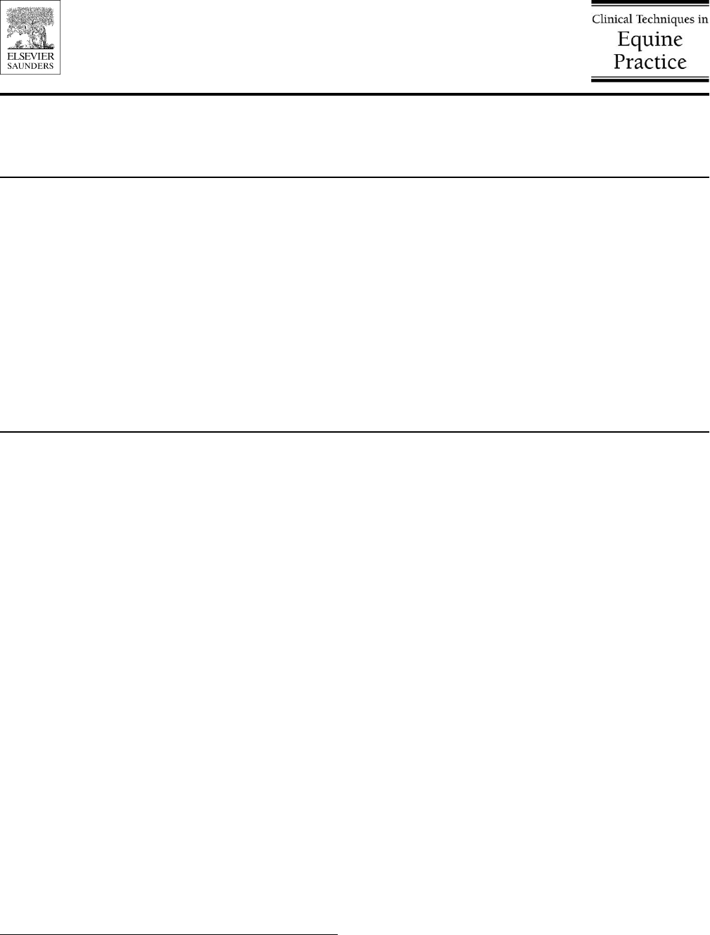 <p>A</p><p>S</p><p>S</p><p>U</p><p>t</p><p>a</p><p>i</p><p>l</p><p>t</p><p>fi</p><p>t</p><p>fi</p><p>T</p><p>o</p><p>n</p><p>c</p><p>t</p><p>b</p><p>l</p><p>v</p><p>U</p><p>i</p><p>g</p><p>l</p><p>i</p><p>T</p><p>A</p><p>3</p><p>bdominal Ultrasonography of the Foal</p><p>iobhan B. McAuliffe, MVB</p><p>Disorders of abdominal organs represent a large proportion of diseases encountered in</p><p>equine neonatal medicine. Ultrasonography was first used in the equine neonate for the</p><p>diagnosis of internal umbilical remnant infections and has since been used for the diag-</p><p>nosis of a wide variety of disorders. Ultrasound is noninvasive, well tolerated by the foal,</p><p>and easily performed in the field. In addition, the smaller size of the foal abdomen and</p><p>proximity of many organs of interest makes the foal an ideal candidate for abdominal</p><p>ultrasonography. These factors have led to increasing use of ultrasonography in the equine</p><p>neonate; with this increased use has come awareness of the prognostic as well as</p><p>diagnostic features of ultrasound. This article reviews the technique for abdominal ultra-</p><p>sonography, including its advantages and limitations, and provides an overview of neces-</p><p>sary equipment. The ultrasonographic appearance of abdominal organs under normal and</p><p>pathologic conditions is also described.</p><p>Clin Tech Equine Pract 3:308-316 © 2004 Elsevier Inc. All rights reserved.</p><p>KEYWORDS ultrasonography, neonate, abdominal, renal, umbilical, hepatic</p><p>U</p><p>T</p><p>e</p><p>m</p><p>t</p><p>v</p><p>i</p><p>e</p><p>o</p><p>m</p><p>u</p><p>o</p><p>i</p><p>s</p><p>d</p><p>d</p><p>g</p><p>n</p><p>c</p><p>i</p><p>t</p><p>b</p><p>u</p><p>s</p><p>t</p><p>i</p><p>t</p><p>m</p><p>i</p><p>canning Technique</p><p>ltrasonographic examination of the abdominal organs</p><p>has been well described in foals.1-6 Sector and linear</p><p>ransducers can be used, and both produce high-quality im-</p><p>ges. Sector scanners have a small footprint that facilitates</p><p>ntercostal imaging. Linear transducers produce a rectangu-</p><p>ar image that is well suited for examining superficial struc-</p><p>ures; however, with increasing depth, the image of the far</p><p>eld is narrowed which restricts visualization of deep struc-</p><p>ures. Curved linear transducers provide wide near and far</p><p>elds of view, and the footprint size is usually intermediate.</p><p>he highest frequency transducer that penetrates to the area</p><p>f interest should be used and the smallest depth of field</p><p>ecessary should be displayed.</p><p>Sedation is not generally required but may be necessary in</p><p>ertain individuals. For optimal image quality, the entire ven-</p><p>ral abdomen should be clipped with a #40 surgical clipper</p><p>lade from the xiphoid caudally to the inguinal region. The</p><p>ateral abdomen and paralumbar fossa should also be clipped</p><p>entral to a line drawn from the tuber coxae to the elbow.</p><p>ltrasound coupling gel should be applied following wash-</p><p>ng of the abdomen with warm water. Examination of the</p><p>astrointestinal viscera is performed from the most ventral</p><p>ocation to avoid interference from gas present in the gastro-</p><p>ntestinal viscera that rises dorsally.</p><p>he Stables of HRH Crown Prince Abdullah bin Abdul Aziz & Sons, Riyadh.</p><p>ddress reprint requests and correspondence to: Siobhan B. McAuliffe,</p><p>MVB, The Stables of HRH Crown Prince Abdullah bin Abdul Aziz &</p><p>Sons, PO Box 46935, Riyadh, Kingdom of Saudi Arabia, 11542. E-mail:</p><p>wsiobhanmcauliffe@hotmail.com</p><p>08 1534-7516/04/$-see front matter © 2004 Elsevier Inc. All rights reserved.</p><p>doi:10.1053/j.ctep.2005.02.008</p><p>mbilical Remnants</p><p>he umbilical vein is located along the midline from the</p><p>xternal umbilicus to the liver and becomes the round liga-</p><p>ent of the liver. It is a small oval or elliptical vessel with a</p><p>hin echogenic wall and an anechoic center. The umbilical</p><p>ein usually measures 10 mm or less in diameter throughout</p><p>ts length.7 The umbilical arteries course caudally from the</p><p>xternal umbilical remnant and become the round ligaments</p><p>f the bladder. They are thick walled with a diameter of 12</p><p>m or less and commonly contain an echogenic clot. The</p><p>rachus retracts after birth and becomes the median ligament</p><p>f the bladder. In the normal foal, it contains no fluid.</p><p>Umbilical remnant infections may be external (Fig. 1),</p><p>nternal, or both and have frequently been incriminated as a</p><p>ource of septicemic infections.8 External infections may be</p><p>etected clinically in the presence of heat, pain, swelling, or</p><p>ischarging purulent material or can be diagnosed ultrasono-</p><p>raphically as an enlarged thickened external umbilical rem-</p><p>ant containing hypoechoic to echogenic fluid.8 Hypere-</p><p>hoic echoes representing gas may be detected and are</p><p>ndicative of an anaerobic infection if there is no gas-filled</p><p>ract extending from the skin surface into the external um-</p><p>ilical remnant.9 Internal infections are best diagnosed with</p><p>ltrasonography. Enlargement of any of the internal remnant</p><p>tructures, with the detection of intraluminal fluid, indicates</p><p>he presence of infection. Involvement of multiple structures</p><p>s common in foals with internal umbilical remnant infec-</p><p>ion.1,2,8 Infection of the urachus and umbilical arteries is</p><p>ost common, with less frequent involvement of the umbil-</p><p>cal vein.8 The infected umbilical vein is enlarged (�10 mm)</p><p>ith the most prominent enlargement at or near the external</p><p>u</p><p>c</p><p>u</p><p>s</p><p>s</p><p>e</p><p>l</p><p>c</p><p>e</p><p>i</p><p>e</p><p>i</p><p>e</p><p>f</p><p>b</p><p>s</p><p>e</p><p>t</p><p>f</p><p>U</p><p>H</p><p>s</p><p>l</p><p>i</p><p>fl</p><p>v</p><p>w</p><p>s</p><p>P</p><p>D</p><p>A</p><p>b</p><p>u</p><p>c</p><
