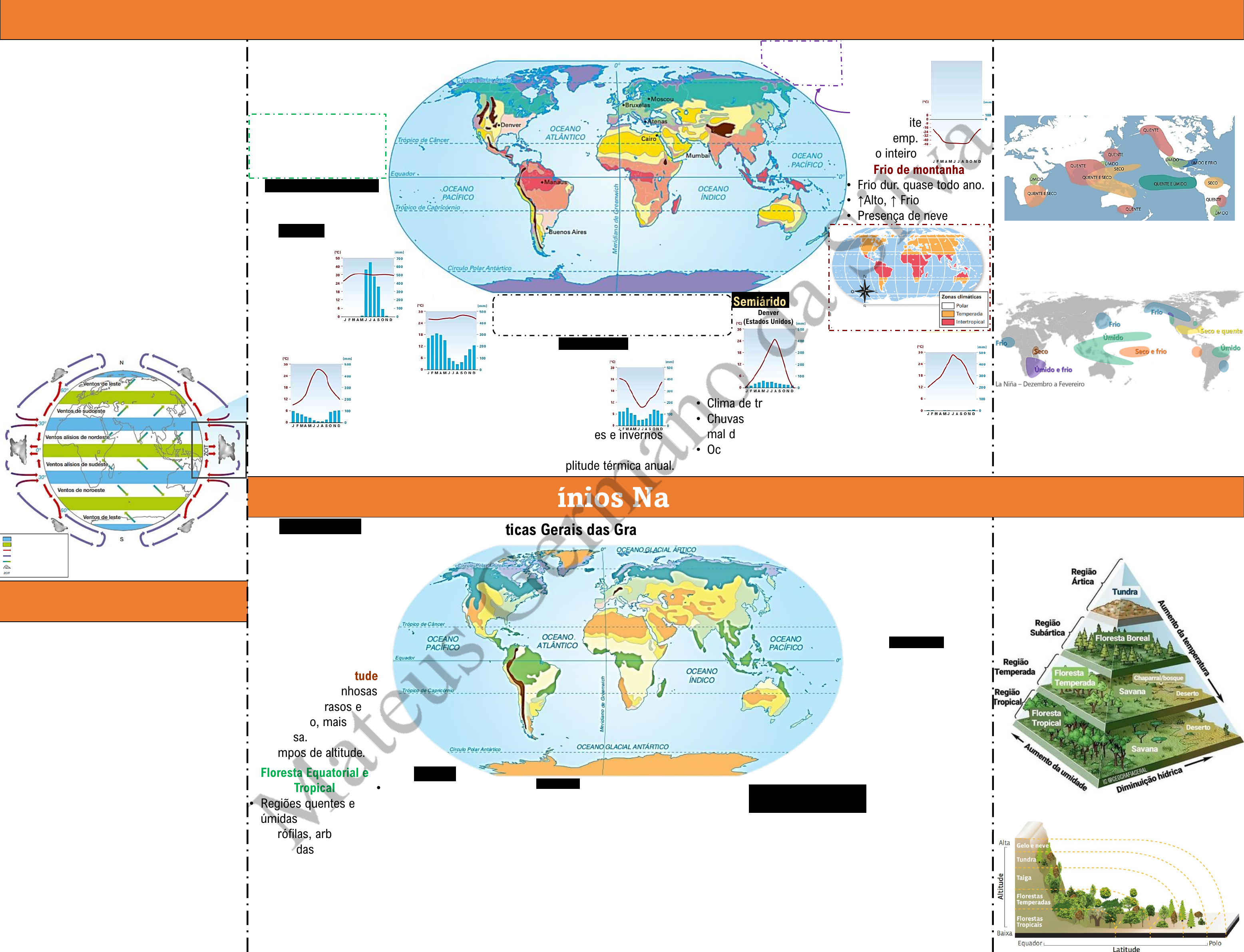 <p>Climatologia</p><p>Cobertura Vegetal</p><p>• Perenes: plantas que apresentam folhas</p><p>durante o ano todo;</p><p>• Caducifólias, Decíduas ou Estacionais:</p><p>plantas que perdem as folhas em épocas</p><p>muito frias ou secas do ano;</p><p>• Esclerófilas: plantas com folhas duras, que</p><p>têm consistência de couro (coriáceas);</p><p>• Xerófilas: plantas adaptadas à aridez;</p><p>• Higrófilas: plantas, geralmente perenes,</p><p>adaptadas a muita umidade;</p><p>• Tropófilas: plantas adaptadas a uma estação</p><p>seca e outra úmida;</p><p>• Aciculifoliadas: possuem folhas em forma</p><p>de agulhas, como os pinheiros. Quanto</p><p>menor a superfície das folhas, menos</p><p>intensa é a transpiração e maior é a retenção</p><p>de água pela planta;</p><p>• Latifoliadas: plantas de folhas largas, que</p><p>permitem intensa transpiração; são</p><p>geralmente nativas de regiões muito úmidas.</p><p>Características Gerais das Grandes Paisagens Naturais</p><p>Mediterrâneo</p><p>• Verões quentes e secos</p><p>• Invernos amenos e</p><p>chuvosos.</p><p>Desértico</p><p>• Alta amp. térmica</p><p>diária e sazonal</p><p>• Alta pres. subtrop.</p><p>• Baixa precipitação</p><p>Frio de montanha</p><p>• Frio dur. quase todo ano.</p><p>• ↑Alto, ↑ Frio</p><p>• Presença de neve no pico</p><p>Equatorial</p><p>• Ocorre na zona</p><p>climática mais quente</p><p>do planeta.</p><p>• Temperaturas elevadas</p><p>• Baixa amp. térmica</p><p>• Período de estiagem</p><p>nas regiões menos</p><p>chuvosas</p><p>Temperado Continental</p><p>• Variações de temperatura diária</p><p>e anual são bastante acentuadas</p><p>• Baixa pluviosidade</p><p>• Inverno rigoroso</p><p>Polar ou glacial</p><p>• Regiões de</p><p>altas latitudes</p><p>• Grande variaç.</p><p>na duração do</p><p>dia e da noite</p><p>• Baixas temp.</p><p>o ano inteiro</p><p>• Verões quentes e invernos</p><p>frios</p><p>• Alta amplitude térmica anual.</p><p>• D. Litorâneos: corrente marinha</p><p>fria. Ex: Atacama e Kalahari.</p><p>• D. Continentais: continentalidade.</p><p>Ex: Saara e Gobi</p><p>Domínios Naturais</p><p>Tipos Climáticos</p><p>Monções: ocorre no Sul e Sudeste da Ásia</p><p>influenciando na agricultura tradicional</p><p>Climas Temperados: 4</p><p>estações do ano com</p><p>características bem</p><p>determinadas</p><p>El Niño e La Niña</p><p>• El Niño: aquecimento anormal (3 ºC a 7 ºC acima</p><p>da média) das águas Pacífico nas proximidades</p><p>da linha do equador. Enfraquecimento dos</p><p>ventos alísios e diminuição da ressurgência</p><p>• La Niña ou Anti-El Niño: resfriamento anormal</p><p>das águas do Pacífico na costa peruana, o que</p><p>também altera as zonas de alta e baixa pressão,</p><p>provocando mudanças na direção dos ventos e</p><p>das massas de ar.</p><p>• Consequências socioambientais: Enchentes,</p><p>tempestades, diminuição da presença de peixes,</p><p>problemas na agricultura, etc.</p><p>• Pode ser prevista com seis a nove meses de</p><p>antecedência</p><p>• Apresentam causas desconhecidas.</p><p>Semiárido</p><p>• Clima de transição,</p><p>• Chuvas escassas e</p><p>mal distribuídas</p><p>• Ocorre em regiões</p><p>tropicais e temp.</p><p>Duas estações:</p><p>congelamento</p><p>e degelo</p><p>Denver</p><p>(Estados Unidos)</p><p>Cairo</p><p>(Egito)</p><p>Buenos Aires</p><p>(Argentina)</p><p>Polar Sul</p><p>Manaus</p><p>(AM)</p><p>Atenas</p><p>(Grécia)</p><p>Mumbai</p><p>(Índia)</p><p>Coberturas Vegetais de acordo com:</p><p>Temperatura e Umidade:</p><p>Latitude e Altitude</p><p>Tundra</p><p>• Vegetação rasteira, de</p><p>ciclo vegetativo</p><p>extremamente curto.</p><p>• Regiões subpolares e</p><p>em degelos.</p><p>• As espécies típicas são</p><p>os musgos(umidade),</p><p>e os liquens (seco),</p><p>aparecendo raramente</p><p>pequenos arbustos.</p><p>Deserto</p><p>• Escassez de água.</p><p>• Xerófilas/cactáceas</p><p>• suculentas e não</p><p>possuem folhas,</p><p>mas espinhos.</p><p>• Aparecem nos</p><p>desertos da</p><p>América, África,</p><p>Ásia e Oceania.</p><p>• Oásis</p><p>Floresta boreal/ de Coníferas</p><p>• Arbórea</p><p>• Ocorre nas altas latitudes do</p><p>hemisfério norte, em regiões</p><p>de climas temp. continentais,</p><p>como Canadá, Suécia,</p><p>Finlândia e Rússia (taiga).</p><p>• Homogênea: coníferas/pinheiro</p><p>Floresta Equatorial e</p><p>Tropical</p><p>• Regiões quentes e</p><p>úmidas</p><p>• Higrófilas, arbórea,</p><p>latifoliadas e</p><p>heterogêneas</p><p>• Se localizam em baixas</p><p>latitudes na América,</p><p>na África e na Ásia.</p><p>• Espécies de grande e</p><p>médio porte.</p><p>Vegetação de Altitude</p><p>• Regiões montanhosas</p><p>• Solos mais rasos e</p><p>vegetação, mais</p><p>esparsa.</p><p>• Campos de altitude.</p><p>Savana</p><p>• Regiões com alguns</p><p>meses chuvosos</p><p>• Formação complexa:</p><p>arbóreo, arbustivo e</p><p>herbáceo.</p><p>• Em grandes</p><p>extensões na África,</p><p>na América do Sul</p><p>(no Brasil: Cerrados)</p><p>e em menores na</p><p>Austrália e na Índia.</p><p>Mediterrânea</p><p>• Clima mediterrâneo</p><p>• É encontrada em</p><p>pequenas porções da</p><p>Califórnia (EUAs), do</p><p>Chile, da África do Sul e</p><p>da Austrália.</p><p>• As maiores ocorrências</p><p>estão no sul da Europa</p><p>e no norte da África</p><p>Seco e Frio</p><p>Seco e quente</p><p>Úmido</p><p>Úmido</p><p>Úmido e Frio</p><p>Frio</p><p>Frio</p><p>Frio</p><p>Frio</p><p>Seco</p><p>Temperado Oceânico</p><p>• Baixa amplitude térmica</p><p>• Alta pluviosidade</p><p>Tropical</p><p>• Duas estações</p><p>bem definidas:</p><p>❖inverno ameno</p><p>e seco;</p><p>❖verão quente e</p><p>chuvoso</p><p>• Regiões com</p><p>médias latitudes</p><p>• Chuvas</p><p>abundantes e</p><p>bem distribuídas</p><p>Subt