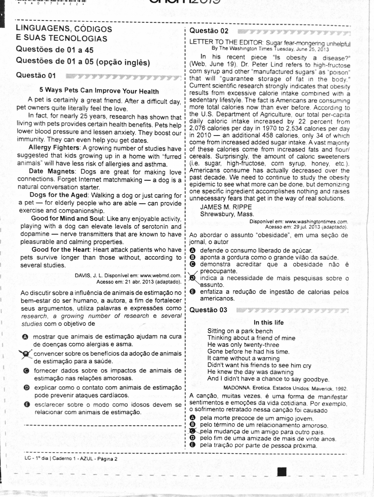 <p>7 LINGUAGENS, CÓDIGOS Questão 02 E SUAS TECNOLOGIAS LETTER TO THE EDITOR: Sugar fear-mongering unhelpful Questões de 01 a 45 By The Washington Times June 25, 2013 Questões de 01 a 05 (opção In his recent piece "Is obesity a disease?" (Web, June 19), Dr. Peter Lind refers to high-fructose Questão 01 corn syrup and other "manufactured sugars" as "poison" that will "guarantee storage of fat in the body." 5 Ways Pets Can Improve Your Health Current scientific research strongly indicates that obesity results from excessive calorie intake combined with a A pet is certainly a great friend. After a difficult day, sedentary lifestyle. The fact is Americans are consuming pet owners quite literally feel the love. more total calories now than ever before. According to In fact, for nearly 25 years, research has shown that the U.S. Department of Agriculture, our total per-capita living with pets provides certain health benefits. Pets help daily caloric intake increased by 22 percent from lower blood pressure and lessen anxiety. They boost our 2,076 calories per day in 1970 to 2,534 calories per day in 2010 - an additional 458 calories, only 34 of which immunity. They can even help you get dates. come from increased added sugar A vast majority Allergy Fighters: A growing number of studies have of these calories come from increased fats and flour/ suggested that kids growing up in a home with "furred cereals. Surprisingly, the amount of caloric sweeteners animals" will have less risk of allergies and asthma. (i.e. sugar, high-fructose, corn syrup, honey, etc.). Date Magnets: Dogs are great for making love Americans consume has actually decreased over the connections. Forget Internet matchmaking - a dog is a past decade. We need to continue to study the obesity natural conversation starter. epidemic to see what more can be done, but demonizing Dogs for the Aged: Walking a dog or just caring for one specific ingredient accomplishes nothing and raises unnecessary fears that get in the way of real solutions. a pet - for elderly people who are able - can provide JAMES M. RIPPE exercise and companionship. Shrewsbury, Mass. Good for Mind and Soul: Like any enjoyable activity, Disponível em: playing with a dog can elevate levels of serotonin and Acesso em: 29 jul. 2013 (adaptado). dopamine - nerve transmitters that are known to have Ao abordar assunto "obesidade", em uma seção de pleasurable and calming properties. jornal, autor Good for the Heart: Heart attack patients who have A defende o consumo liberado de açúcar. pets survive longer than those without, according to aponta a gordura como grande vilão da saúde. several studies. C demonstra acreditar que a obesidade não é preocupante. DAVIS, J. L. Disponível em: indica a necessidade de mais pesquisas sobre o Acesso em: 21 abr. 2013 (adaptado). assunto. Ao discutir sobre a influência de animais de estimação no E enfatiza a redução de ingestão de calorias pelos bem-estar do ser humano, a autora, a fim de fortalecer americanos. seus argumentos, utiliza palavras e expressões como Questão 03 research, a growing number of research e several studies com objetivo de In this life Sitting on a park bench A mostrar que animais de estimação ajudam na cura Thinking about a friend of mine de doenças como alergias e asma. He was only twenty-three convencer sobre os benefícios da adoção de animais Gone before he had his time. de estimação para a saúde. It came without a warning Didn't want his friends to see him cry fornecer dados sobre os impactos de animais de He knew the day was dawning estimação nas relações amorosas. And I didn't have a chance to say goodbye. D explicar como contato com animais de estimação MADONNA. Erotica. Estados Unidos: Maverick pode prevenir ataques cardíacos. A canção, muitas vezes, é uma forma de manifestar E esclarecer sobre modo como idosos devem se sentimentos e emoções da vida cotidiana. Por exemplo, relacionar com animais de estimação. o sofrimento retratado nessa canção foi causado pela morte precoce de um amigo jovem. pelo término de um relacionamento C pela mudança de um amigo para outro país. D pelo fim de uma amizade de mais de vinte E pela traição por parte de pessoa LC 1° dia Caderno 1 AZUL Página 2</p>