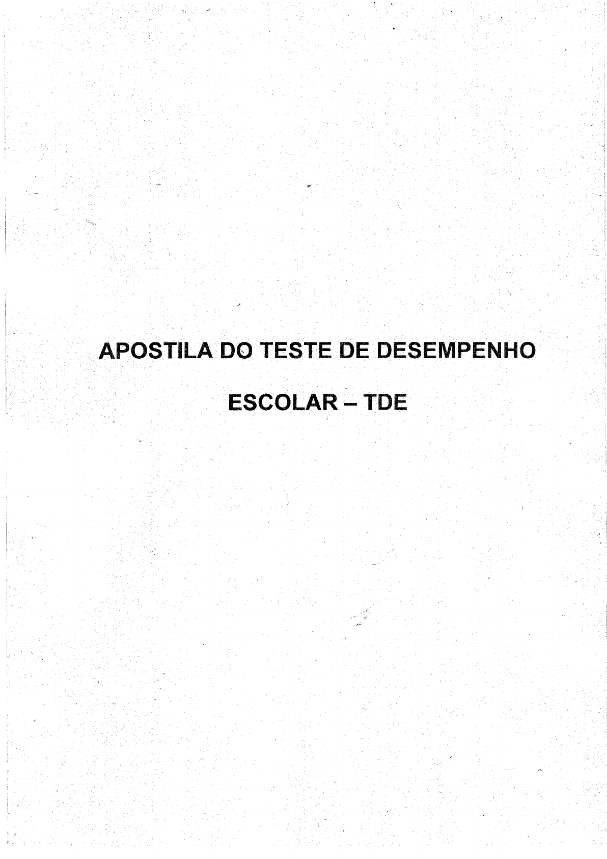 <p>APOSTILA DO TESTE DE DESEMPENHO</p><p>ESCOLAR-- TOE</p><p>Materiais empregados para a aplicação e avaliação do TDE:</p><p>Aplicação do Teste de '.</p><p>Desempel1hoEscolar</p><p>A.a].Jlica~ãodo TDE é individual e devel11serobs~f\'ácfas as</p><p>condições~padrão de iluminação, controle de ruídos eacomo-</p><p>dações, que são comunsaoutrosexílmes psicopedagógicos. O</p><p>teste deve ser aplicado em uma salabell1jI1ll11il}ada, silenciosa</p><p>e livre de distrações, bemcbmo devemsertomadasasprecau~"</p><p>ções para que o teste seja completado seÍniriterrupções.Câso</p><p>haja necessidade de se fazer alguma interrupção durante aapli-</p><p>cação, esta deve ser feita ao término de um dos subtestes. e an-</p><p>tes do il}íció do próximo .</p><p>. Equipamentosnecessmospar3. a aplicação: mesa e cadeira de</p><p>alturas adequadas para o examinando ~cadeiraparao exami-</p><p>nador ..Q examinando deve estar sentadoelll frente ao examina-</p><p>4s>f.A lTlt~sadevesersuficientementegrande paracornportar. o</p><p>.cadernodoleste e um espaço equivalemepara sçr utilizado pelo</p><p>examinador.</p><p>..~·2.1.····Descrição do Material</p><p>Teste de Desempenho Escolar</p><p>caderno do teste:</p><p>três lápis apontados;</p><p>uma borracha;</p><p>material·doexaI11inador contendo: Ficha do\Exal11inadoJ</p><p>coma lista. de palavras e frases.para oSubtestede Escrita;</p><p>Folha Estímulo contendo. as palavras a serem lidas pelo</p><p>examinando no Subteste de Leitura;</p><p>crivo·paraa correção doSubteste de Áritmética.</p><p>2.2. Instruções ·Gerais</p><p>Oexaminado[ deve estar totalmente farnlliarizadocoIllasúis-</p><p>truções detalhadas para a aplicação .do TDE.</p><p>Aplit';açaoâr) Íestede Desempenho Escolar</p><p>Ém~lljtoimportante que. se possa •.e~tabelecer desde o princípio</p><p>bom rapport çomo examinando paraestinrularaomáximo</p><p>int,eresse e motivação.</p><p>\</p><p>oexami nador procede .entãoo preenchimento dos dados de iden-</p><p>tificação na capa do caderno doTDE,Teferentes ao nome, sexo,</p><p>idade, escola, série, exarninadore datadeaplicação.dotestt;.</p><p>Em seguida, inicia-se aaplicação.decada·. um· dos. subtestes.</p><p>Dmlaarelativaindependência e naturezadistinta dos subt~stes,</p><p>a ordem de apresentáção deles pode ser alterada, sem prejuízo</p><p>nos resultados do teste.</p><p>2.3. In.stnlções Específicas para a</p><p>Aj)Ucªçãode cada Subte~te</p><p>Subtestê de Escrita</p><p>Escrita do nome</p><p>&creva. seu nome··nesta)inha (aponte para a linha cOrrespondente).</p><p>Ditadode.palavras</p><p>para O ditado depalavrasutiliza~sea Ficha do Examinador, que</p><p>contém a listadas palavras a serem ditadas,seguidas de ~ma frase.</p><p>Diga:</p><p>Agora vamosJazerum ditado de palavras; VOuditar-lhe a</p><p>jJalavra, depois vou lerumRfrasé cOMéstapalavra e vou</p><p>dizera palavra novamente, e sóentàovocéf2óderâ escrevê-</p><p>la. Escreva a primeira palavra aqui (aponte para a linha</p><p>nQ 1),. e depois continue eSé'l-eyençlonaslinh(Jscorrespon~</p><p>. dentes ao número da pqlavraditada. Límbre-sgde que</p><p>Teste de Desempenho Escolar</p><p>Aplicar. os três itens da Parte Oral antes de prosseguir para o</p><p>item n!.!l,da parte de cálculos por escrito: /</p><p>esteâitadofoi feito também parasêries mais adiantadas</p><p>que âsua,portanto pode sentir dijiculdades paraescre ver</p><p>yalgumasdas palavras, mas vjJcêdeve tentar escrevê-las</p><p>âaforma como souber ti até onde cOnseguir.</p><p>Aplicação em escolares de 1ªe2.ªseries</p><p>Ler cada uma das palavras seguida pela frase correspondente,</p><p>dizer novamente a palavra: e s6 então o examinando deveescre-</p><p>ver a palavrána linha correspondente ao item ditado; Inicia-se</p><p>sempre pela primeira palavra da lista:-ver ~ e continua-se até</p><p>que ele hão consiga mais escrever aspálavras·ditadas ..</p><p>A palavra deve .ser lÍda de maneira darae enfátiça: Deve.::'seter</p><p>especial cuidado com a sua pronúncia, que deve estar deacor-</p><p>do com a linguagem falada da região onde o TDE está sendo</p><p>aplicado. '.</p><p>A palavra pode ser repetida uma vez, se forrequisitado pelo</p><p>examinando, porém nenhuma outra ajuda deve ser dada duran~</p><p>teo teste; Oexaminando pode apagar .a palavra Sejulgar incor-</p><p>reta e escrevê:'lanovamente.</p><p>Caso a redação de alguma palavra seja ilegível, pode-se soliéi-</p><p>tar ao examinaridoquesoletre a palavraapóstê-la.escrito.</p><p>Interrompero ditado após dez erros consecutivos,.passan-</p><p>do então para o subtesteseguinte~</p><p>9</p><p>Subtestede Aritmétü:a - Parte>Oral</p><p>AplicLlÇtio do Teste de Desempenho Escolar</p><p>Adição e subtração</p><p>(pergunte):</p><p>lndicarqualmímeroé maior</p><p>(Diga)</p><p>Qual éo maior, 420ü 28?</p><p>Circular o número correspondente à respostadoeXâminal1do.</p><p>Diga:</p><p>ligara nós vamos fazeralgum"às tarefas de Matemática .</p><p>.Voufazer-lhe algumas perguntas e no final você fará al-</p><p>gunscálculos.</p><p>Se.oproblema for lidocorrétamente, pergunte:</p><p>Qual é a resposta?</p><p>D~Roisql1e a resposta for dada, diga:</p><p>Escreva a sua resposta neste quadrinho.</p><p>Aponte osegundo problema (4,..1=),.depois diga: ...</p><p>Agora leia dte e coloque â resposta neste quadrinho (indique»</p><p>Agora·Teia este· (aponte para 64-3=), ecol~)que arésposta aqui</p><p>(apónte para o espaçoindicádo). '-</p><p>Se você tinha 3 balas e ganhou mais 4, com quantas vocêficou?</p><p>Joliotinha9figuriF:íhas e perdeu]. Com quantas figu tinhas ele</p><p>ficou?</p><p>Anotai a respOsta do sujeito ao lado dos itens correspondentes.</p><p>Então, passe para a parte dos cálculos por escrito. ApOnte para</p><p>opriineiro problema 1+1= e diga:</p><p>Leia isto.</p><p>10 Teste de Desempenho Esc'()/ar</p><p>Você deve .tentarfazertodos osproblemasqueS(H18~gâir..</p><p>(