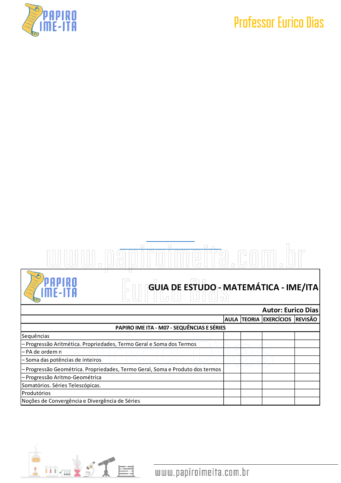 <p>P</p><p>ág</p><p>in</p><p>a</p><p>1</p><p>Coletânea de questões classificadas por tópicos</p><p>Vestibulares IME e ITA - 1990 a 2020</p><p>Matemática</p><p>M07 – Sequências e Séries</p><p>Versão 2.0 da lista (janeiro de 2022)</p><p>Olá a todos!</p><p>Meu nome é Eurico Dias, sou professor de Turmas IME ITA há quase 20 anos e estou disponibilizando esse</p><p>material inédito e gratuito com questões selecionadas de 30 anos de provas do ITA e IME (1990 a 2020),</p><p>proporcionando para alunos e professores interessados uma forma de testar e treinar seus estudos.</p><p>Logo abaixo coloquei um pequeno guia de estudo sobre os principais tópicos teóricos que considero necessário</p><p>para facilitar a resolução das questões a seguir. Utilize como uma espécie de checklist durante sua preparação:</p><p>marcando quando você estudou o material (sozinho ou em aula), fechou a parte teórica, fez exercícios e, se necessário,</p><p>revisou próximo da data do concurso.</p><p>Ah! Gostaria muito de saber das suas futuras conquistas e aprovações! Cada vitória dos meus alunos é a força</p><p>que motiva todo meu trabalho como professor e educador. Aguardo sua mensagem!</p><p>Só o gagá salva!!!</p><p>(Gagá = gíria iteana para estudo sem noção de tempo e espaço)</p><p>Eurico Dias</p><p>eurico@gmail.com</p><p>http://www.instagram.com/euricodias/</p><p>Tópicos AULA TEORIA EXERCÍCIOS REVISÃO</p><p>Sequências</p><p>– Progressão Aritmética. Propriedades, Termo Geral e Soma dos Termos</p><p>– PA de ordem n</p><p>– Soma das potências de inteiros</p><p>– Progressão Geométrica. Propriedades, Termo Geral, Soma e Produto dos termos</p><p>– Progressão Aritmo-Geométrica</p><p>Somatórios. Séries Telescópicas.</p><p>Produtórios</p><p>Noções de Convergência e Divergência de Séries</p><p>GUIA DE ESTUDO - MATEMÁTICA - IME/ITA</p><p>Autor: Eurico Dias</p><p>PAPIRO IME ITA - M07 - SEQUÊNCIAS E SÉRIES</p><p>mailto:eurico@gmail.com</p><p>http://www.instagram.com/euricodias/</p><p>P</p><p>ág</p><p>in</p><p>a</p><p>2</p><p>I - Questões Objetivas</p><p>M07-E01 (ITA 1999/2000) O valor de n que torna a sequência</p><p>2 + 3n, –5n, 1 – 4n</p><p>uma progressão aritmética pertence ao intervalo:</p><p>A) [-2, -1]</p><p>B) [-1, 0]</p><p>C) [0. 1]</p><p>D) [1, 2]</p><p>E) [2, 3]</p><p>M07-E02 (ITA 1992/1993) Numa progressão aritmética com 2n + 1 termos, a soma dos n primeiros é igual</p><p>a 50 e a soma dos n últimos é 140. Sabendo-se que a razão desta progressão é um inteiro entre 2 e 13,</p><p>então seu último termo será igual a:</p><p>A) 34</p><p>B) 40</p><p>C) 42</p><p>D) 48</p><p>E) 56</p><p>M07-E03 (IME 2008/2009) É dada uma PA de razão r. Sabe-se que o quadrado de qualquer número par x,</p><p>x > 2, pode ser expresso como a soma dos n primeiros termos desta PA, onde n é igual à metade de x. O</p><p>valor de r é:</p><p>A) 2</p><p>B) 4</p><p>C) 8</p><p>D) 10</p><p>E) 16</p><p>M07-E04 (ITA 2009/2010) Considere a progressão aritmética (a1, a2, ..., a50) de razão d. Se</p><p>10</p><p>n</p><p>n 1</p><p>a</p><p>=</p><p> = 10 + 25d e</p><p>50</p><p>n</p><p>n 1</p><p>a</p><p>=</p><p> = 4550,</p><p>então d – a1 é igual a</p><p>A) 3</p><p>B) 6</p><p>C) 9</p><p>D) 11</p><p>P</p><p>ág</p><p>in</p><p>a</p><p>3</p><p>E) 14</p><p>M07-E05 (ITA 2011/2012) Sabe-se que (x + 2y, 3x - 5y, 8x - 2y, 11x - 7y + 2z) é uma progressão aritmética</p><p>com o último termo igual a -127. Então, o produto xyz é igual a</p><p>A) - 60</p><p>B) - 30</p><p>C) 0</p><p>D) 30</p><p>E) 60</p><p>M07-E06 (IME 2006/2007) Um quadrado de lado igual a um metro é dividido em quatro quadrados idênticos.</p><p>Repete-se esta divisão com os quadrados obtidos e assim sucessivamente por n vezes. A figura abaixo</p><p>ilustra as quatro primeiras etapas desse processo. Quanto →n , a soma em metros dos perímetros dos</p><p>quadrados hachurados em todas as etapas é:</p><p>A) 4</p><p>B) 6</p><p>C) 8</p><p>D) 10</p><p>E) 12</p><p>M07-E07 (ITA 1997/1998) Seja (a1 , a2 , a3 ,...) uma progressão geométrica infinita de razão a1, 0 < a1 < 1, e</p><p>soma igual a 3a1. A soma dos três primeiros termos desta progressão geométrica é:</p><p>A)</p><p>8</p><p>27</p><p>B)</p><p>20</p><p>27</p><p>P</p><p>ág</p><p>in</p><p>a</p><p>4</p><p>C)</p><p>26</p><p>27</p><p>D)</p><p>30</p><p>27</p><p>E)</p><p>38</p><p>27</p><p>M07-E08 (ITA 1994/1995) Se a soma dos termos da progressão geométrica dada por 0,3 : 0,03 : 0,003 : ...</p><p>é igual ao termo médio de uma progressão aritmética de três termos, então a soma dos termos da</p><p>progressão aritmética vale:</p><p>A) 1/3</p><p>B) 2/3</p><p>C) 1</p><p>D) 2</p><p>E) 1/2</p><p>M07-E09 (ITA 1989/1990) Numa progressão geométrica de três termos a razão é e – 2a, a soma dos termos</p><p>é 7 enquanto que a diferença do último termo com o primeiro é 3. Nestas condições o valor de a é:</p><p>A) ln 2</p><p>B) – ln</p><p>2</p><p>5</p><p>C) ln 3</p><p>D) – ln 2</p><p>E) não existe número real a nestas condições</p><p>M07-E10 (ITA 1993/1994) Seja (a1, a2, ...., an) uma progressão geométrica com um número ímpar de</p><p>termos e razão q > 0. O produto de seus termos é igual a 225 e o termo do meio é 25. Se a soma dos (n - 1)</p><p>primeiros termos é igual a 2(1 + q)(1 + q2), então:</p><p>A) a1 + q = 16</p><p>B) a1 + q = 12</p><p>C) a1 + q = 10</p><p>D) a1 + q + n = 20</p><p>E) a1 + q + n = 11</p><p>M07-E11 (IME 2019/2020) Considere a progressão geométrica 𝑎1,𝑎2,⋯,𝑎𝑛,⋯ e a progressão</p><p>aritmética 𝑏1,𝑏2,⋯,𝑏𝑛,⋯ com as condições:</p><p>𝑎1 > 0;</p><p>P</p><p>ág</p><p>in</p><p>a</p><p>5</p><p>2</p><p>1</p><p>1</p><p>a</p><p>a</p><p> ; e</p><p>𝑏2 − 𝑏1 > 0</p><p>Para que [log(𝑎𝑛)− 𝑏𝑛] não dependa de n, o valor de deverá ser:</p><p>A)</p><p>2</p><p>1</p><p>2</p><p>1</p><p>ba</p><p>a</p><p> </p><p> </p><p> </p><p>B)</p><p>1</p><p>1</p><p>2</p><p>1</p