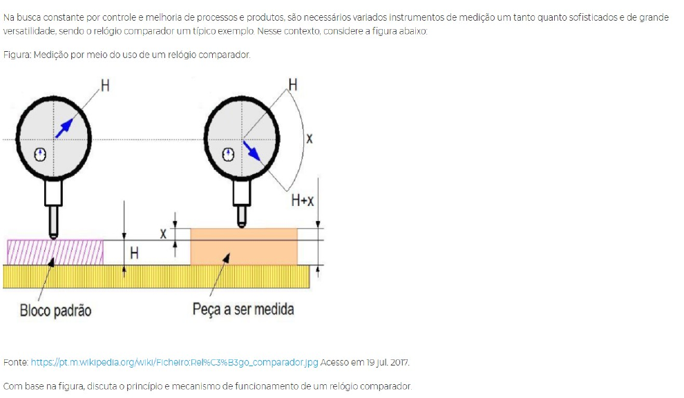 <p>Princípio de funcionamento do relógio comparador</p><p>O relógio comparador é um instrumento de medição por comparação, como o próprio nome diz, podendo ser analógico ou digital. A técnica de medição por comparação consiste em determinar a diferença da grandeza a qual se quer medir e um padrão de dimensão pré-determinado (na imagem, representado pelo bloco padrão. Portanto, se trata de uma técnica de medição indireta.</p><p>O princípio de funcionamento consiste em um mecanismo que transforma o deslocamento de uma ponta de contato (o x da figura) em um movimento axial, que é transmitido ao mostrador, onde pode ser realizada a leitura da dimensão. A ponta de contato, quando deslocada, move um sistema de engrenagens que amplifica mecanicamente a grandeza medida, acionando um ponteiro indicador no mostrador. Quando o ponteiro se move em sentido horário, a diferença em relação ao bloco padrão, é positivo. Se o ponteiro girar em sentido anti-horário, a diferença será negativa, ou seja, a peça apresenta menor dimensão que a estabelecida.</p><p>O relógio comparador é muito utilizado para averiguar deslocamentos que dificilmente seriam vistos a olho nu. Isto se deve ao mecanismo de amplificação mencionado anteriormente, que torna uma volta completa do ponteiro correspondente a um deslocamento de 1 mm da ponta de contato. Na amplificação por engrenagens, as diferenças de grandeza que acionam o ponto de contato são amplificadas mecanicamente. A ponta de contato move o fuso que possui uma cremalheira, que aciona um trem de engrenagens que, por sua vez, aciona um ponteiro indicador no mostrador. Além deste método, existem relógios comparadores que utilizam o método de amplificação por alavanca.</p><p>image1.png</p>