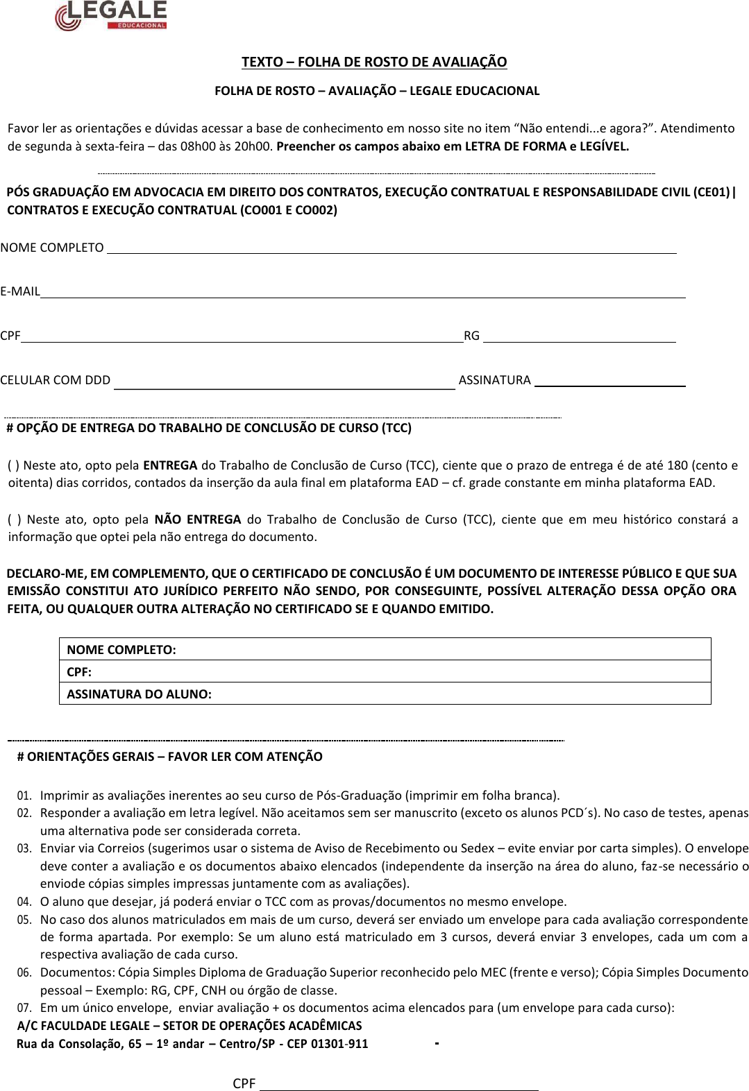 <p>CPF</p><p>TEXTO – FOLHA DE ROSTO DE AVALIAÇÃO</p><p>FOLHA DE ROSTO – AVALIAÇÃO – LEGALE EDUCACIONAL</p><p>Favor ler as orientações e dúvidas acessar a base de conhecimento em nosso site no item “Não entendi...e agora?”. Atendimento</p><p>de segunda à sexta-feira – das 08h00 às 20h00. Preencher os campos abaixo em LETRA DE FORMA e LEGÍVEL.</p><p>PÓS GRADUAÇÃO EM ADVOCACIA EM DIREITO DOS CONTRATOS, EXECUÇÃO CONTRATUAL E RESPONSABILIDADE CIVIL (CE01)|</p><p>CONTRATOS E EXECUÇÃO CONTRATUAL (CO001 E CO002)</p><p>NOME COMPLETO</p><p>E-MAIL</p><p>CPF RG</p><p>CELULAR COM DDD ASSINATURA</p><p># OPÇÃO DE ENTREGA DO TRABALHO DE CONCLUSÃO DE CURSO (TCC)</p><p>( ) Neste ato, opto pela ENTREGA do Trabalho de Conclusão de Curso (TCC), ciente que o prazo de entrega é de até 180 (cento e</p><p>oitenta) dias corridos, contados da inserção da aula final em plataforma EAD – cf. grade constante em minha plataforma EAD.</p><p>( ) Neste ato, opto pela NÃO ENTREGA do Trabalho de Conclusão de Curso (TCC), ciente que em meu histórico constará a</p><p>informação que optei pela não entrega do documento.</p><p>DECLARO-ME, EM COMPLEMENTO, QUE O CERTIFICADO DE CONCLUSÃO É UM DOCUMENTO DE INTERESSE PÚBLICO E QUE SUA</p><p>EMISSÃO CONSTITUI ATO JURÍDICO PERFEITO NÃO SENDO, POR CONSEGUINTE, POSSÍVEL ALTERAÇÃO DESSA OPÇÃO ORA</p><p>FEITA, OU QUALQUER OUTRA ALTERAÇÃO NO CERTIFICADO SE E QUANDO EMITIDO.</p><p>NOME COMPLETO:</p><p>CPF:</p><p>ASSINATURA DO ALUNO:</p><p># ORIENTAÇÕES GERAIS – FAVOR LER COM ATENÇÃO</p><p>01. Imprimir as avaliações inerentes ao seu curso de Pós-Graduação (imprimir em folha branca).</p><p>02. Responder a avaliação em letra legível. Não aceitamos sem ser manuscrito (exceto os alunos PCD´s). No caso de testes, apenas</p><p>uma alternativa pode ser considerada correta.</p><p>03. Enviar via Correios (sugerimos usar o sistema de Aviso de Recebimento ou Sedex – evite enviar por carta simples). O envelope</p><p>deve conter a avaliação e os documentos abaixo elencados (independente da inserção na área do aluno, faz-se necessário o</p><p>enviode cópias simples impressas juntamente com as avaliações).</p><p>04. O aluno que desejar, já poderá enviar o TCC com as provas/documentos no mesmo envelope.</p><p>05. No caso dos alunos matriculados em mais de um curso, deverá ser enviado um envelope para cada avaliação correspondente</p><p>de forma apartada. Por exemplo: Se um aluno está matriculado em 3 cursos, deverá enviar 3 envelopes, cada um com a</p><p>respectiva avaliação de cada curso.</p><p>06. Documentos: Cópia Simples Diploma de Graduação Superior reconhecido pelo MEC (frente e verso); Cópia Simples Documento</p><p>pessoal – Exemplo: RG, CPF, CNH ou órgão de classe.</p><p>07. Em um único envelope, enviar avaliação + os documentos acima elencados para (um envelope para cada curso):</p><p>A/C FACULDADE LEGALE – SETOR DE OPERAÇÕES ACADÊMICAS</p><p>Rua da Consolação, 65 – 1º andar – Centro/SP - CEP 01301-911</p><p>- 06347054310</p><p>CPF</p><p>A partir de 11/12/23, não teremos mais atendimento presencial na Secretaria da Faculdade Legale. A entrega de avaliações</p><p>deverá ser feita através dos Correios, utilizando a Caixa Postal abaixo:</p><p>Caixa Postal: 77454</p><p>CEP 01314-971</p><p>Para atendimento, favor entrar em contato através do e-mail: contato@falegale.edu.br</p><p>08. PRAZO DE ENTREGA DA AVALIAÇÃO: consultar a grade curricular na Plataforma EAD – a qual contém todas as datas oficiais</p><p>em relação ao seu curso.</p><p>09. A avaliação ao ser recebida pela Faculdade Legale, o aluno será informado por e-mail, no prazo de 03 (três) dias úteis.</p><p>Recomendamos sempre consultar o lixo eletrônico/spam.</p><p>10. O prazo de correção da avaliação é de até 30 (trinta) dias úteis, contados a partir do recebimento. O aluno que optou</p><p>pela NÃO entrega do TCC, automaticamente passará a fase de emissão do certificado de pós, após frequência de 75% nas</p><p>aulas e obtenção de média igual ou superior a 7,0 (sete) em todas as disciplinas do curso. O aluno que eventualmente não</p><p>obter a média</p><p>será contatrealização de uma avaliação substitutiva através do e-mail informando nesta folha.</p><p>11. No momento em que o Certificado Digital de Conclusão for emitido, o aluno receberá um comunicado via e-mail. Neste</p><p>mesmo comunicado, o aluno receberá as instruções caso opte por receber a via física do Certificado. Para visualizar o</p><p>Certificadodigital, basta acessar com login e senha o Portal Acadêmico do Aluno. Cabe destacar que TODA ESTA EVOLUÇÃO DE</p><p>RECEBIMENTO, CORREÇÃO E CERTIFICAÇÃO DEVERÁ SER ACOMPANHADA VIA ÁREA DO ALUNO – NO ITEM ACADÊMICO.</p><p>12. Aos alunos PCD´s, favor entrar em contato com a Faculdade Legale para maiores</p><p>orientações.</p><p>PÓS-GRADUAÇÃO EM ADVOCACIA EM DIREITO DOS CONTRATOS, EXECUÇÃO</p><p>CONTRATUAL E RESPONSABILIDADE CIVIL</p><p>1- Carlos e Maria celebraram um contrato de prestação de serviços de consultoria empresarial. O contrato continha</p><p>cláusulas específicas sobre os serviços a serem prestados, mas não mencionava nada sobre a remuneração a ser paga</p><p>a Carlos. Após a celebração do contrato, Carlos começou a prestar os serviços à Maria.</p><p>Considerando o Código Civil e suas disposições sobre a interpretação dos negócios jurídicos, qual dos seguintes</p><p>critérios deve ser utilizado para interpretar o contrato em relação à questão da remuneração de Carlos?</p><p>a) O contrato não pode ser interpretado, pois não mencionou a remuneração de Carlos, e não existem critérios</p><p>aplicáveis a esse caso.</p><p>b) O contrato deve ser interpretado de acordo com os usos, costumes e práticas do mercado de consultoria</p><p>empresarial.</p><p>c) O contrato deve ser interpretado de forma a beneficiar Maria, já qu