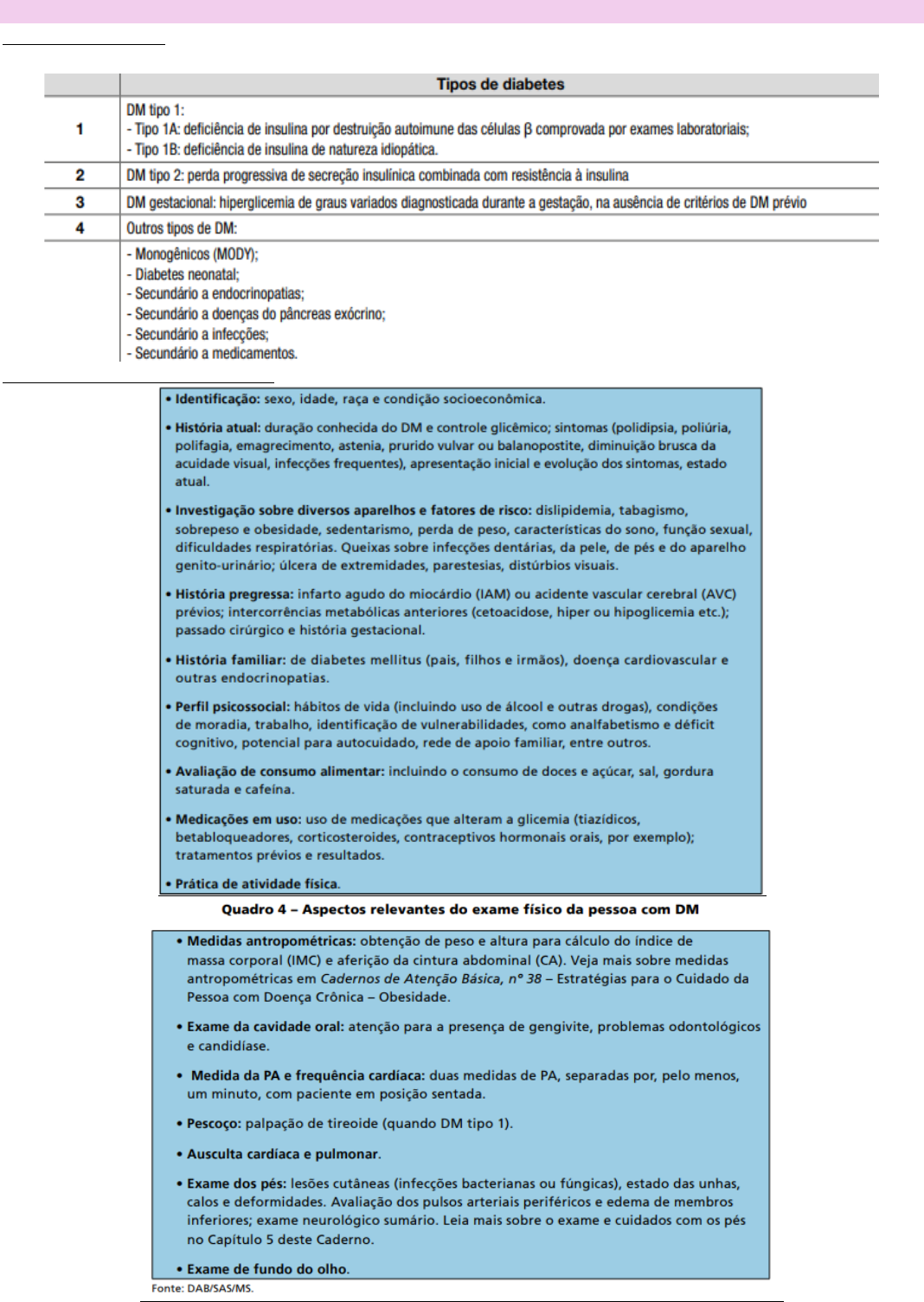 <p>DIABETES:</p><p>CLASSIFICAÇÃO:</p><p>ANAMNESE E EXAME FÍSICO:</p><p>DIAGNÓSTICO:</p><p>ATENÇÃO BÁSICA:</p><p>RASTREAMENTO:</p><p>ATENÇÃO BÁSICA:</p><p>FATORES DE RISCO:</p><p>MANEJO NO JOVEM:</p><p>• Síndrome hiper osmolar hiperglicêmica: alta desidratação e confusão.</p><p>SINTOMATOLOGIA:</p><p>3 Ps: Polidpsia, polifagia e poliúria.</p><p>HIPOGLICEMIA:</p><p>TRATAMENTO:</p><p>ATENÇÃO BÁSICA:</p><p>• 1 LINHA: Se a pessoa não alcançar a meta glicêmica em até três meses com as medidas</p><p>não farmacológicas, o tratamento preferencial é acrescentar a metformina.</p><p>• 2 LINHA: Se as metas de controle não forem alcançadas após três a seis meses de uso de</p><p>metformina, pode-se associar uma sulfonilureia [GRADE B]. As sulfonilureias também podem</p><p>ser utilizadas como primeira escolha quando há perda de peso e teores glicêmicos mais</p><p>elevados, indicando secreção insuficiente de insulina (BRASIL, 2010). A prescrição da</p><p>sulfonilureia como segunda medicação baseia-se na longa experiência com seu uso [GRADE</p><p>D]. As sulfonilureias exercem sua principal função sobre as células beta, estimulando a</p><p>secreção de insulina e reduzindo o nível plasmático de glicose</p><p>• 3 LINHA: Se o controle metabólico não for alcançado após o uso de metformina em</p><p>associação com uma sulfonilureia por três a seis meses, deve ser considerada uma terceira</p><p>medicação. A insulina também é considerada quando os níveis de glicose plasmática</p><p>estiverem maiores de 300 mg/dL, na primeira avaliação ou no momento do diagnóstico,</p><p>principalmente se acompanhado de perda de peso, cetonúria e cetonemia</p><p>CONDUTA:</p><p>Metformina: primeira opção de tratamento- para indivíduo hígido.</p><p>METAS</p>