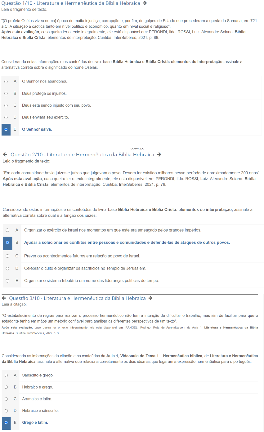 <p>Questão 1/10 Literatura e Hermenêutica da Bíblia Hebraica Leia o fragmento de texto: "[O profeta Oséias viveu época de muita injustiça, corrupção e, por fim, de golpes de Estado que precederam a queda da Samaria, em 721 a.C. A situação é caótica tanto em nível político e econômico, quanto em nível social e Após esta avaliação, caso queira ler o texto integralmente, ele está disponível em: PERONDI, ROSSI, Luiz Alexandre Solano. Bíblia Hebraica e Bíblia Cristã: elementos de interpretação. Curitiba: InterSaberes, 2021, p. 86. Considerando estas informações e os conteúdos do livro-base Bíblia Hebraica e Bíblia Cristã: elementos de interpretação, assinale a alternativa correta sobre o significado do nome Oséias: A Senhor nos B Deus protege os injustos. C Deus está sendo injusto com seu povo. Deus enviará seu exército. E Senhor salva. Questão 2/10 Literatura e Hermenêutica da Bíblia Hebraica Leia fragmento de texto: "Em cada comunidade havia juízes e juízas que julgavam o povo. Devem ter existido milhares nesse período de aproximadamente 200 anos". Após esta avaliação, caso queira ler o texto integralmente, ele está disponível em: PERONDI, ROSSI, Luiz Alexandre Solano. Bíblia Hebraica e Bíblia Cristã: elementos de interpretação. Curitiba: InterSaberes, 2021, p. 76. Considerando estas informações e os conteúdos do livro-base Bíblia Hebraica e Bíblia Cristã: elementos de interpretação, assinale a alternativa correta sobre qual é a função dos juízes: A Organizar o exército de Israel nos momentos em que este era ameaçado pelos grandes impérios. B Ajudar a solucionar os conflitos entre pessoas e comunidades e defende-las de ataques de outros povos. C Prever os acontecimentos futuros em relação ao povo de Israel. D Celebrar o culto e organizar os sacrifícios no Templo de E Organizar sistema tributário em nome das lideranças políticas do tempo. Questão 3/10 - Literatura e Hermenêutica da Bíblia Hebraica Leia a citação: "O estabelecimento de regras para realizar o processo hermenêutico não tem a intenção de dificultar o trabalho, mas sim de facilitar para que o estudante tenha em mãos um método confiável para analisar as diferentes perspectivas de um texto". Após esta avaliação, caso queira ler texto integralmente, ele está disponível em: Rota de Aprendizagem da Aula 1. Literatura e Hermenêutica da Biblia Curitiba InterSaberes 2022 p Considerando as informações da citação e os conteúdos da Aula 1, Videoaula do Tema 1 Hermenêutica bíblica, de Literatura e Hermenêutica da Bíblia Hebraica, assinale a alternativa que relaciona corretamente os dois idiomas que legaram a expressão hermenêutica para o A Sânscrito e grego. B Hebraico e grego. C Aramaico e latim. D Hebraico e E Grego latim.</p><p>Questão 4/10 - Literatura e Hermenêutica da Bíblia Hebraica Leia o extrato de texto: "A liturgia e os cultos judaicos, com apresentação de e holocaustos, eram realizados no único Templo em Jerusalém, pelos sacerdotes e levitas". Após esta avaliação, caso queira ler texto integralmente, ele está disponível em: PERONDI, ROSSI, Luiz Alexandre Solano. Bíblia Hebraica e Bíblia Cristã: elementos de interpretação. Curitiba: InterSaberes, 2021, p. 17. Considerando estas informações e os conteúdos do livro-base Bíblia Hebraica e Bíblia Cristã: elementos de interpretação, o primeiro Templo de Jerusalém foi construído aproximadamente mil anos antes de Cristo em qual período? Assinale a alternativa correta: A De Salomão, rei de Israel. B De Nabucodonosor, rei da De considerado pai na fé. De Moisés, mediador da libertação da E De Saul, rei de Israel. Questão 5/10 - Literatura e Hermenêutica da Bíblia Hebraica Atente para a afirmação: "A Bíblia Hebraica, enquanto texto escrito, surgiu com o desenvolvimento da escrita e das línguas semitas (hebraico, aramaico, árabe, fenício, acádico, ugarítico, siríaco etc.), além de outros idiomas de povos da época que também tiveram influência [...]". Após esta avaliação, caso queira ler o texto integralmente, ele está disponível em: PERONDI, ROSSI, Luiz Alexandre Solano. Bíblia Hebraica e Bíblia Cristã: elementos de interpretação. Curitiba: InterSaberes, 2021, p. 29. Considerando estas informações e os conteúdos do livro-base Bíblia Hebraica e Bíblia Cristã: elementos de interpretação, sobre a língua hebraica, assinale a alternativa correta: A Diferencia as letras maiúsculas e minúsculas como a maioria das línguas B Nasceu no contexto da cultura grega. É composta apenas por vogais. D Foi usada apenas na redação do Novo E Foi usada para escrever livros do Antigo Testamento e sua escrita foi feita apenas com as consoantes. Questão 6/10 Literatura e Hermenêutica da Bíblia Hebraica Leia a seguinte informação: "O Tanakh é derivado das palavras Torá [...], Neviim [...], e Ketuvim [...], que formavam os três blocos da Bíblia Após esta avaliação, caso queira ler o texto integralmente, ele está disponível em: PERONDI, ROSSI, Luiz Alexandre Solano. Bíblia Hebraica e Bíblia elementos de interpretação. Curitiba: InterSaberes, p. 34.</p><p>Considerando estas informações e os conteúdos do livro-base Bíblia Hebraica e Bíblia Cristã: elementos de interpretação, relacione corretamente os seguintes elementos às suas respectivas descrições: 1. A Torá (Lei) 2. Os Neviim (Profetas) 3. Os Ketuvim (Escritos) ( ) este bloco é composto pelos livros da Lei que formam o primeiro bloco da Bíblia. ( ) este bloco é composto pelos livros: Salmos, Jó, Provérbios, Rute, Cântico dos Cânticos, Eclesiastes, Ester, Daniel, Esdras, 1 e 2 Crônicas. ( ) este bloco é composto pelos livros: Josué, 1 e 2 Samuel, 1 e 2 Reis, Isaías, Jeremias, Ezequiel, Oseias, Joel, Amós, Abdias, Jonas, Miqueias, Naum, Habacuc, Sofonias, Ageu, Zacarias e Malaquias. Agora, selecione a alternativa que apresenta a sequência correta: A 2-