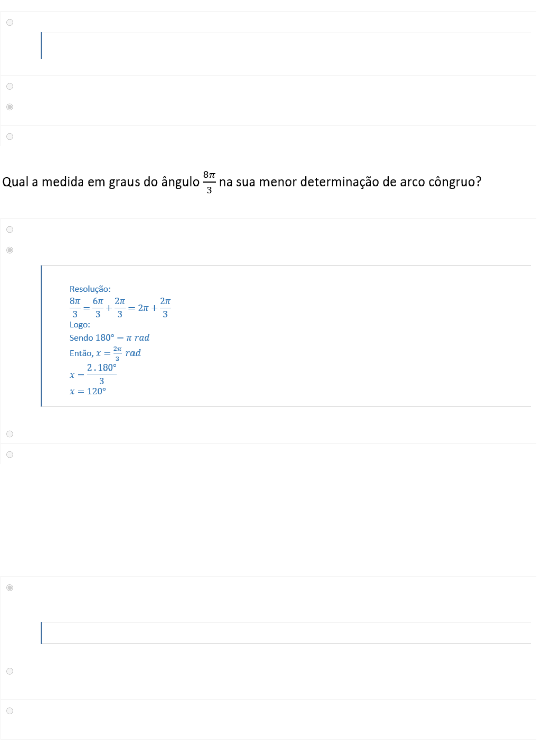 <p>Questão 1/10 - Pré-Cálculo</p><p>Classifique, em relação ao maior ângulo, o triângulo formado pelos lados de medidas</p><p>13cm, 15cm, e 17cm.</p><p>Nota: 0.0 Você não pontuou essa questão</p><p>A Acutângulo ou agudo</p><p>B Isósceles</p><p>C Retângulo</p><p>Você assinalou essa alternativa (C)</p><p>D Equilátero</p><p>Questão 2/10 - Pré-Cálculo</p><p>.</p><p>Nota: 10.0</p><p>A 60°</p><p>B 120°</p><p>Você assinalou essa alternativa (B)</p><p>C 90º</p><p>D 240º</p><p>Questão 3/10 - Pré-Cálculo</p><p>Calcule a soma das matrizes A + B, sendo que</p><p>Matriz A uma quadrada 2x2:</p><p>Na primeira linha -1 e 3</p><p>Na segunda linha -1 e 0</p><p>Matriz B uma quadrada 2x2:</p><p>Na primeira linha 2 e 3</p><p>Na segunda linha -1 e 2</p><p>Nota: 10.0</p><p>A Matriz A+B=</p><p>Na primeira linha 1 e 6</p><p>Na segunda linha -2 e 2</p><p>Você assinalou essa alternativa (A)</p><p>B Matriz A+B=</p><p>Na primeira linha 0 e 6</p><p>Na segunda linha 2 e 2</p><p>C Matriz A+B=</p><p>Na primeira linha 1 e 2</p><p>Na segunda linha 0 e 2</p><p>Verificando usando o Teorema de Pitágoras, verifica-se que trata-se de um triângulo agudo, pois o quadrado da suposta</p><p>hipotenusa (maior lado) é menor que a soma do quadrado dos demais lados.</p><p>Você acertou!</p><p>.</p><p>Você acertou!</p><p>D Matriz A+B=</p><p>Na primeira linha 1 e -2</p><p>Na segunda linha 0 e 2</p><p>Questão 4/10 - Pré-Cálculo</p><p>Calcule o determinante da matriz quadrada 2x2 com termos:</p><p>Na primeira linha -1 e 3</p><p>Na segunda linha -1 e 0</p><p>Nota: 10.0</p><p>A 2</p><p>B 1</p><p>C 7</p><p>D 3</p><p>Você assinalou essa alternativa (D)</p><p>Questão 5/10 - Pré-Cálculo</p><p>Calcule o valor da tangente de 3 Pi sobre 4.</p><p>Nota: 10.0</p><p>A -1</p><p>Você assinalou essa alternativa (A)</p><p>B 1</p><p>C 1/2</p><p>D 0</p><p>Questão 6/10 - Pré-Cálculo</p><p>Transforme 144° em radianos:</p><p>Nota: 10.0</p><p>A 4 pi dividido por 5</p><p>Você assinalou essa alternativa (A)</p><p>B 3 pi dividido por 5</p><p>C 4 pi dividido por 3</p><p>D pi dividido por 5</p><p>Questão 7/10 - Pré-Cálculo</p><p>Qual é o ângulo agudo formado entre os ponteiros do relógio quando é marcada a hora 13h e 15 minutos?</p><p>Nota: 10.0</p><p>A 52,5°</p><p>Você assinalou essa alternativa (A)</p><p>Você acertou!</p><p>Multiplicando os elementos da diagonal principal -1 e 0, temos 0.</p><p>Multiplicando e invertendo o sinal dos elementos da diagonal secundária -1 e 3, temos 3.</p><p>Portanto, somando esses resultados o e 3, temos a resposta 3.</p><p>Você acertou!</p><p>Resolução:</p><p>Usando uma calculadora científica, a tangente de 3 pi sobre 4 é -1</p><p>Você acertou!</p><p>Resolução:</p><p>Usando uma regra de três onde 180 graus é equivalente a Pi radianos, temos então a relação:</p><p>180 graus está para pi radianos assim como 144 graus está para alfa.</p><p>Desta forma temos que 180 multiplicando alfa é igual a 144 multiplicando Pi.</p><p>Portanto, isolando alfa, isto é passando o 180 dividindo o 144, teremos, por através de simplificações o resultado que alfa vale 4 pi</p><p>dividido por 5.</p><p>Você acertou!</p><p>B 30°</p><p>C 45°</p><p>D 0º</p><p>Questão 8/10 - Pré-Cálculo</p><p>Classifique, em relação aos lados, o triângulo formado pelos lados de medidas 12cm, 15cm e 20cm.</p><p>Nota: 10.0</p><p>A As medidas apresentadas não formam um triângulo.</p><p>B Triângulo equilátero</p><p>C Triângulo escaleno</p><p>Você assinalou essa alternativa (C)</p><p>D Triângulo isósceles</p><p>Questão 9/10 - Pré-Cálculo</p><p>Nota: 10.0</p><p>A</p><p>Você assinalou essa alternativa (A)</p><p>Você acertou!</p><p>Como o triângulo apresentado tem todos os lados diferentes entre si ele é classificado como um triângulo escaleno.</p><p>Você acertou!</p><p>B</p><p>C</p><p>D</p><p>Questão 10/10 - Pré-Cálculo</p><p>Nota: 0.0 Você não pontuou essa questão</p><p>A</p><p>B</p><p>C</p><p>D</p><p>Você assinalou essa alternativa (D)</p>