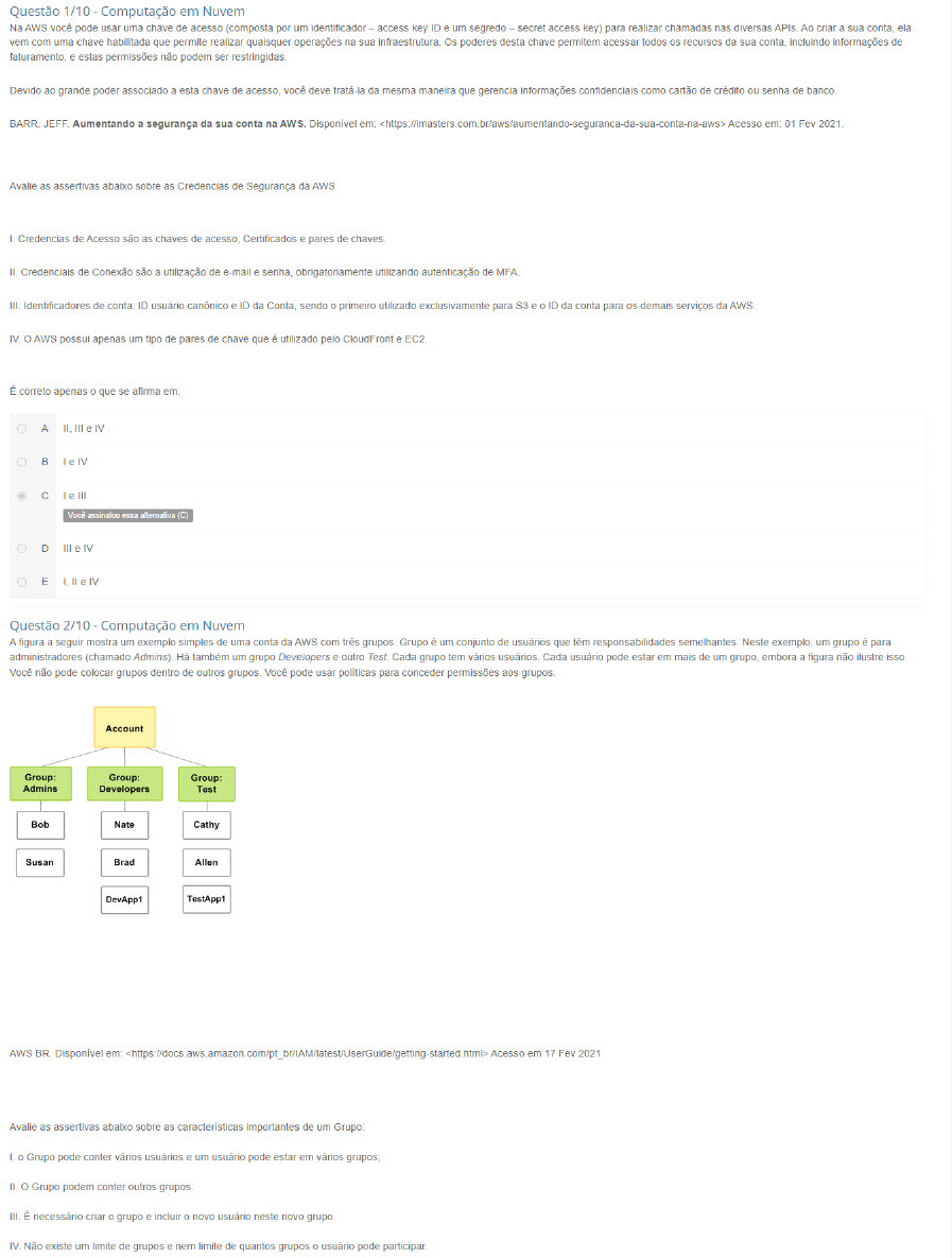 <p>Questão 1/10 - Computação em Nuvem Na AWS você pode usar uma chave de acesso (composta por um identificador access key ID e um segredo - secret access key) para realizar chamadas nas diversas APIs. Ao criar a sua conta, ela vem com uma chave habilitada que permite realizar quaisquer operações na sua Os poderes desta chave permitem acessar todos os recursos da sua conta, incluindo informações de faturamento, e estas permissões não podem ser restringidas. Devido ao grande poder associado a esta chave de acesso, você deve da mesma maneira que gerencia informações confidenciais como cartão de crédito ou senha de banco. BARR, Aumentando a segurança da sua conta na AWS. Disponível em: 01 Fev 2021. Avalie as assertivas abaixo sobre as Credencias de Segurança da AWS I. Credencias de Acesso são as chaves de acesso, Certificados e pares de II. Credenciais de Conexão são a utilização de e-mail e senha, obrigatoriamente utilizando autenticação de III. Identificadores de conta: ID usuário canônico e ID da Conta, sendo primeiro utilizado exclusivamente para S3 e ID da conta para os demais serviços da AWS. IV. AWS possui apenas um tipo de pares de chave que é utilizado pelo CloudFront e EC2. É correto apenas que se afirma em: A II, III e IV B I IV C e III Você assinalou essa alternativa (C) D III IV E Questão 2/10 - Computação em Nuvem A figura a seguir mostra um exemplo simples de uma conta da AWS com três grupos. Grupo é um conjunto de usuários que têm responsabilidades semelhantes. Neste exemplo, um grupo é para administradores (chamado Admins). Há também um grupo Developers e outro Test. Cada grupo tem vários Cada usuário pode estar em mais de um grupo, embora a figura não ilustre isso. Você não pode colocar grupos dentro de outros grupos. Você pode usar políticas para conceder permissões aos grupos. Account Group: Group: Group: Admins Developers Test Bob Nate Cathy Susan Brad Allen DevApp1 TestApp1 AWS BR. Disponível em 17 Fev 2021 Avalie as assertivas abaixo sobre as características importantes de um Grupo: I. Grupo pode conter vários usuários e um usuário pode estar em vários grupos; II. Grupo podem conter outros grupos. III. É necessário criar grupo e incluir novo usuário neste novo grupo. IV. Não existe um limite de grupos e nem limite de quantos grupos usuário pode participar.</p><p>profissionais de tecnologia novas formas de trabalhar, revolucionando modelo tradicional até então praticado na Diante disso, destino do administrador de sistemas passou a ser encarado como uma ou seja, com tantas mudanças qual papel desse profissional no futuro da TI? As funções relacionadas a TI tradicional, que leva em conta a administração de sistemas, banco de dados e armazenamento, deixou de ser prioridade para empresas que buscam por profissionais de tecnologia no mercado Agora, a expectativa é de que as pessoas que trabalham nessa área consigam colocar em prática conceitos e tendências tecnológicas, como arquiteturas de software sem servidor, Internet das Coisas e Cloud Computing mas sem deixar de lado as habilidades de gerenciar tecnologias e infraestruturas Além disso, é preciso estar atento ao pleno funcionamento dos protocolos de uma vez que as soluções, principalmente aquelas baseadas na podem sofrer ameaças relacionadas à violação de ALEGAR Os desafios do administrador de sistemas no futuro da Disponível em: da-ti/> Acesso em 13 Dez 2020. Cada modelos de serviços oferecidos pela nuvem possuem dois atores principais: provedor e Provedor fornece os serviços e o consumidor consome os serviços. Em cada modelo de serviço a responsabilidade de cada ator é diferente. I. No modelo de serviço consumidor não administra ou controla a infraestrutura da nuvem subjacente, mas tem controle sobre os sistemas operacionais, armazenamento de aplicativos implantados, e os componentes de rede selecionados. II. No modelo de serviço consumidor não administra ou controla os recursos de infraestrutura da nuvem subjacente, tais como componente de rede, servidores, sistemas operacionais, ou Porém consumidor tem controle sobre os aplicativos utilizados na hospedagem de aplicativos e nas configurações de III. No modelo de serviço consumidor não administra ou controla a infraestrutura subjacente da que inclui componentes de sistemas operacionais, armazenamento ou capacidade de aplicação individual A possível exceção relaciona-se a algumas configurações específicas do usuário e de algumas configurações de aplicativos. Complete os espaços com os modelos de serviços correspondentes: A laaS B Paas, laaS C SaaS Você assinalou essa alternativa (C) D Paas E SaaS Questão 4/10 - Computação em Nuvem Toda máquina virtual (ou instância EC2) da AWS é criada a partir de uma imagem, que, no ecossistema AWS, chama-se AMI (Amazon Machine Image). Esta imagem contém softwares básicos já instalados. Você pode usar desde uma AMI disponibilizada pela Amazon, que vem com uma configuração mínima (basicamente, apenas o sistema operacional instalado), até AMI preparada por você, que já tem todos os requisitos para rodar a sua aplicação. Como publicar uma aplicação Web usando AWS. Disponível em: > Acesso em 19 Fev 2021. Avalie as assertivas abaixo sobre as Imagens de Máquina da Amazon (AMI): I. As imagens fornecem as informações que são necessárias para iniciar uma II. É possível a execução de várias instâncias em uma única AMI quando é necessários várias instâncias com as mesmas configurações. III. São incluídas dentro de uma AMI: apenas um snapshots do EBS ou modelo para volume raiz da instância, permissões de execução, onde indica quais contas podem utilizar e volumes a serem anexados à instância quando for executada. IV. Pode ser selecionado em uma AMI: região, Zona, sistema operacional e Arquitetura. É correto apenas o que se afirma em: A III IV B II III C Você assinalou essa alternativa (C) 