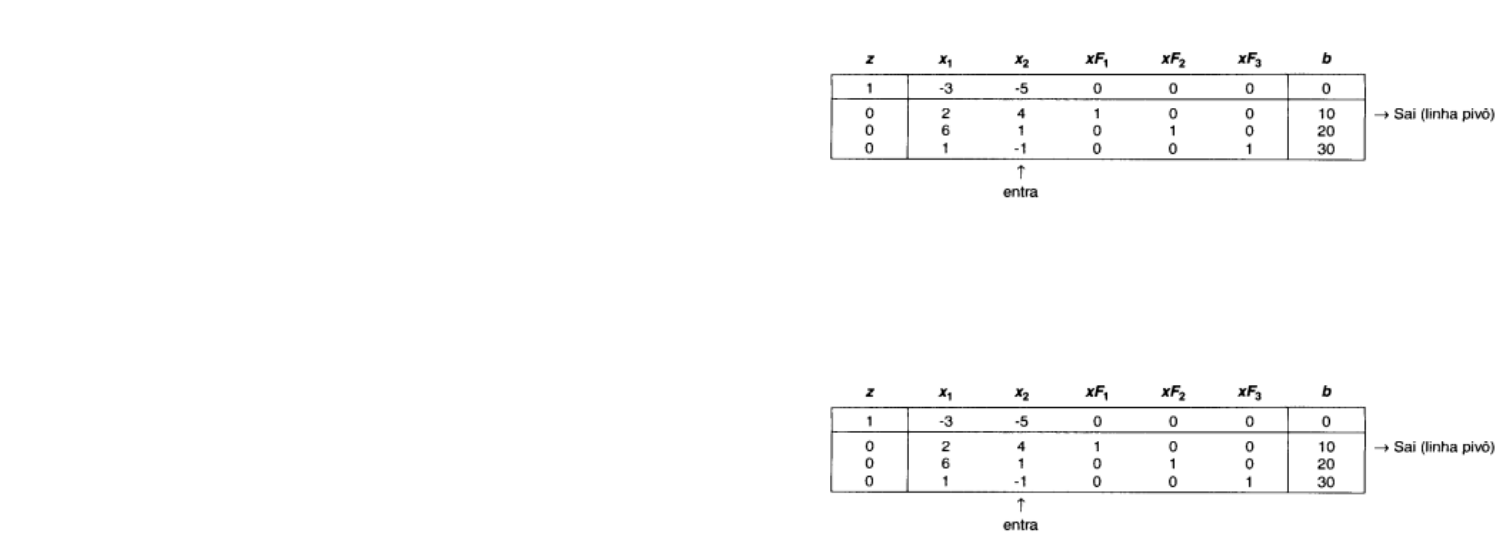 <p>MÉTODO SIMPLEX – PASSO A PASSO</p><p>1) Verificar se</p><p>- Função objetivo é maximizar</p><p>- As restrições são menores ou iguais.</p><p>- Restrições de Não negatividade maior ou igual a zero. Em programação</p><p>linear, as restrições de não negatividade são condições que exigem que as</p><p>variáveis de decisão assumam valores não negativos. Isso significa que as</p><p>variáveis não podem ser menores que zero.</p><p>Variáveis Básicas:</p><p>• Definição: São as variáveis que assumem valores positivos na solução</p><p>atual do problema, compondo a base do sistema de equações lineares.</p><p>• Número: O número de variáveis básicas é sempre igual ao número</p><p>de restrições no problema.</p><p>• Função: As variáveis básicas determinam o valor da função objetivo na</p><p>solução atual.</p><p>• Representação: Na tabela simplex, as variáveis básicas são representadas</p><p>pelas colunas da matriz identidade.</p><p>Variáveis Não Básicas:</p><p>• Definição: São as variáveis que assumem o valor zero na solução atual do</p><p>problema, não participando da base do sistema de equações.</p><p>• Número: O número de variáveis não básicas é igual à diferença entre o</p><p>número total de variáveis e o número de restrições.</p><p>• Função: As variáveis não básicas não influenciam o valor da função</p><p>objetivo na solução atual.</p><p>• Representação: Na tabela simplex, as variáveis não básicas são</p><p>representadas pelas colunas da matriz de coeficientes.</p><p>2) - Transformar a função objetivo igualando a zero.</p><p>- Igualar as restrições a zero, acrescentando as variáveis de folga (XF1, xF2, ...)</p><p>3) Montar a tabela na sequência: z, x1, x2, x3, xF1, xF2, xF3, b</p><p>4) Variável que ENTRA na base</p><p>- Entra na base a variável com coeficiente negativo de maior valor absoluto.</p><p>5) Variável que SAI</p><p>- Dividir os elementos independentes, na coluna b, com os respectivos</p><p>coeficientes positivos da variável que entra. Considerar a linha que possuir</p><p>o menor resultado positivo. O menor valor indica que a variável básica</p><p>dessa linha é a que primeiro se anula e sairá da base. Essa linha é também</p><p>chamada linha pivô. (NLP)</p><p>10 /4 = 2,5 CONSIDERAR O MENOR RESULTADO POSITIVO (Linha 1, veja</p><p>na tabela abaixo)</p><p>20/6 = 3,33</p><p>30/-1 = não considerar</p><p>6) Elemento PIVÔ</p><p>A coluna da variável que entra e a linha da variável que sai identificam</p><p>um elemento chamado PIVÔ. No exemplo, será o número 4.</p><p>7) Calculando a nova solução:</p><p>Exemplo</p><p>Dividimos a linha pivô pelo valor do elemento pivô, obtendo uma nova</p><p>linha com pivô unitário.</p><p>8) Reescrever cada uma das outras linhas:</p><p>a) Multiplicar os elementos da nova linha pivô pelo coeficiente da</p><p>variável que entra da outra linha, com sinal trocado.</p><p>b) Somar termo a termo com os elementos da outra linha.</p><p>A função objetivo na nova solução está escrita em termos das variáveis não</p><p>básicas x1 e xF1. As variáveis básicas têm coeficientes nulos.</p><p>A solução obtida tem z = 12,5, contra z = 0 da solução inicial. É melhor, mas ainda</p><p>NÃO É ÓTIMA, pois o coeficiente de x1 na função objetivo é negativo.</p><p>Então devemos fazer o cálculo da nova solução, até encontrarmos todos os</p><p>valores positivos na função objetivo.</p><p>A partir da nova tabela, procurar a solução ótima, fazendo todos os passos acima.</p><p>A solução será ÓTIMA, quando todos os valores da linha Z (função objetivo)</p><p>forem positivos.</p>